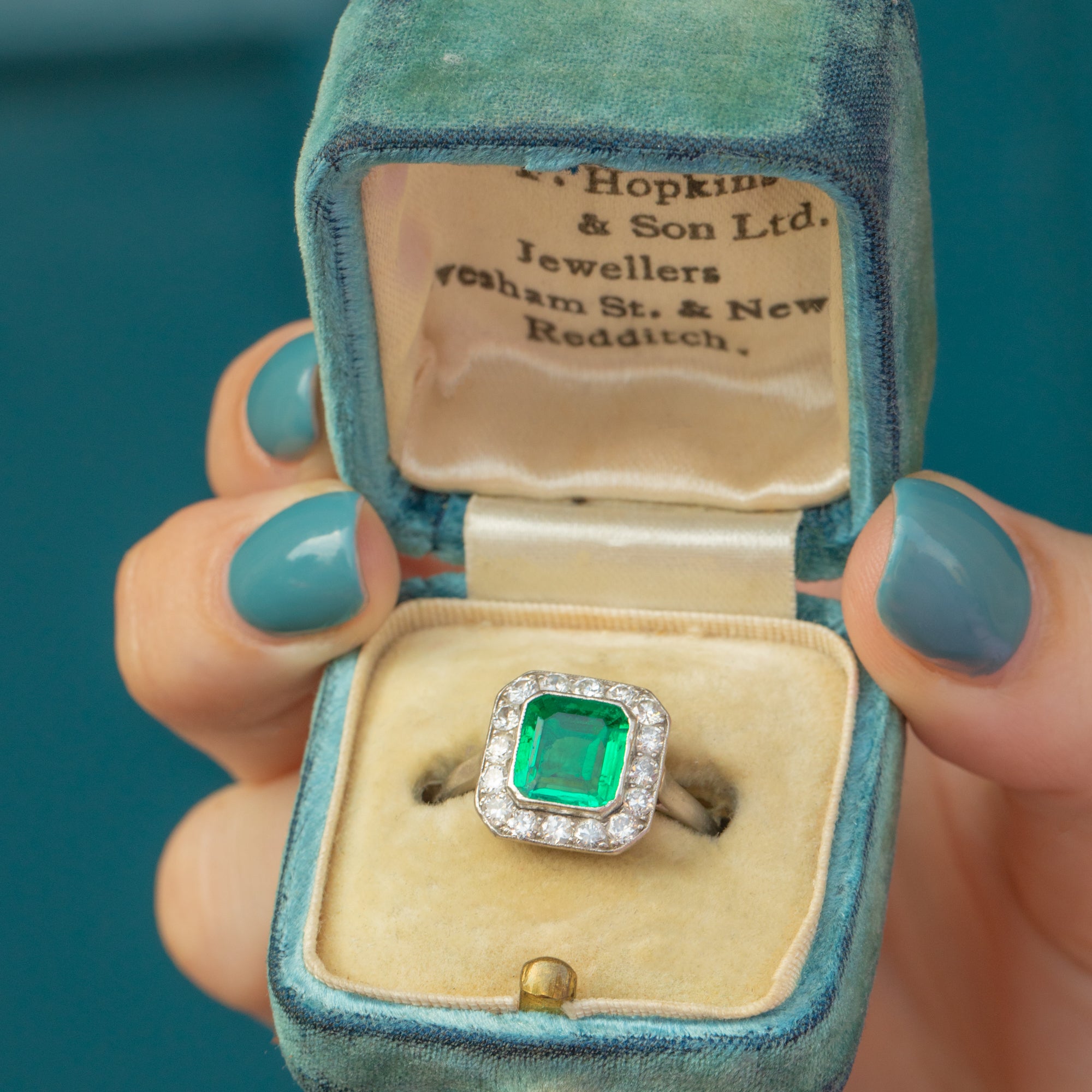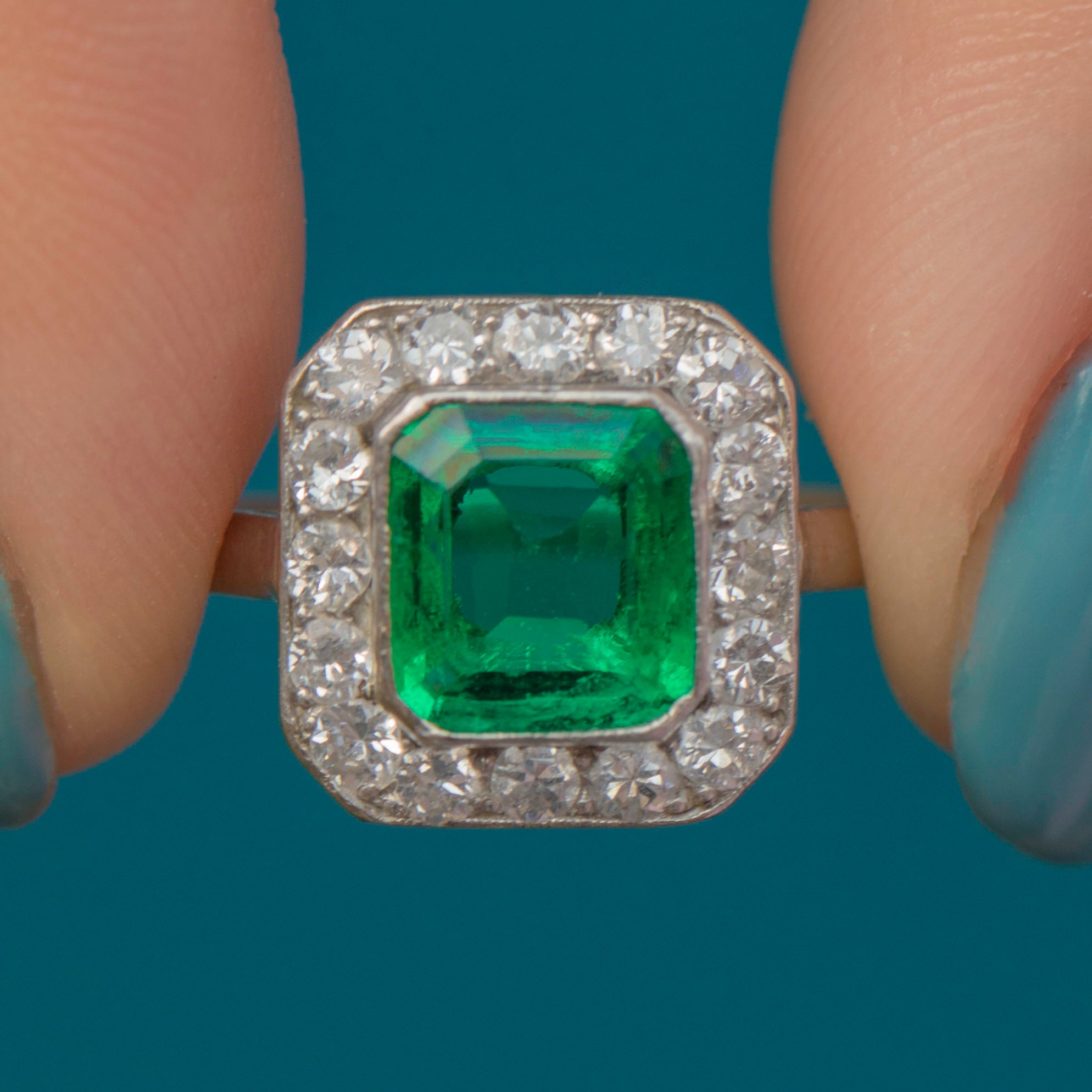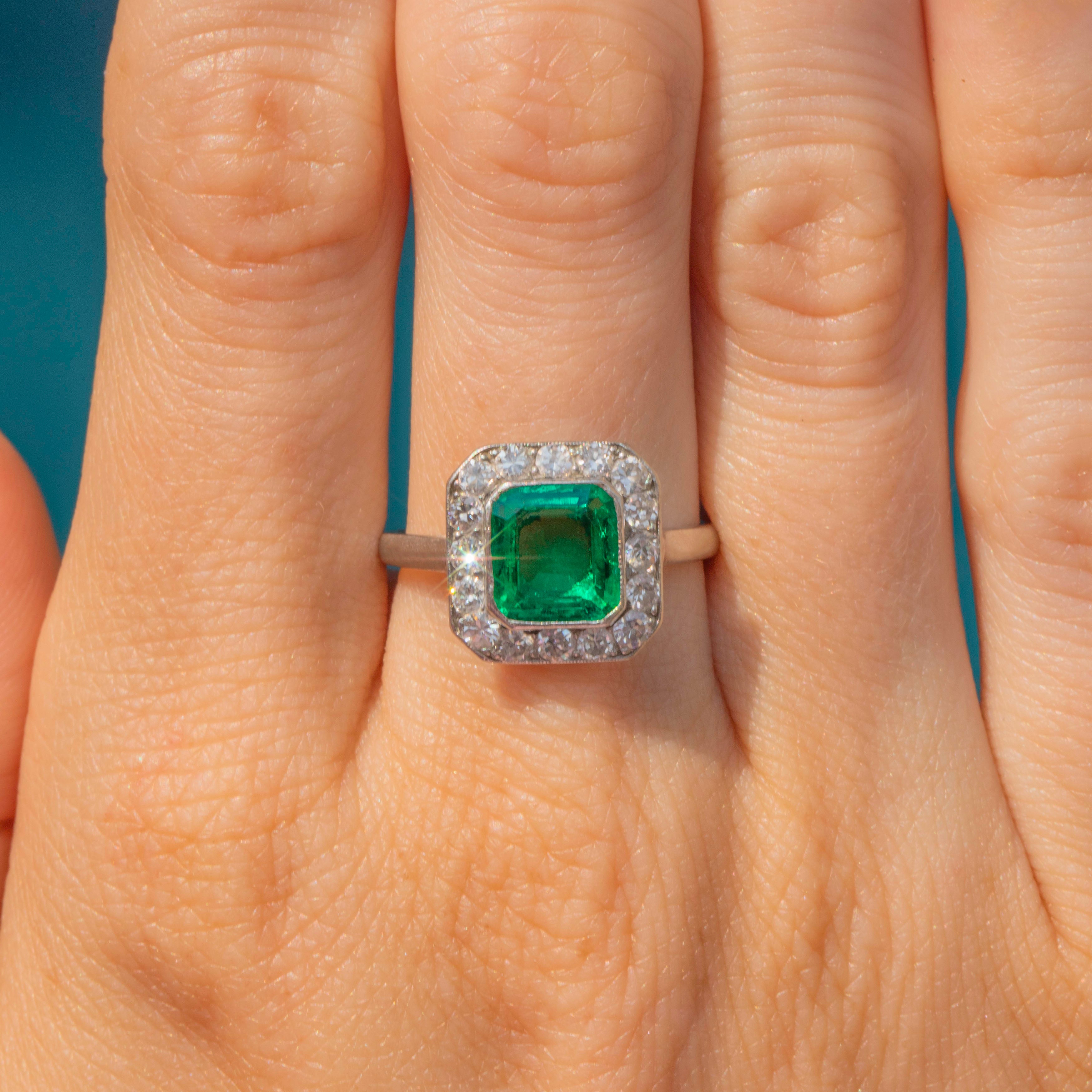 We are in awe of this certified Art Deco Platinum Colombian Emerald Diamond cluster ring! In true Art Deco style, this solid 1920's Platinum ring is sleek, symmetrical and has timeless appeal.