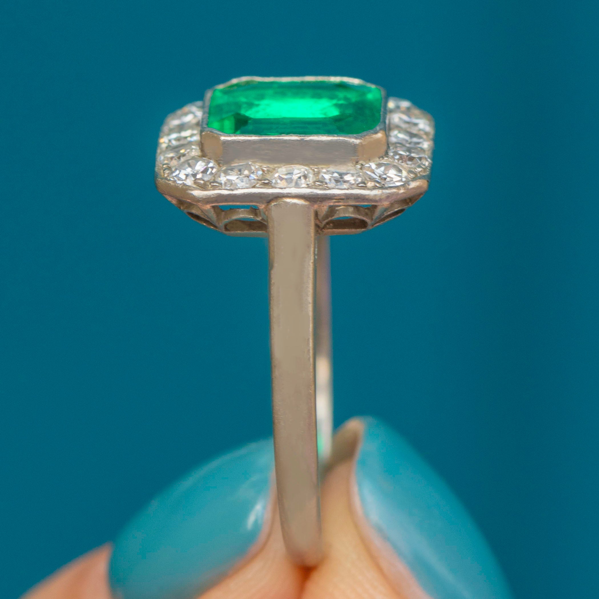 Art Deco Platinum Colombian Emerald Diamond Cluster Ring, 1.17ct Emerald