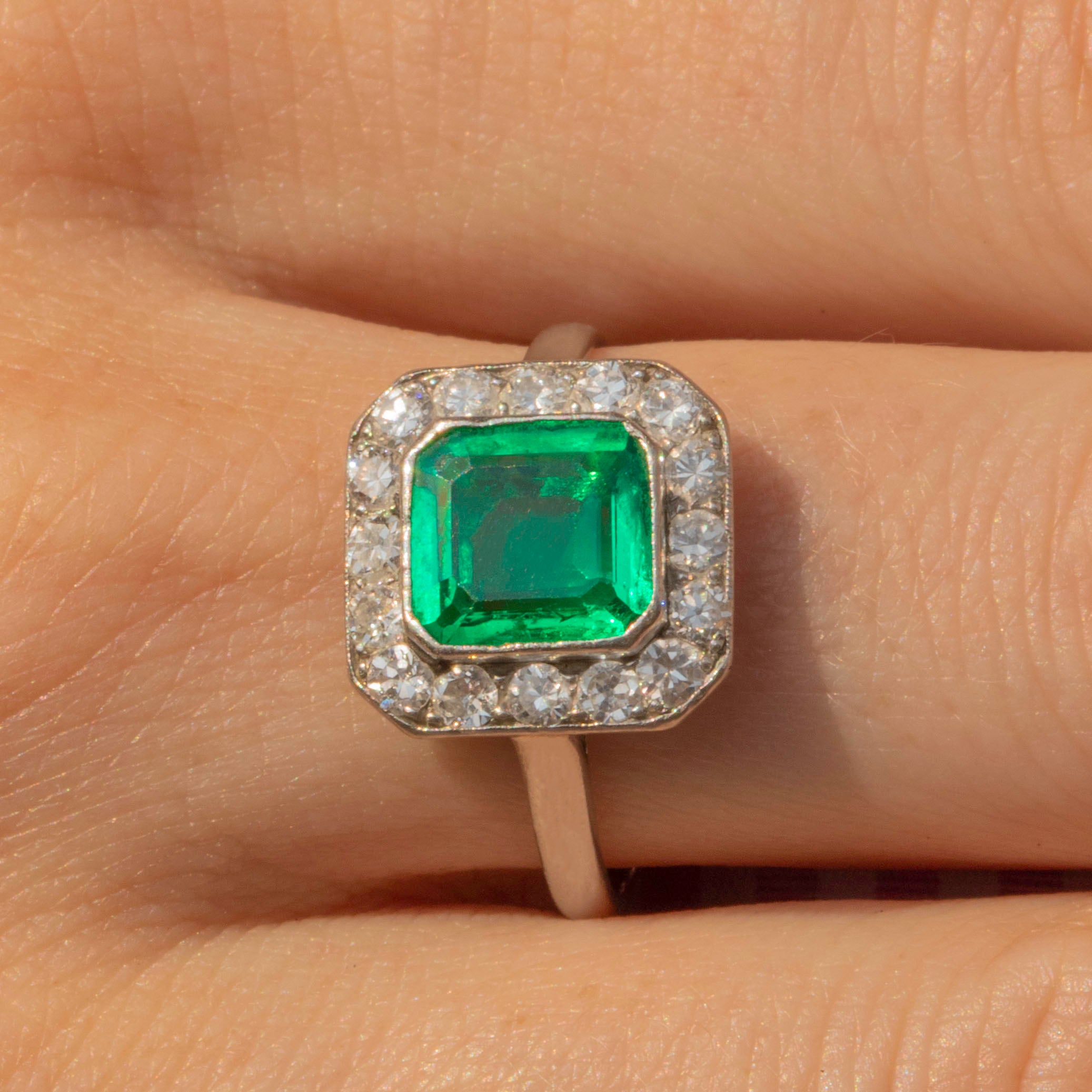 EXCELLENT. This Art Deco Colombian Emerald Diamond cluster ring is in excellent condition! The gorgeous Colombian Emerald is secure in its bezel setting and free from chips or abrasions. The Emerald is complete with its own certificate, stating its natural Colombian origin and indications of minor clarity enhancement. The Diamonds are sparkly and secure, creating a breathtaking cluster. The Platinum is lustrous and the back of the stone settings are equally splendid. This ring wears comfortably on the finger and is gorgeous to look at!