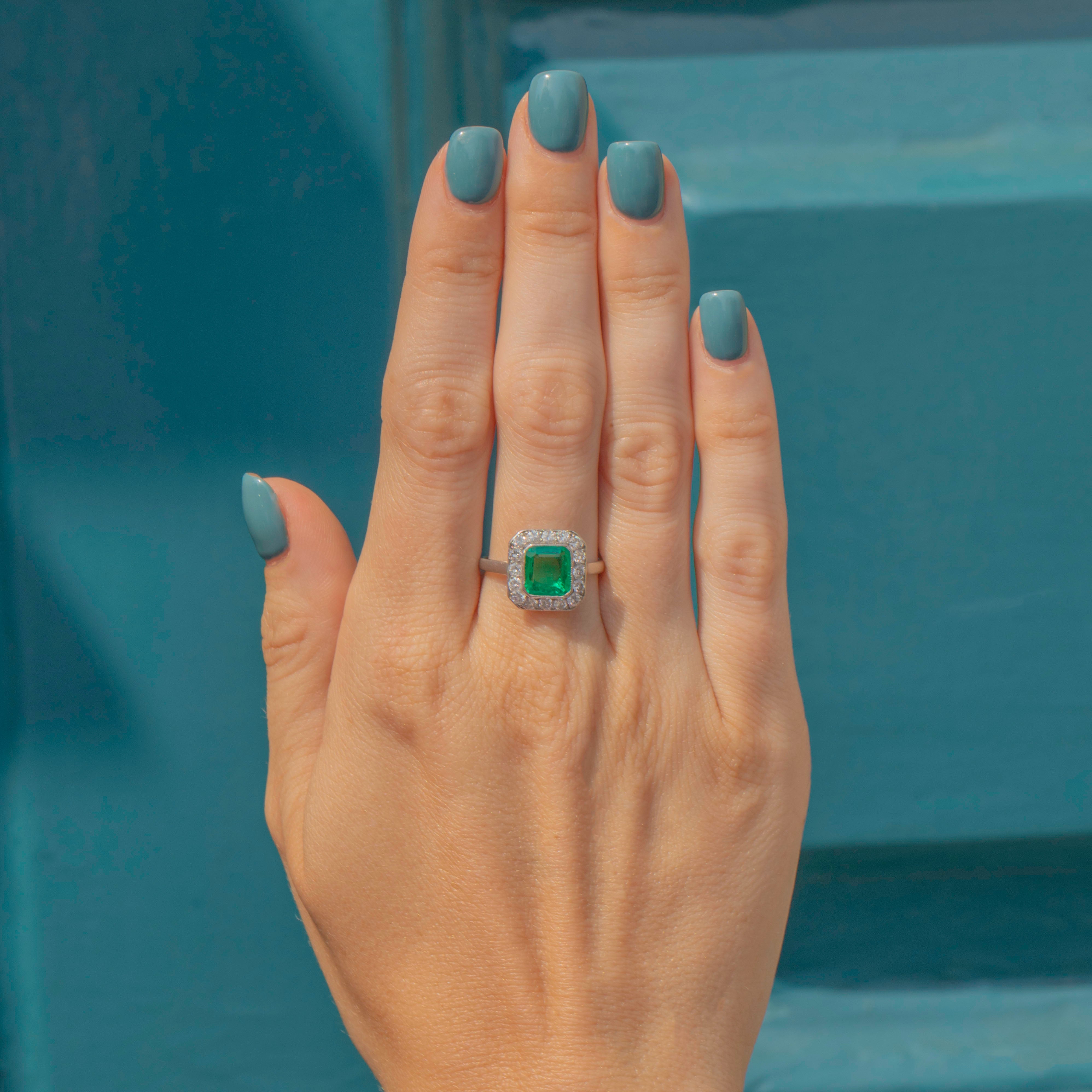 The rich and vivid 1.17ct natural Colombian Emerald makes this piece highly sought after, with an exceptionally vibrant green hue that marries impeccably with the crisp white Diamonds to create an unmissable piece! This cluster ring looks incredible on the finger, demanding attention with her brightness, and garnering appreciation through her rarity.