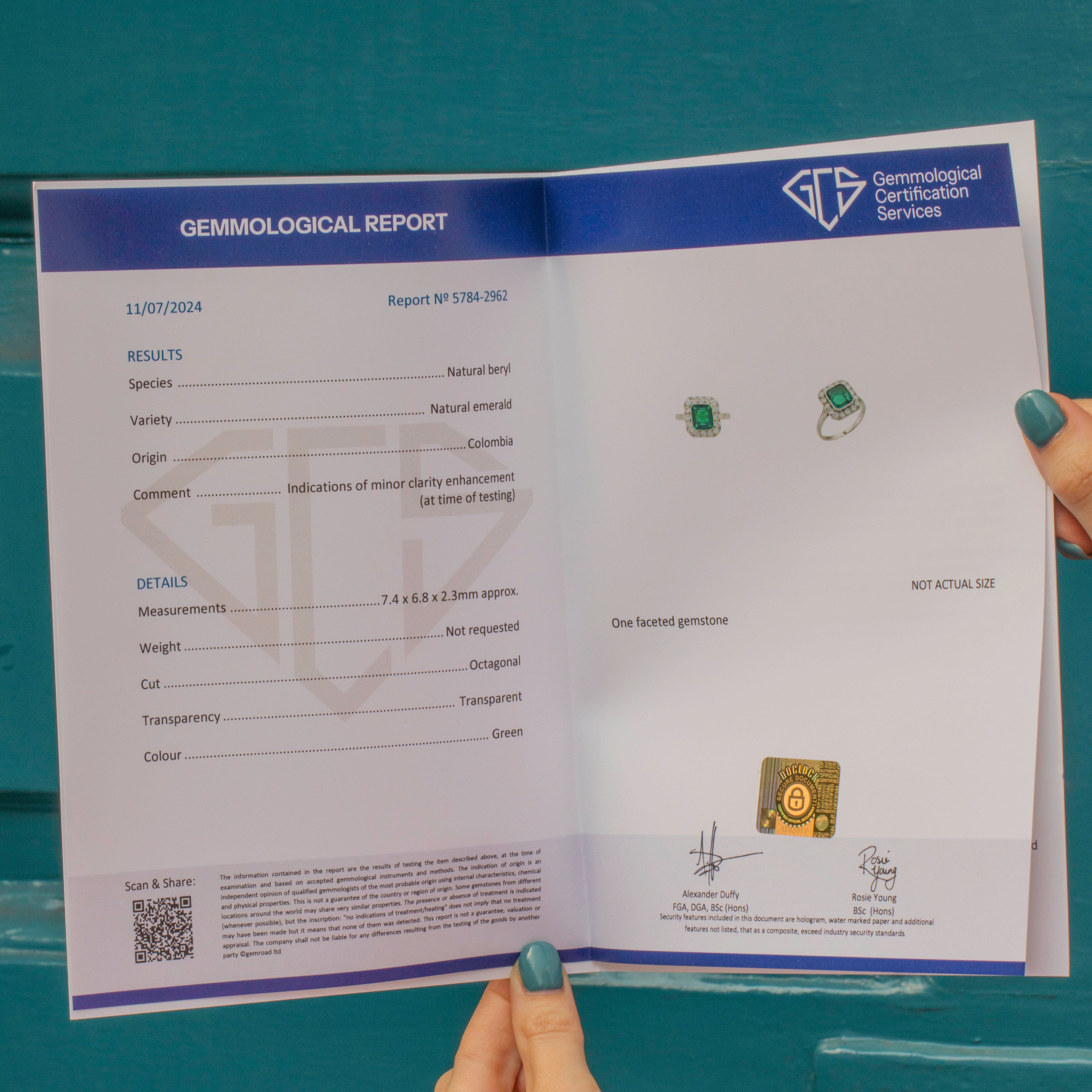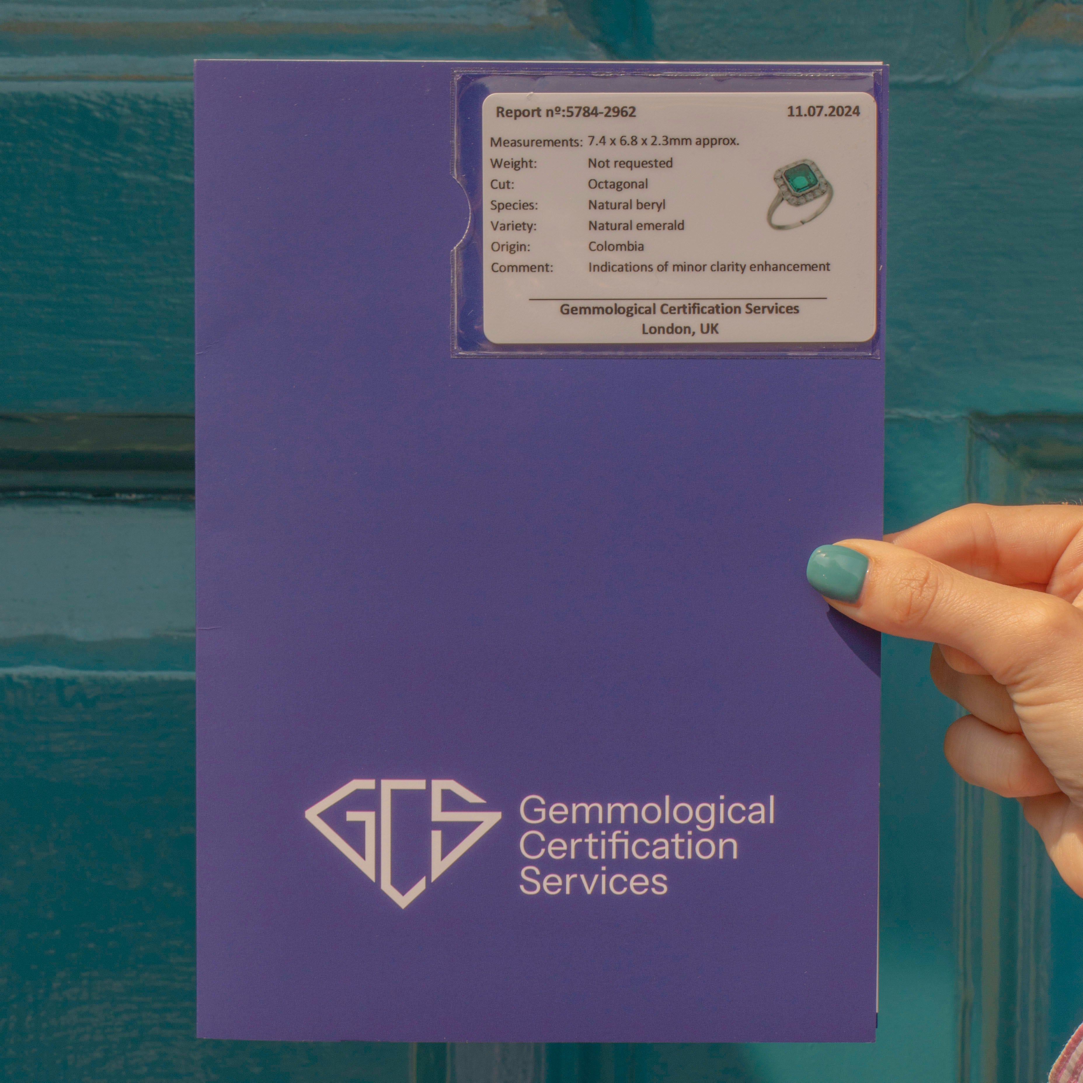 MATERIALS: Tests as Platinum, Diamond (0.40ct), Natural Colombian Emerald (1.17ct), certified by Gemmological Certification Services (GCS). Minor oil. This piece comes with a certificate.
