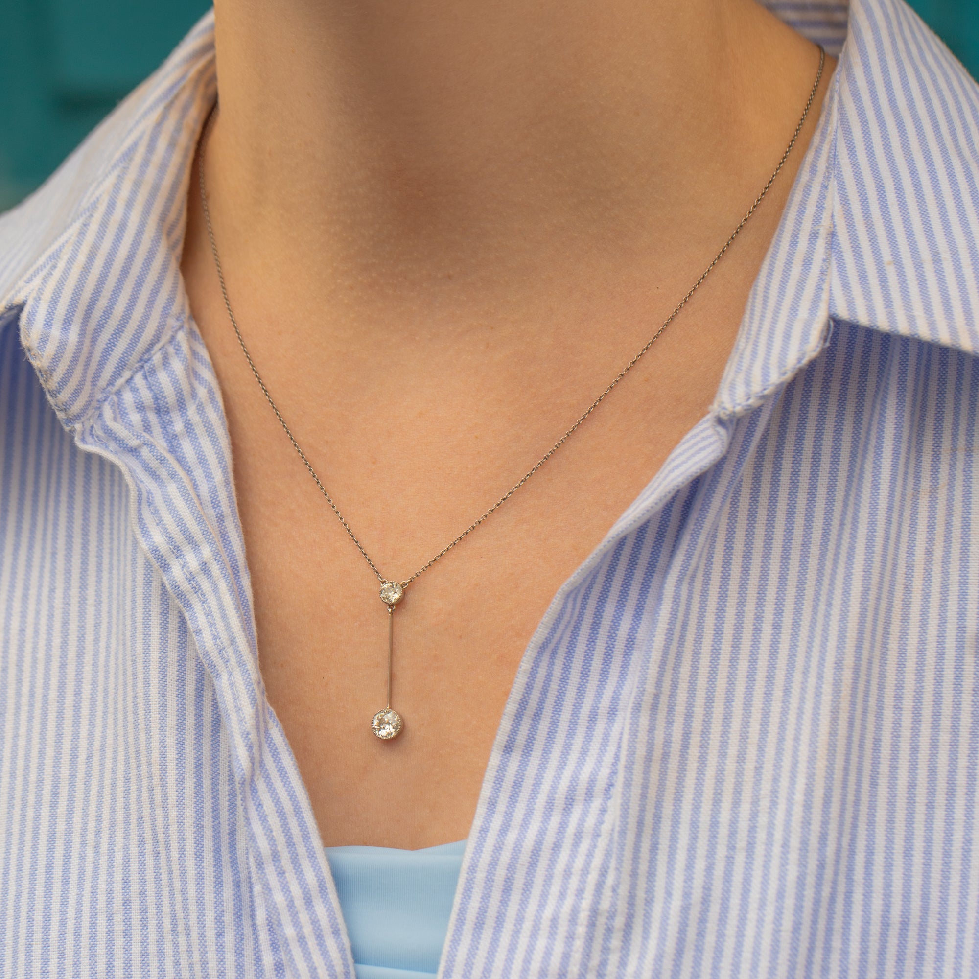 The beauty of this antique Diamond necklace is the attention to detail with the option to wear at both 16.5 or 19 inches, with a dainty 18ct Gold bolt-ring on the extension to fasten. On either end of her knife edge drop lie two sensational and rare Old European-cut Diamonds with a combined carat weight of 0.80ct, encased in a delicate millgrain border. This necklace provides a touch of glisten that will twinkle in the light as she rests across your décolletage!