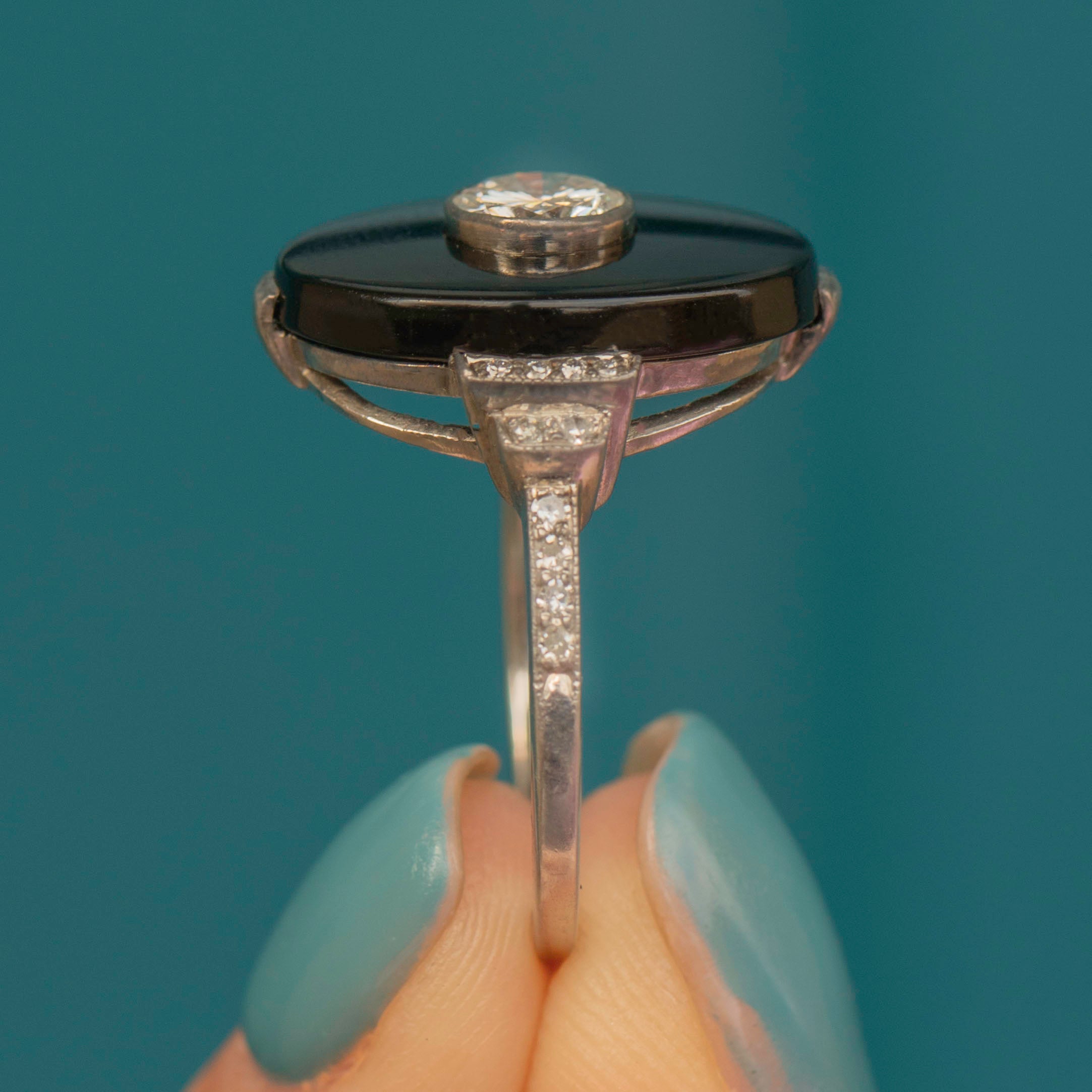 If you love resplendent jewels, this exquisite Art Deco Platinum Onyx Diamond target ring will make a phenomenal addition to your antique jewellery collection! Crafted from solid Platinum throughout, the bold design of this ring displays a smooth slab of Onyx with a flush set round brilliant Diamond at its centre boasting a whopping 0.50ct!