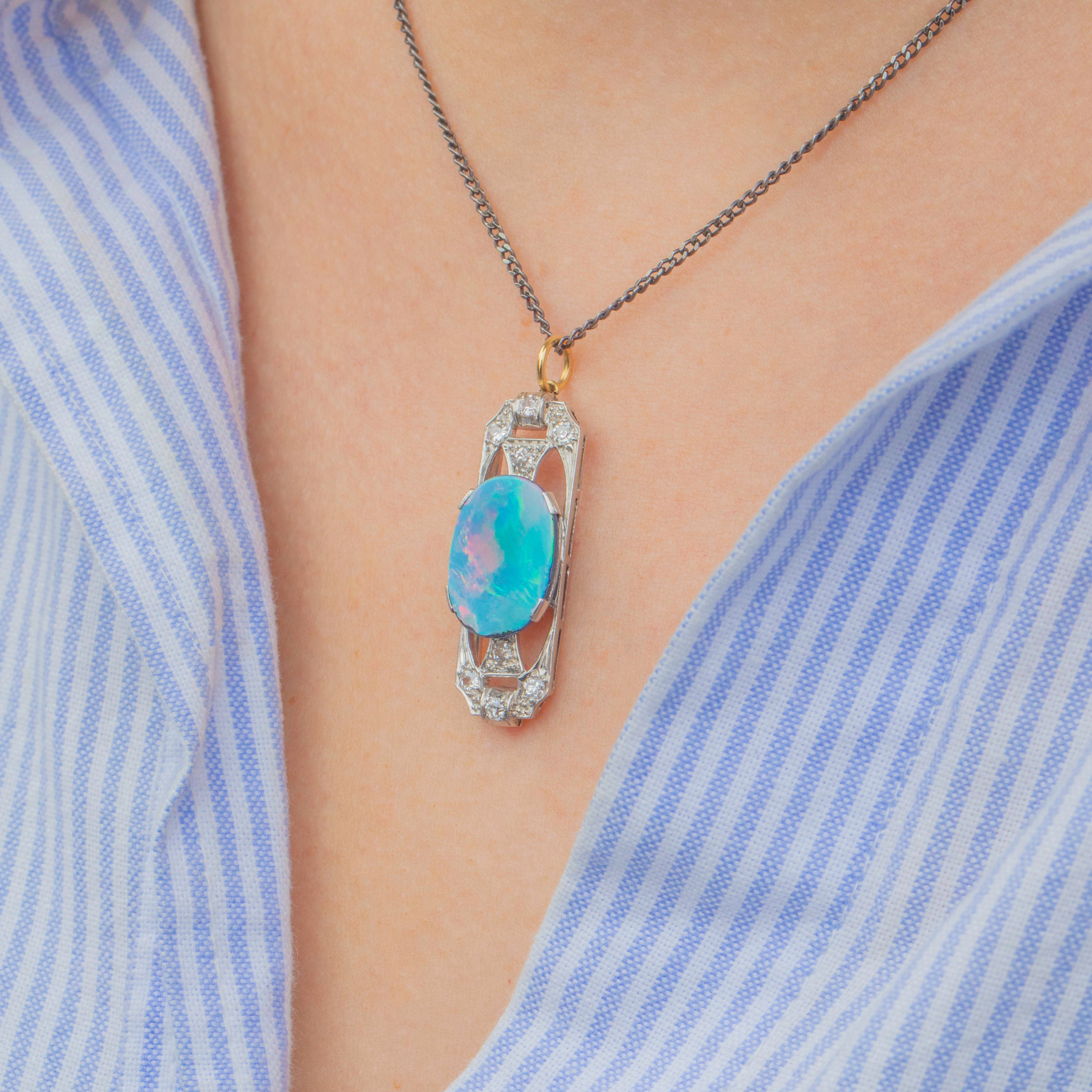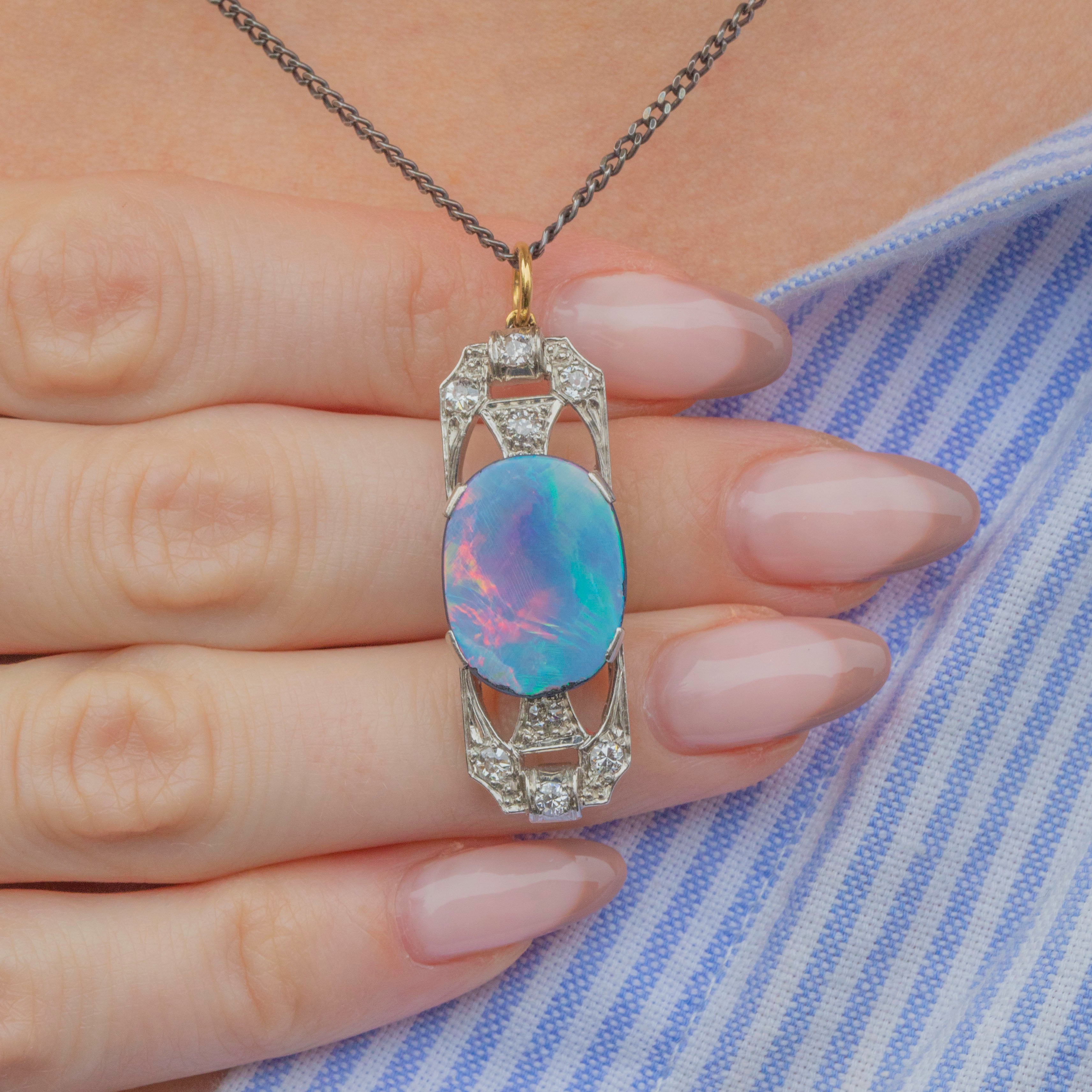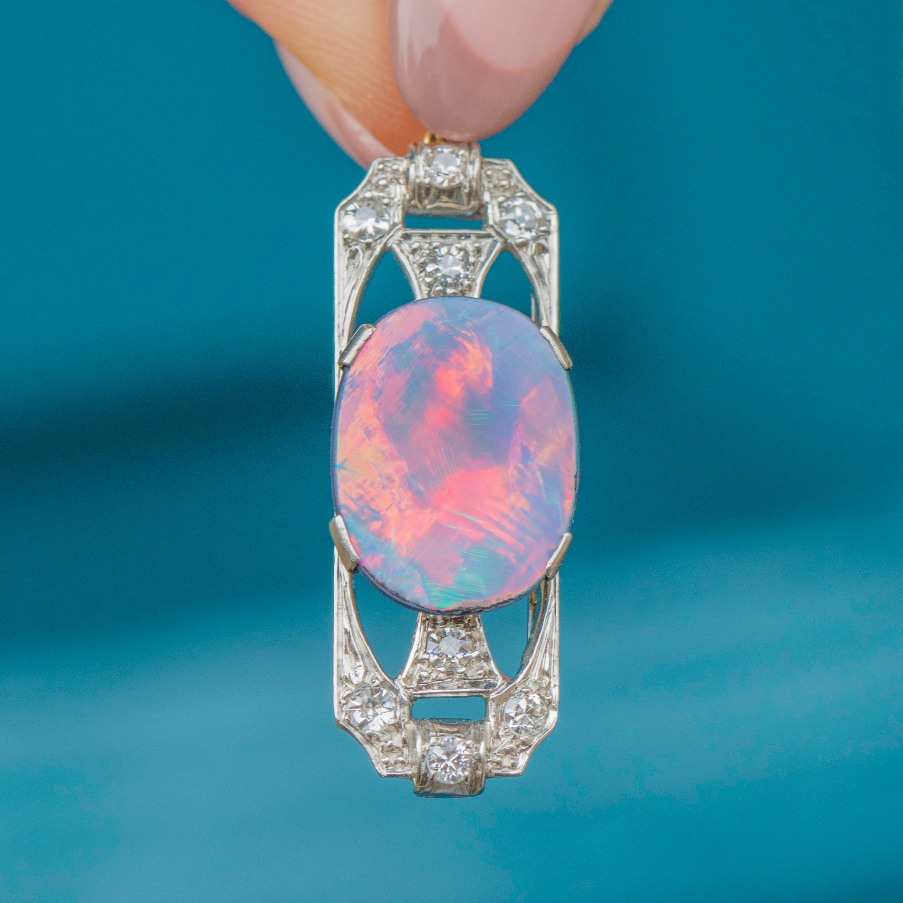 VERY GOOD. This Art Deco Platinum Opal Diamond pendant is in very good condition. Her radiant Opal doublet has a minor nibble in the back, however this is not noticeable during wear. The Diamonds are all present and securely set and the Platinum is in excellent condition. With little wear to note, she is a must-have!