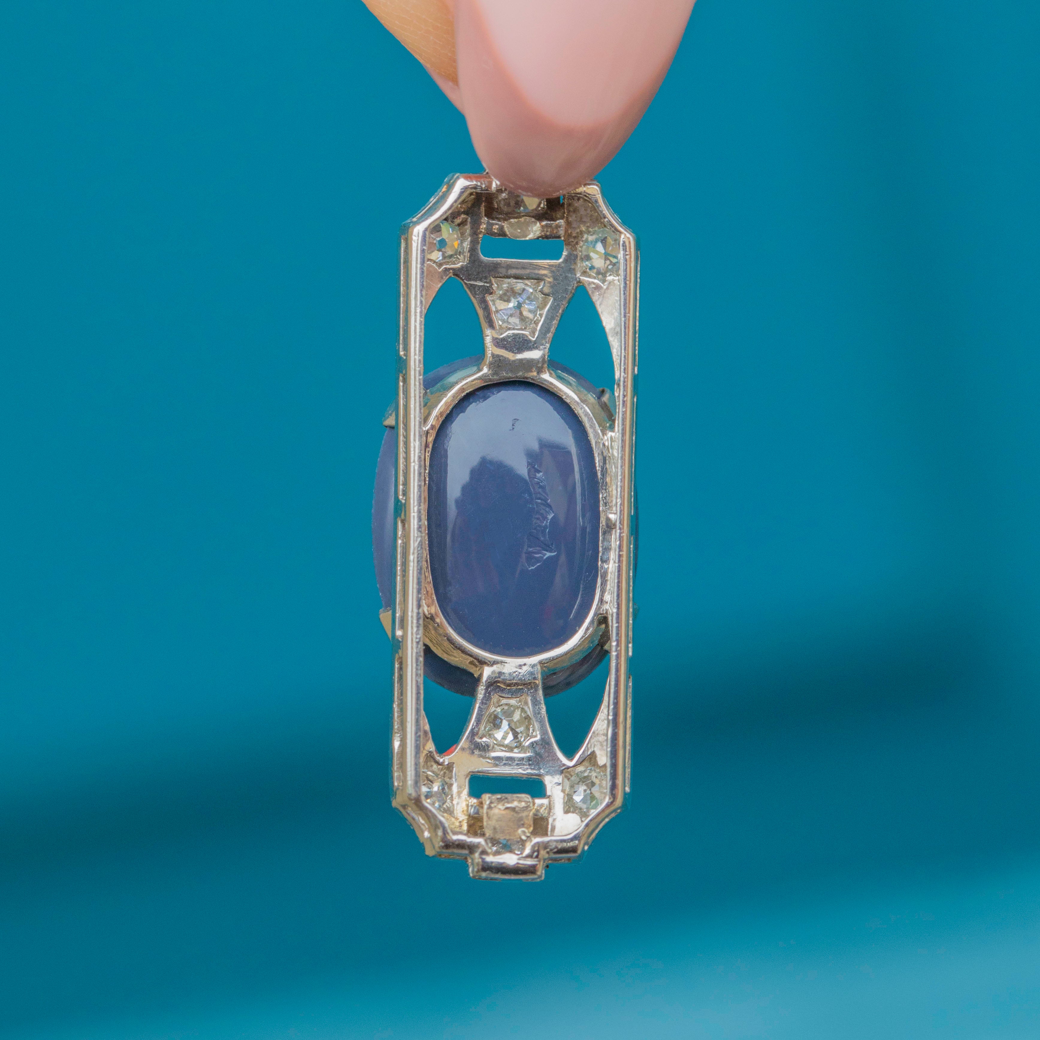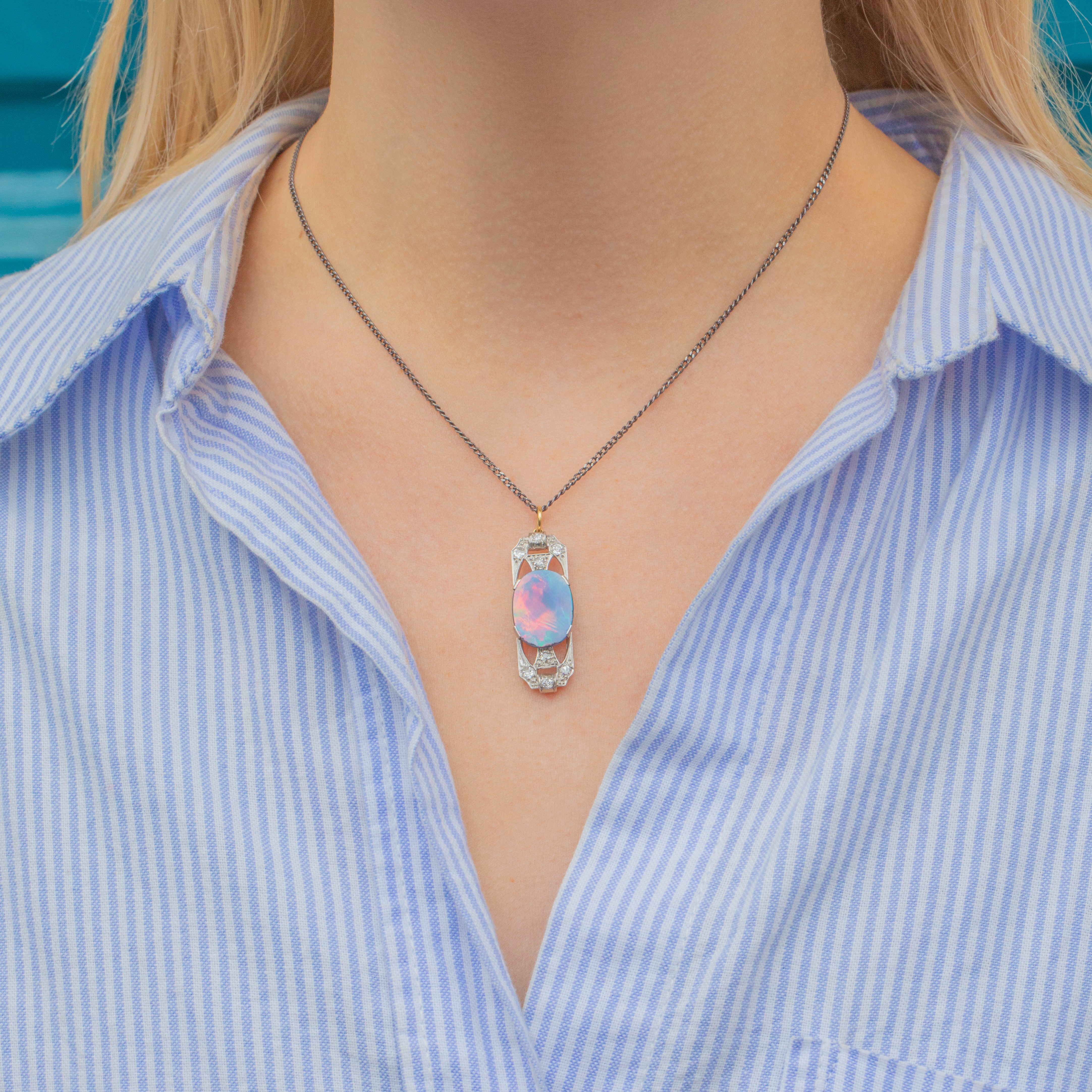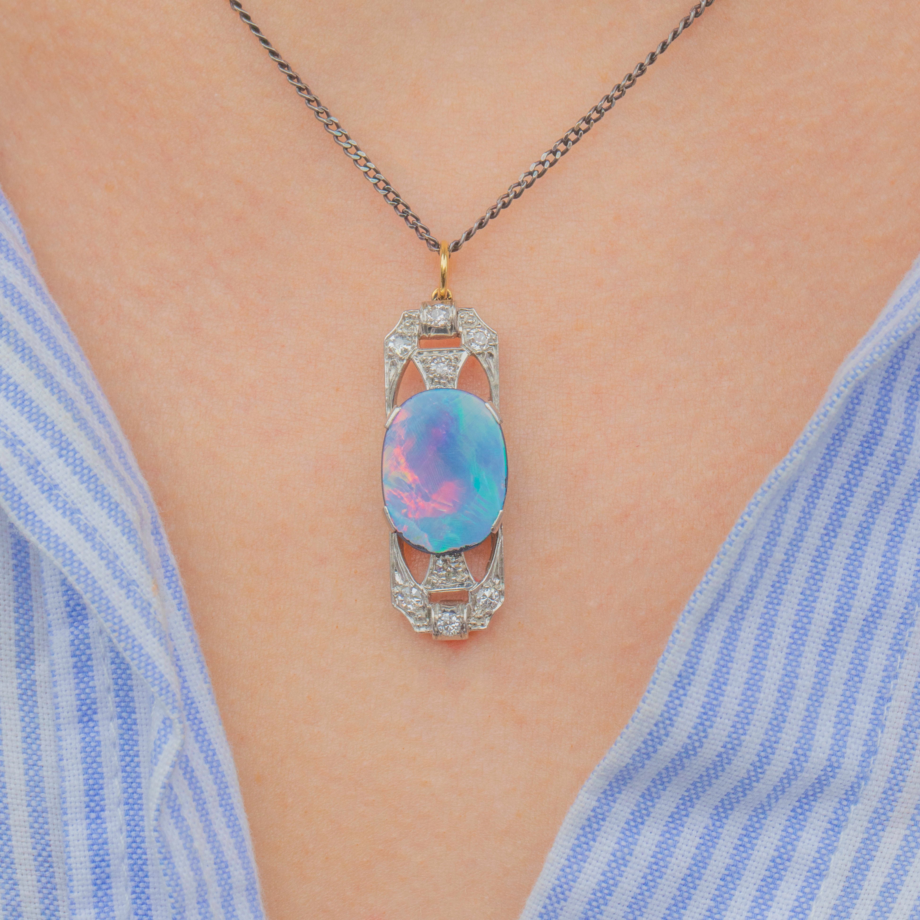 VERY GOOD. This Art Deco Platinum Opal Diamond pendant is in very good condition. Her radiant Opal doublet has a minor nibble in the back, however this is not noticeable during wear. The Diamonds are all present and securely set and the Platinum is in excellent condition. With little wear to note, she is a must-have!