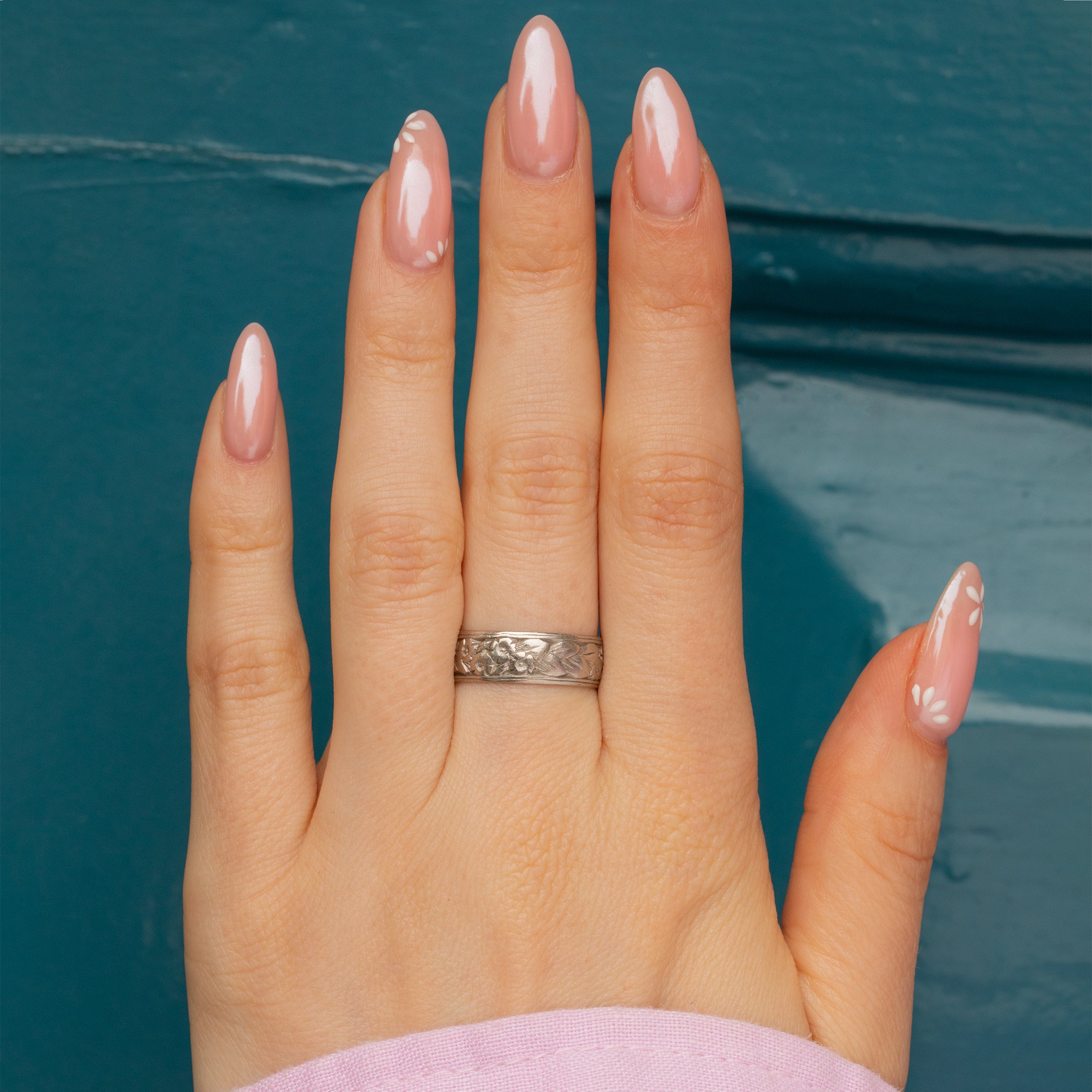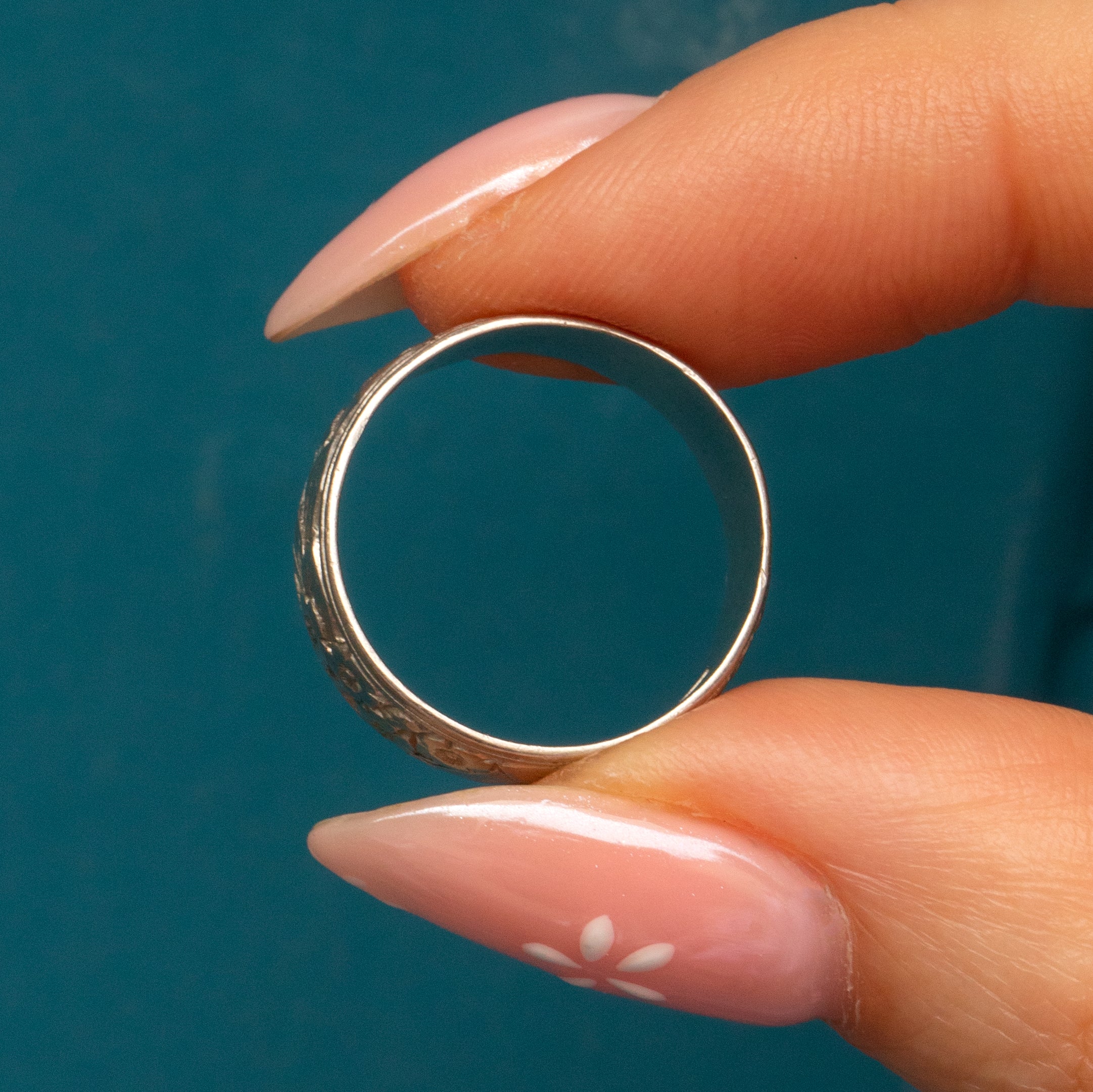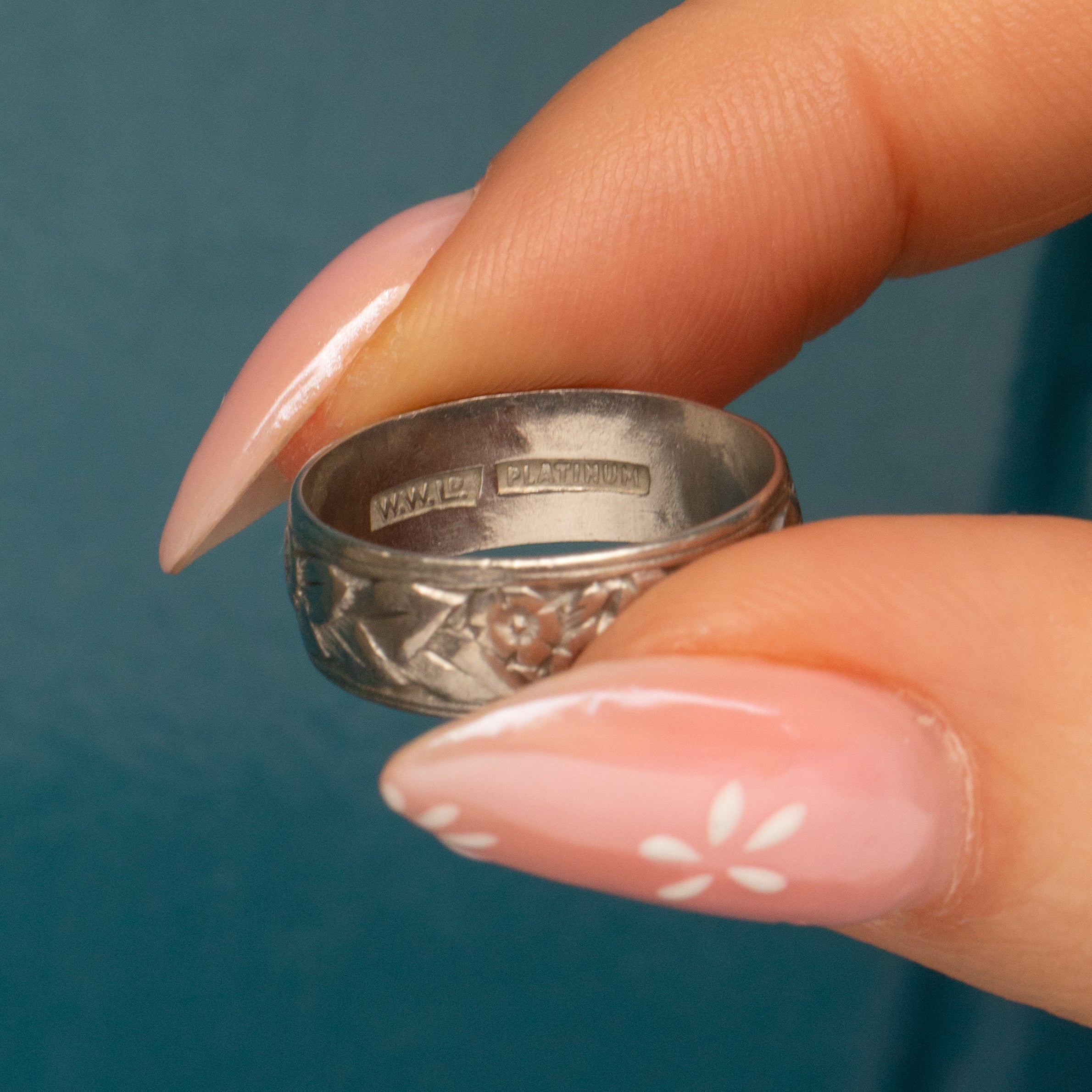 This antique Platinum orange blossom engraved ring is quite the statement piece! Measuring 6mm wide, every inch of her bright, chunky Platinum band is adorned with delicate orange blossom engravings.
