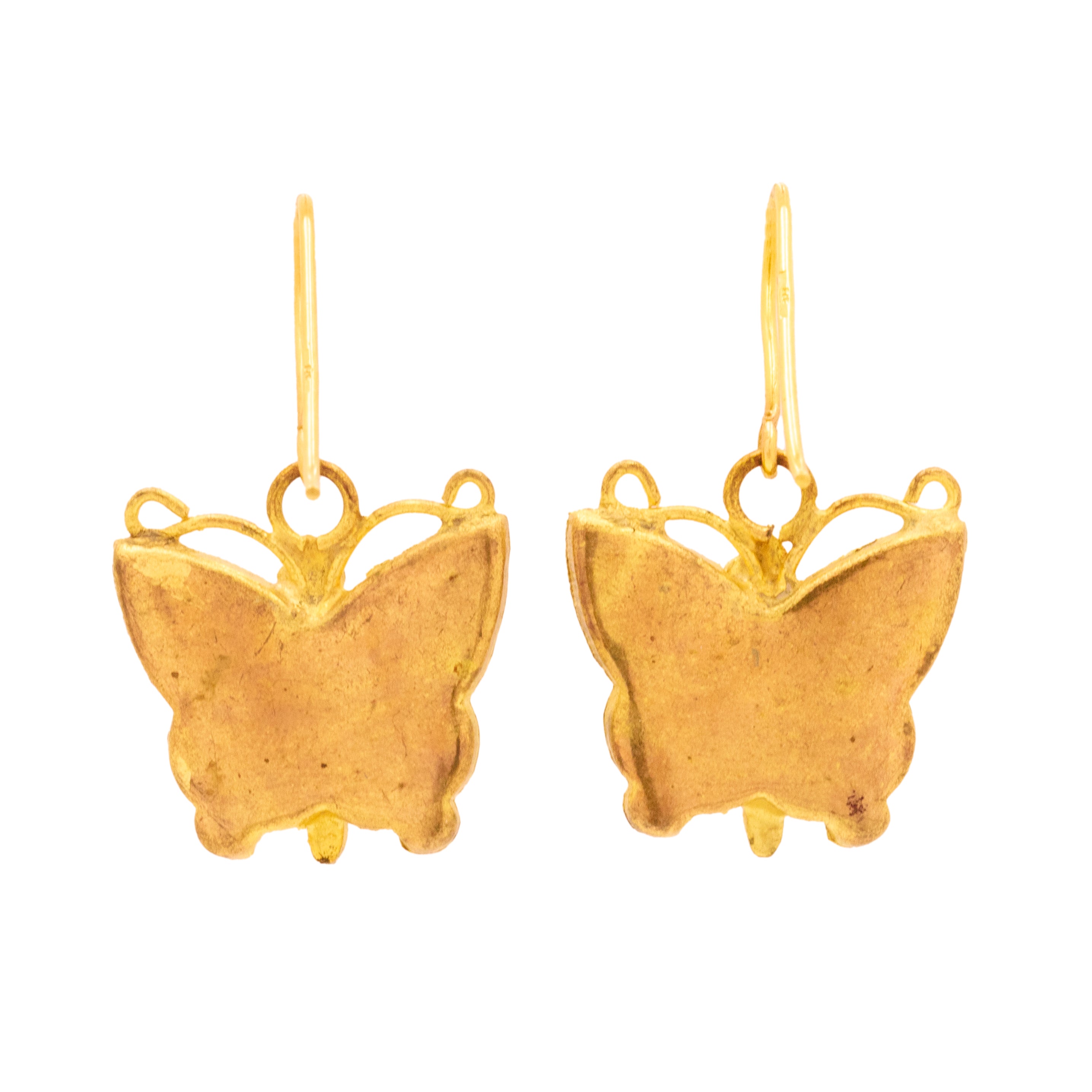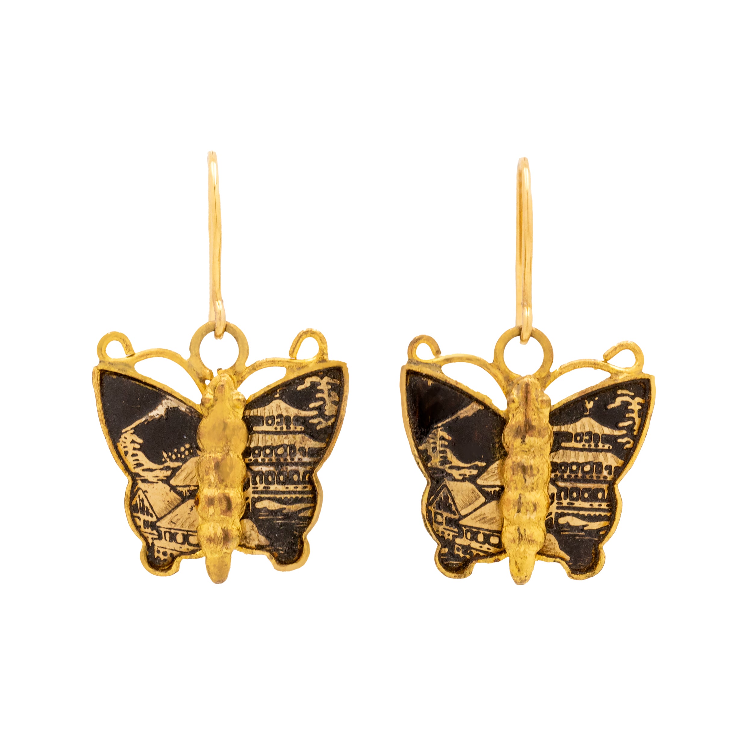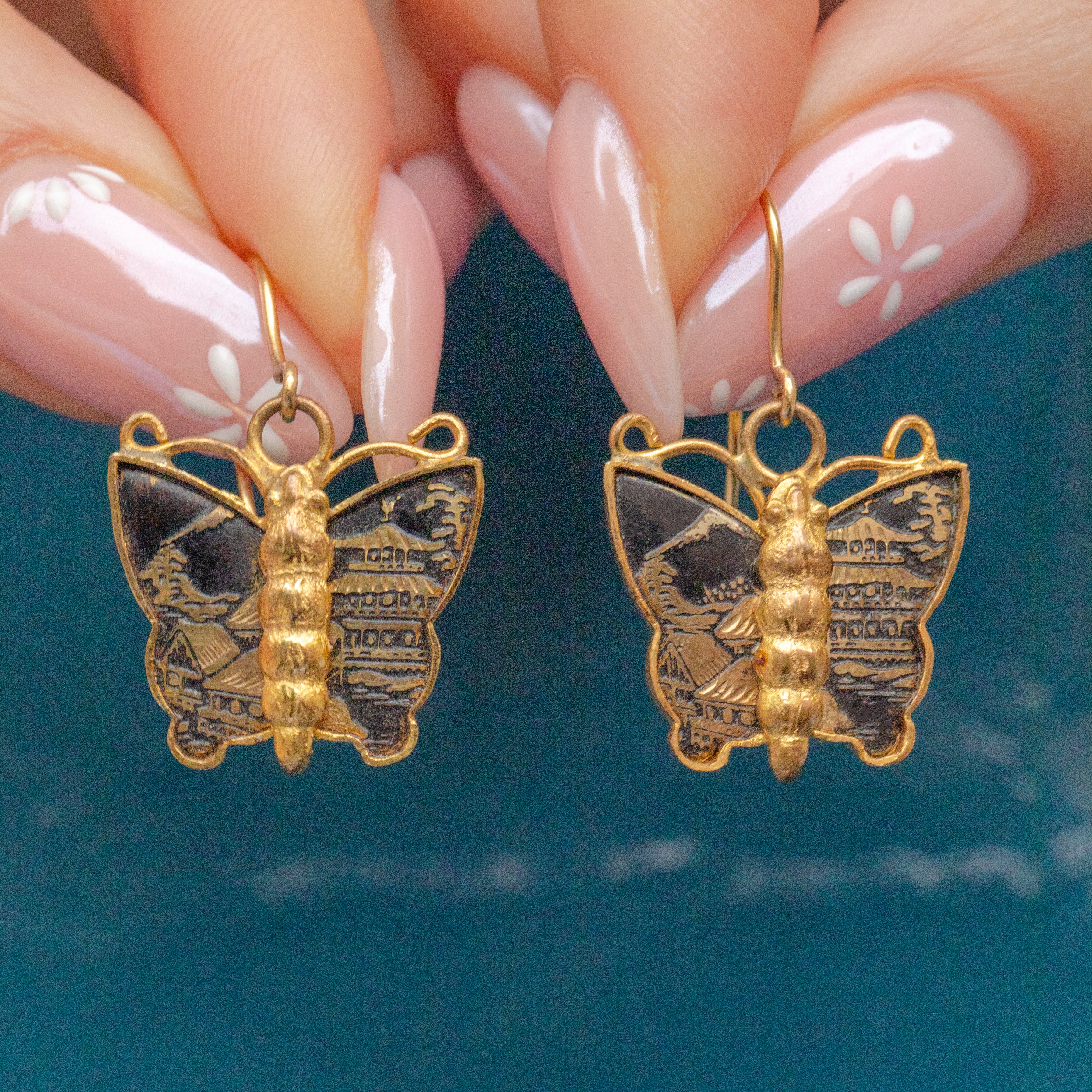 EXCELLENT. These Art Deco Shakudo Damascene butterfly earrings are offered in excellent condition. The Shakudo damascene is pristine, free from any signs of wear. The back of the earrings has some surface wear, however, this is not noticeable when worn. The Gold-toned metal is bright and holds the Shakudo damascene securely. The slender hooks provide comfortable wear and allow you to wear these treasures confidently!