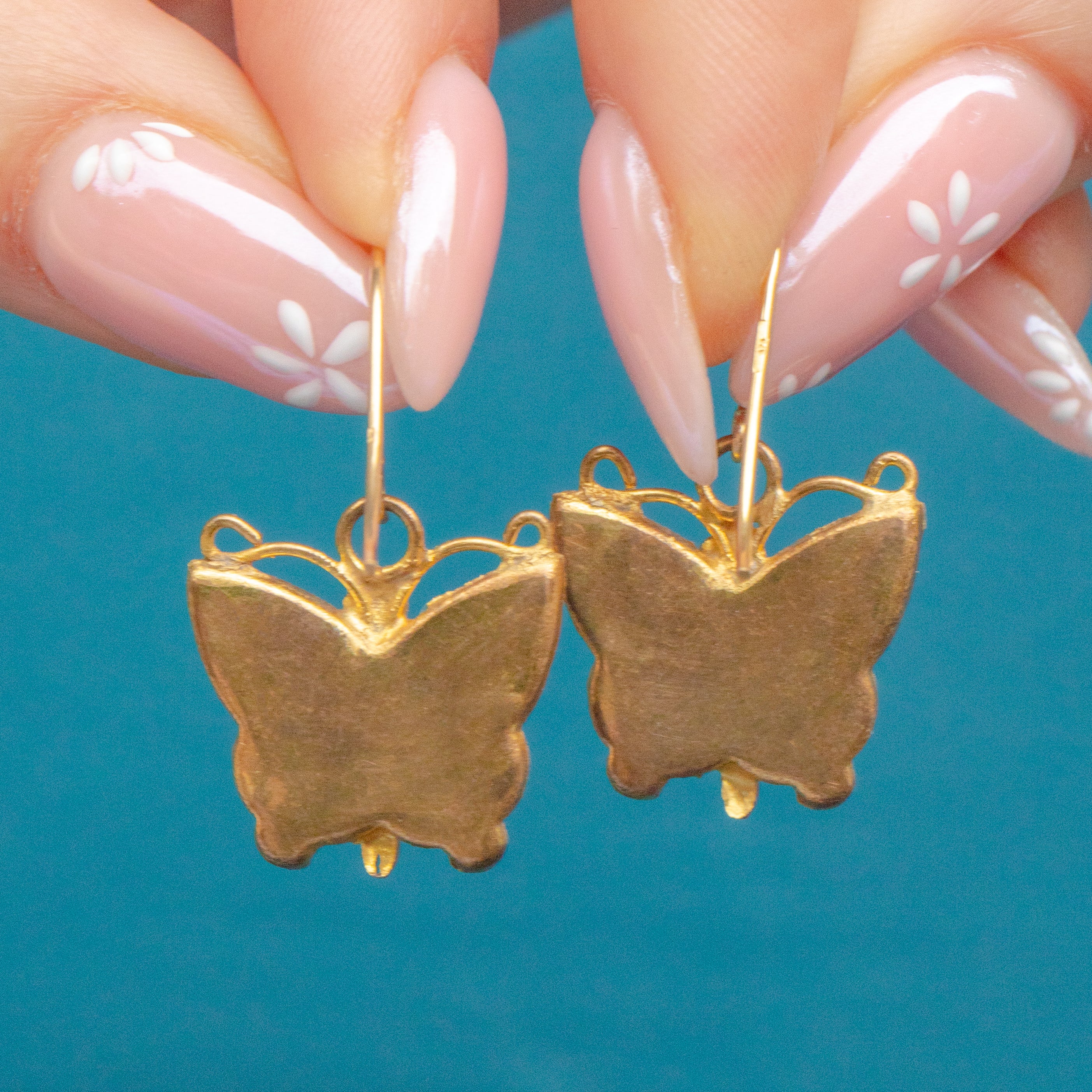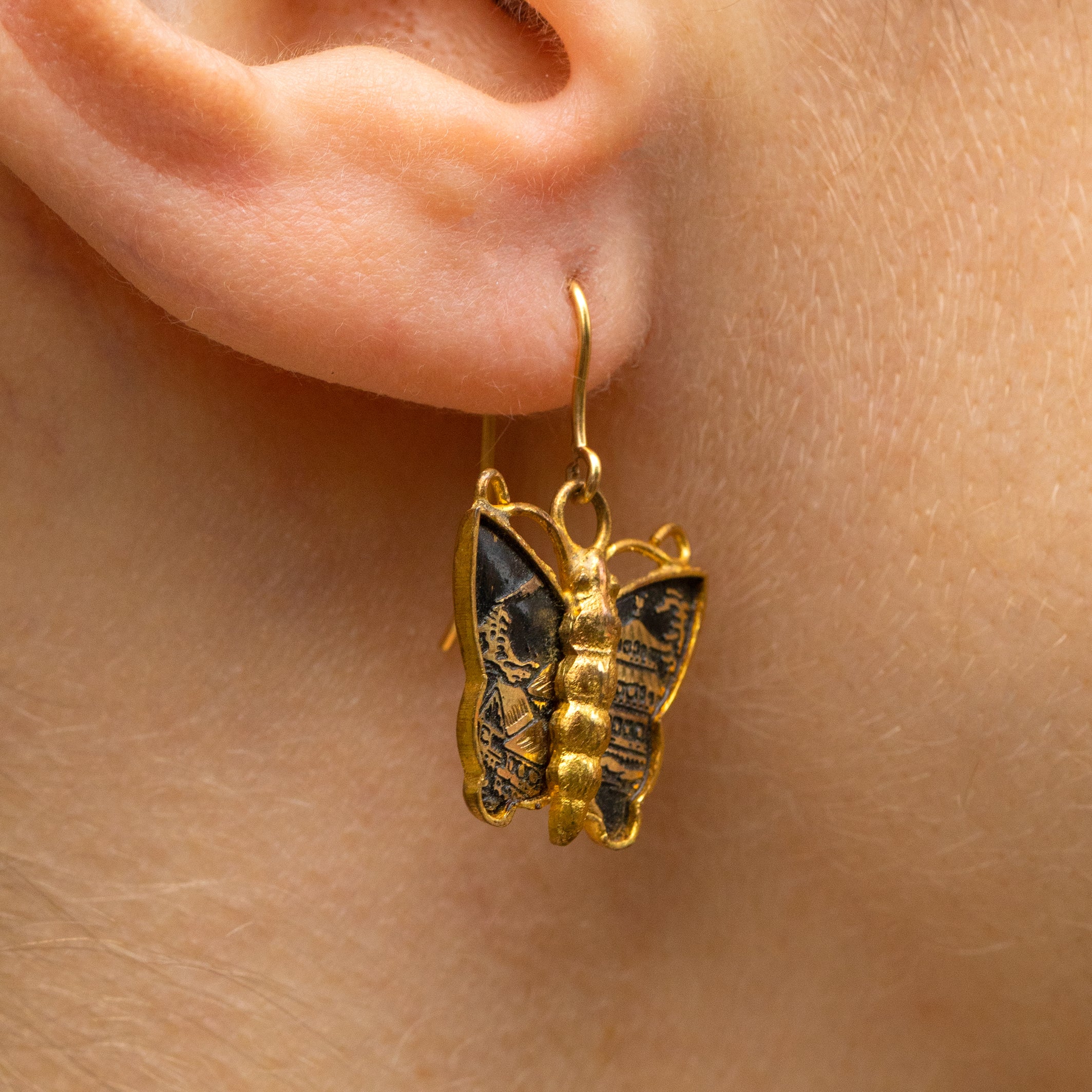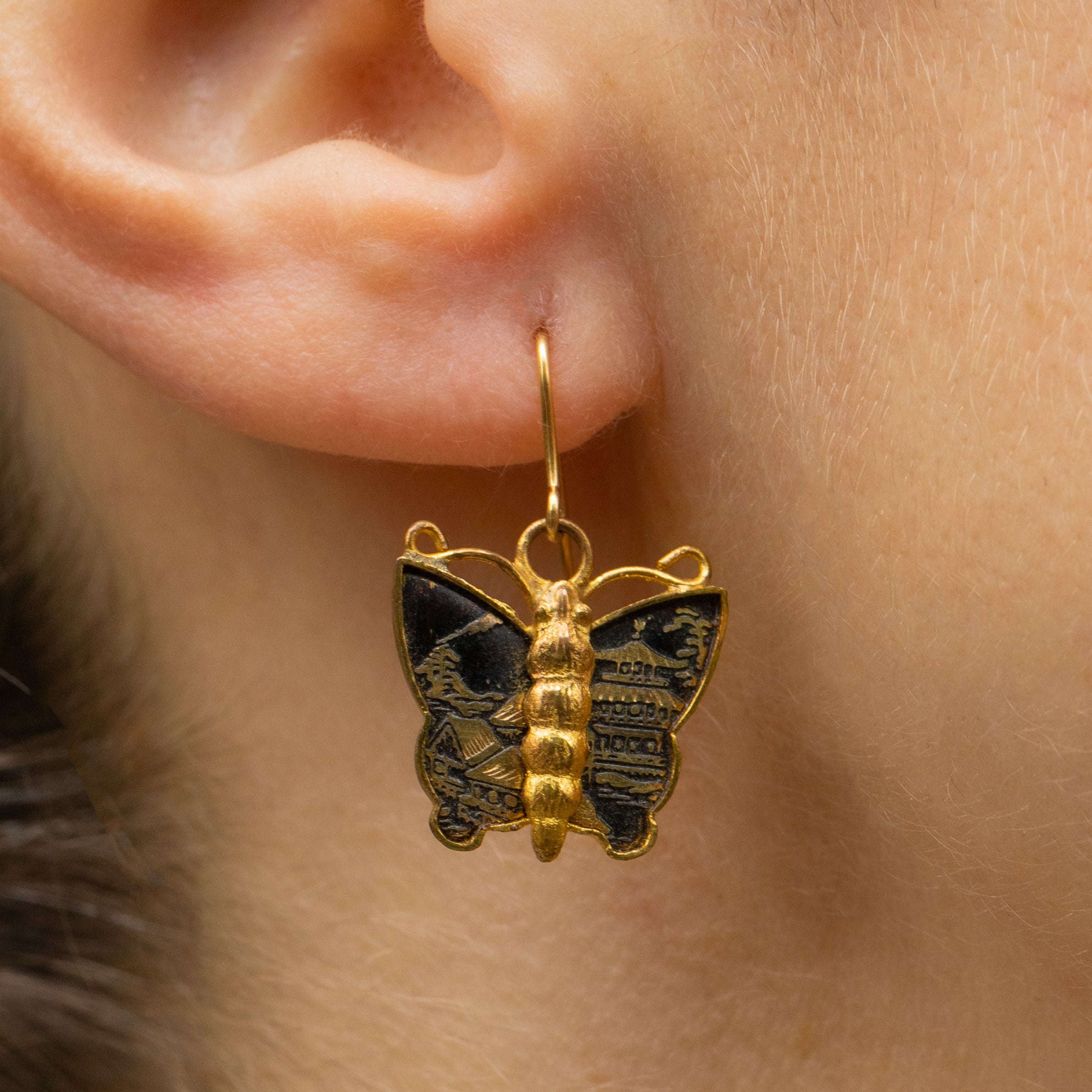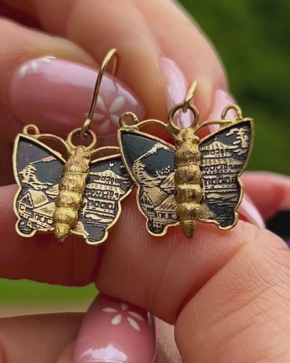 These exquisite Art Deco Shakudo damascene butterfly earrings exude timeless elegance and sophistication. The Shakudo Damascene technique, originating from Japan, involves the meticulous layering of Gold to create intricate patterns reminiscent of traditional Japanese sword-making.