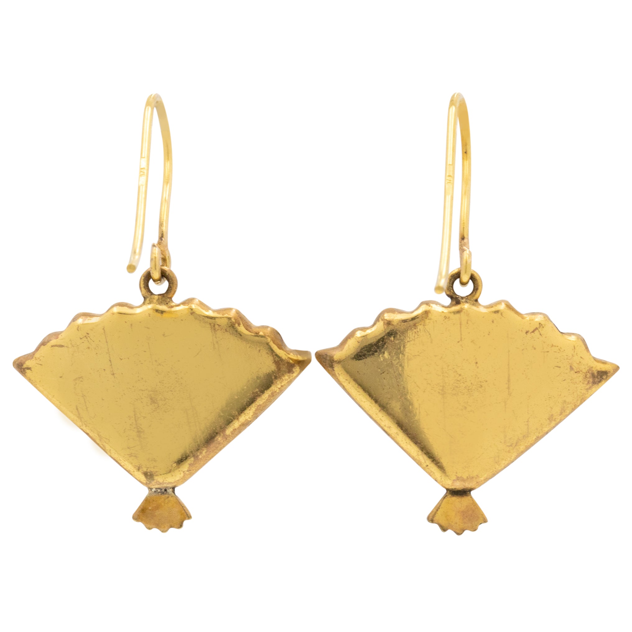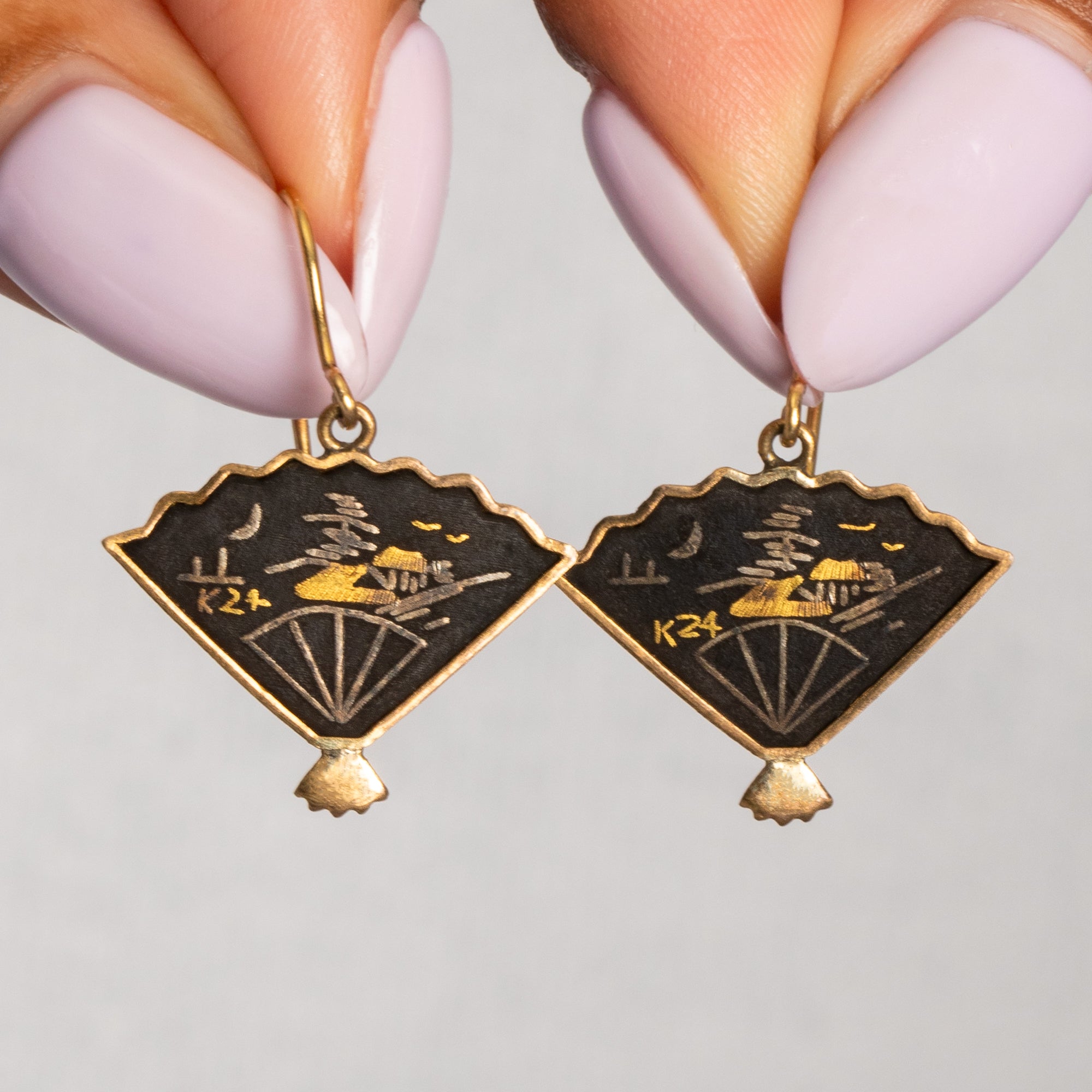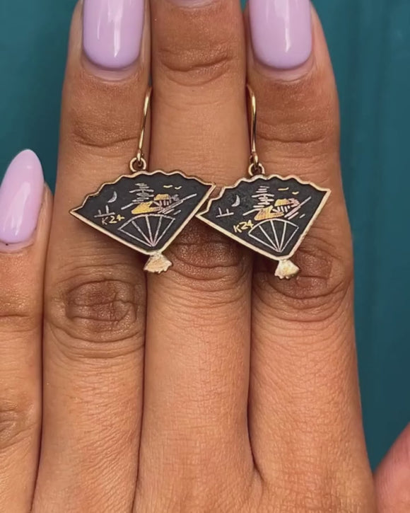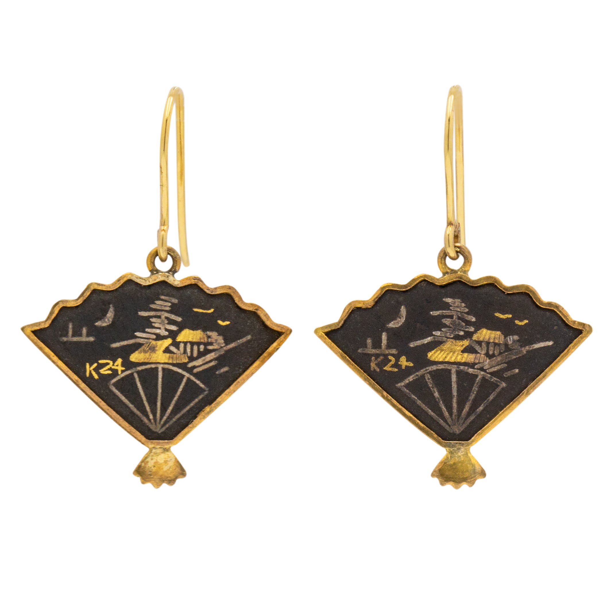 アールデコ 錫黒色 錆絵 扇形 イヤリング、9ct ゴールドフック