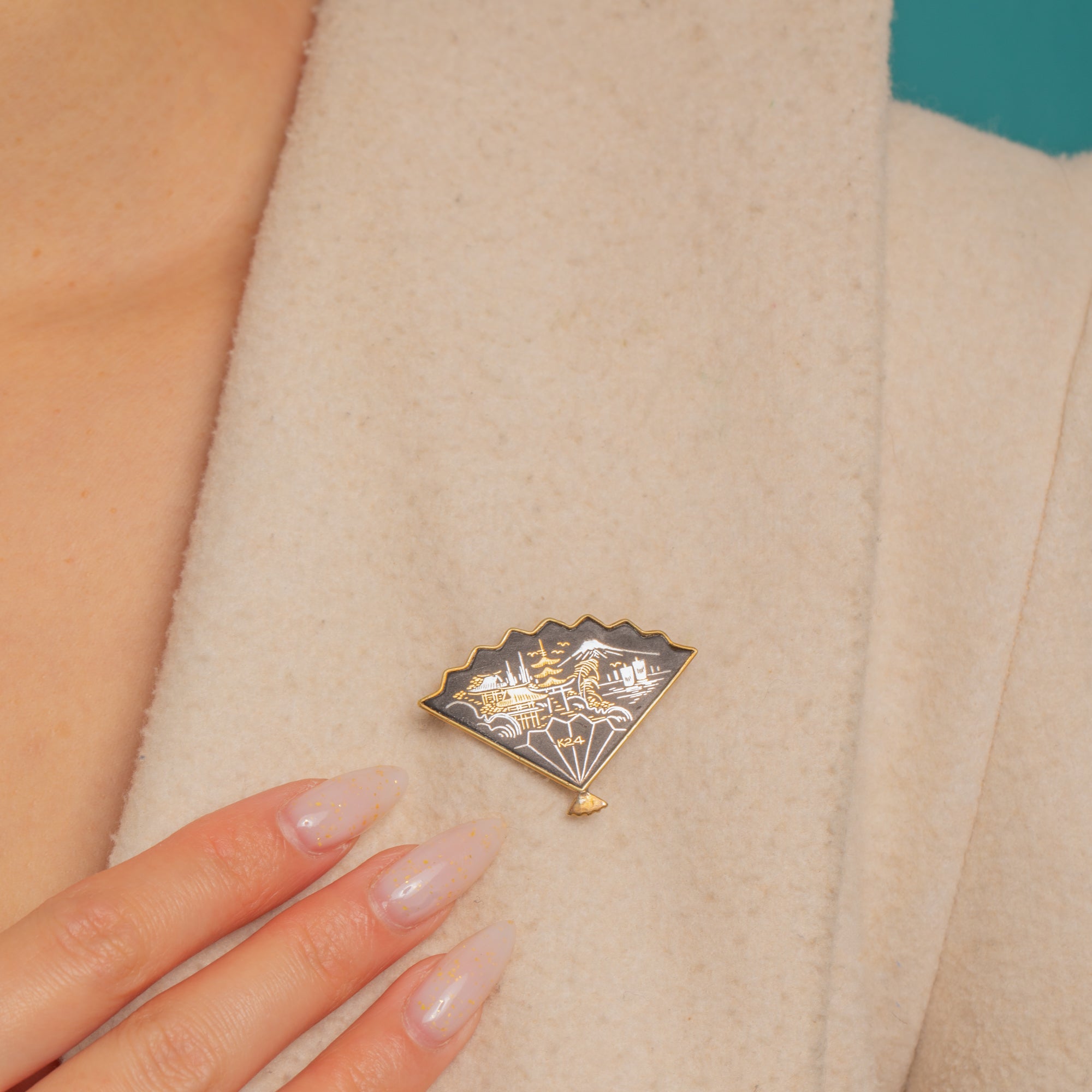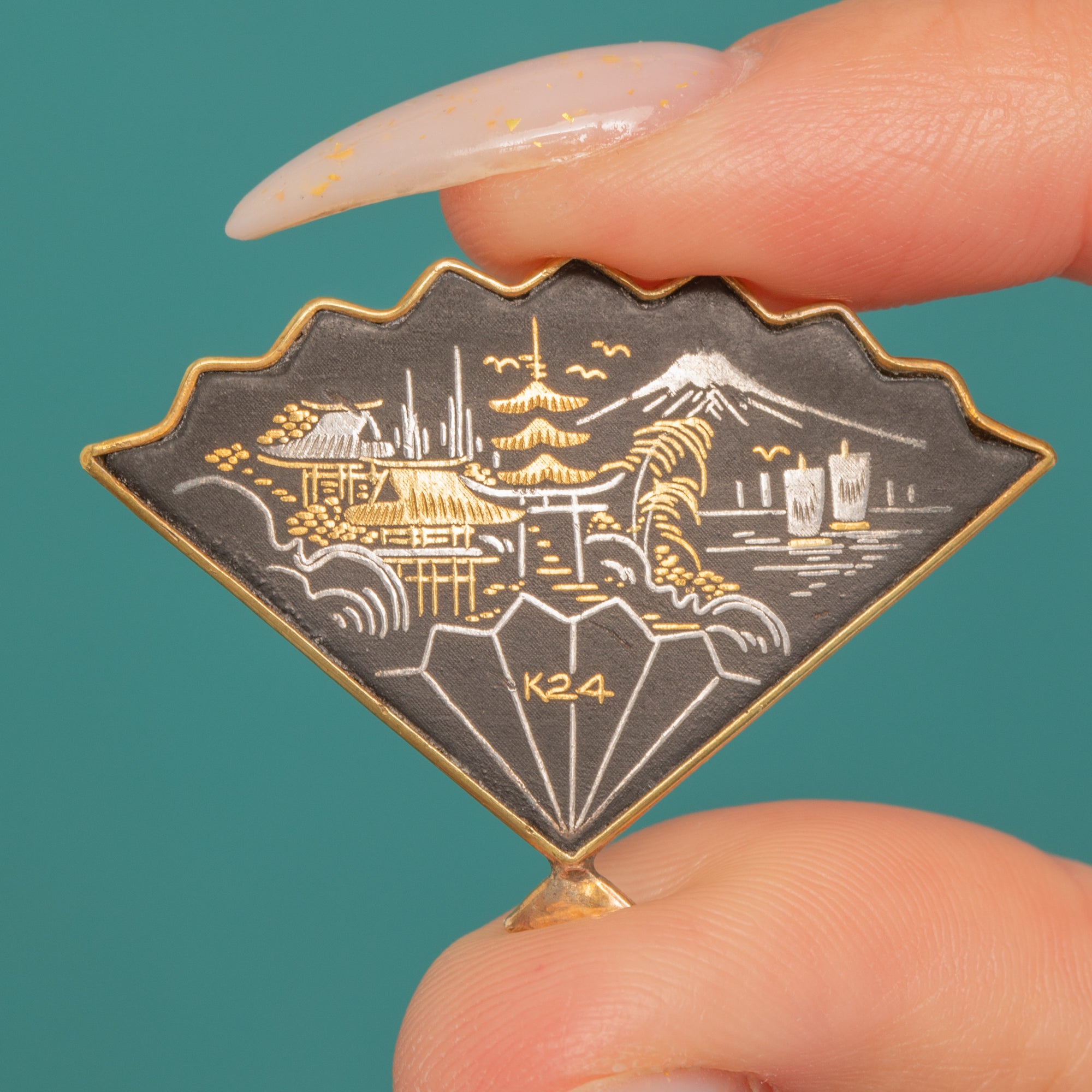 A charming Art Deco Japanese fan brooch rendered in Shakudo, the inky black patina enriched with delicate gold-toned linework of a stylised Mount Fuji landscape—pagoda, sailing boats, birds and rippling waves—framed by a slender gilt border and finished with a tiny drop finial. The pictorial scene is beautifully crisp, a miniature vignette that brings poetic serenity and refined artistry to a lapel or scarf.