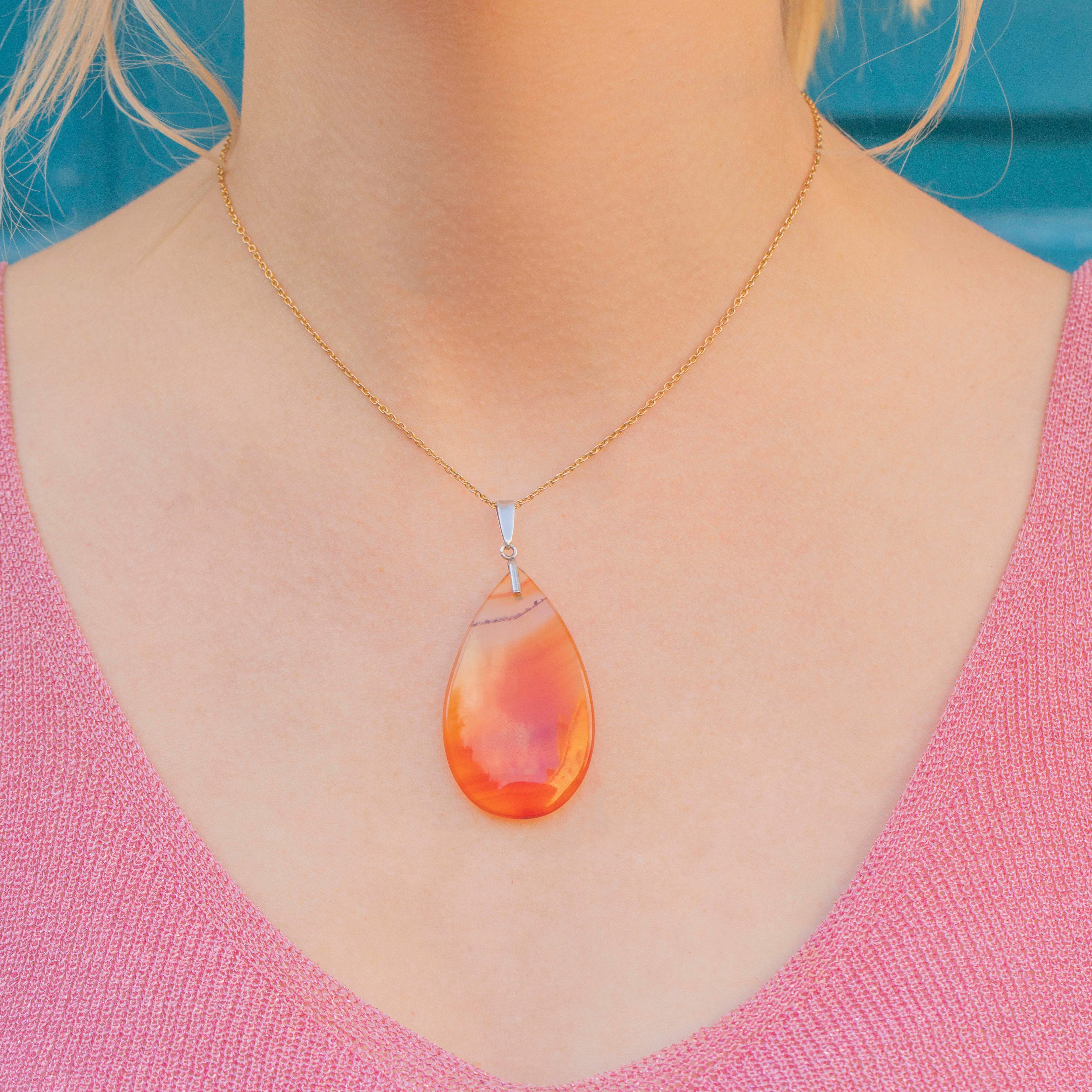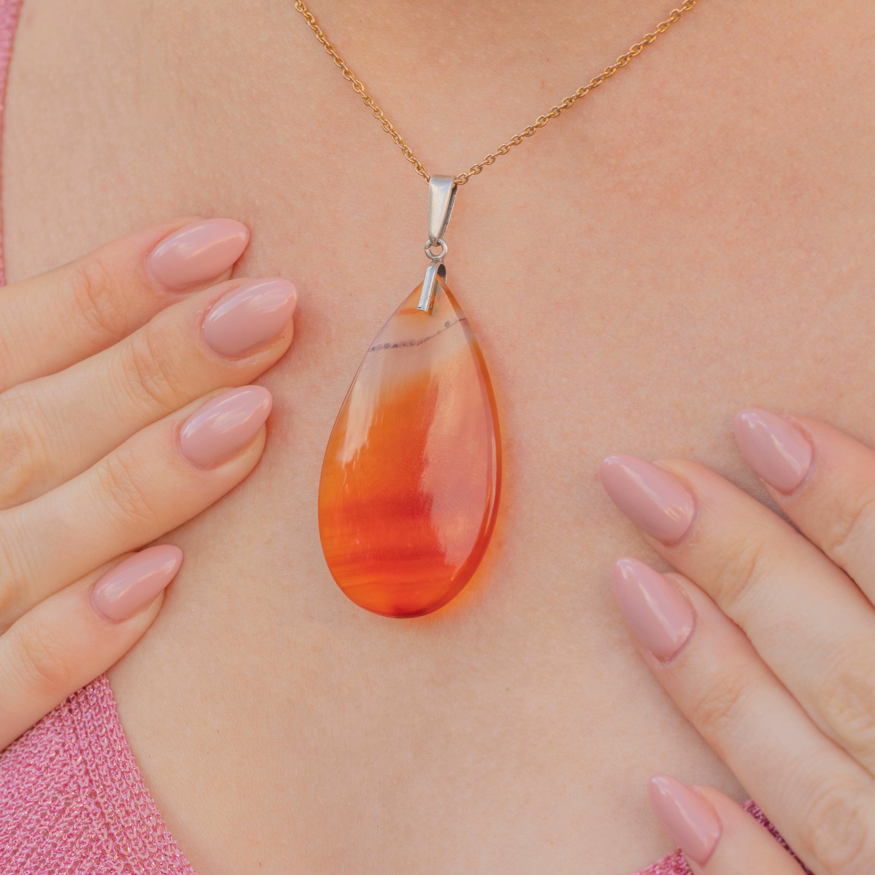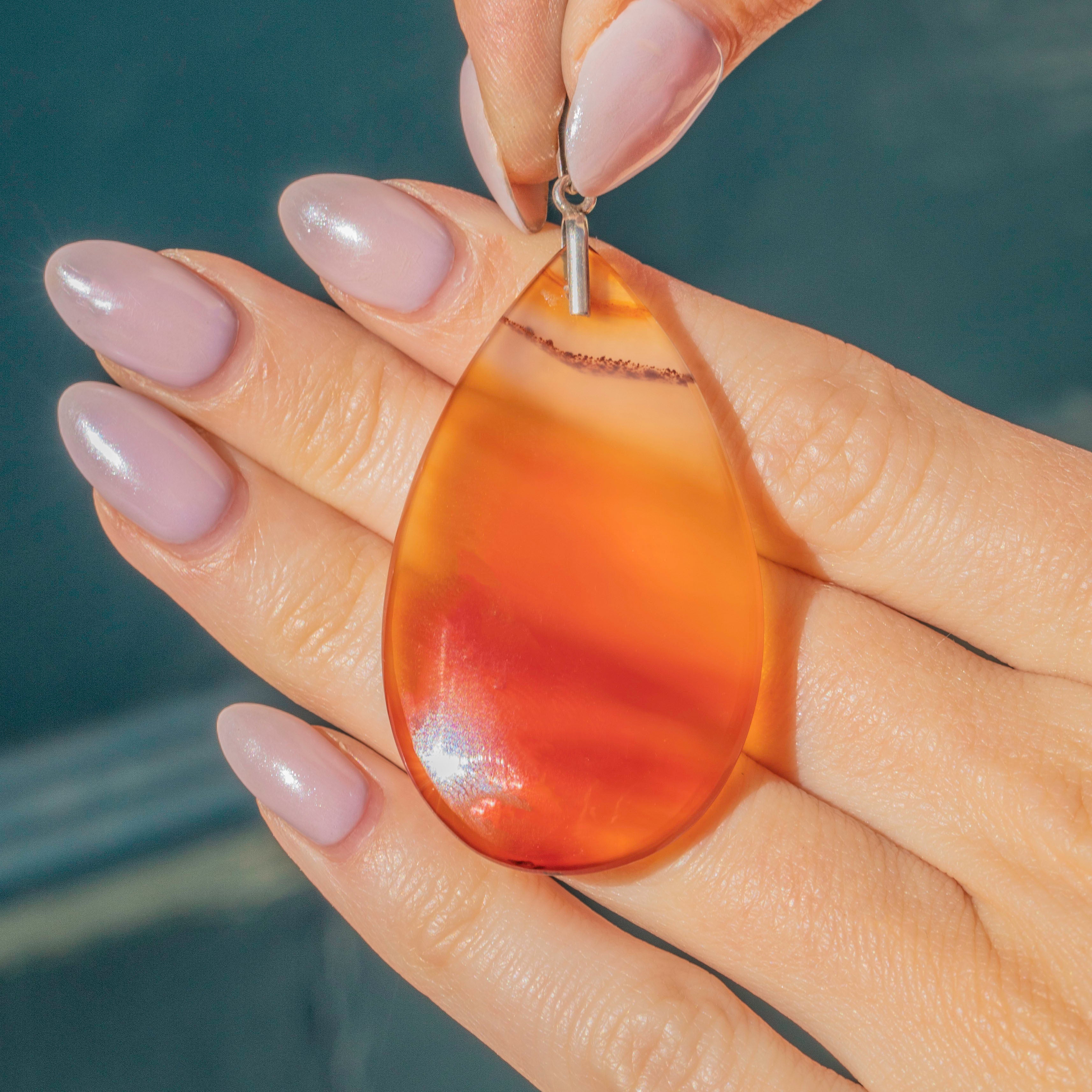 The teardrop shape is flattering, to say the least! The closer you look, the more the Agate reveals her several splendid layers, from sunset orange to deep mahogany brown to warm honey yellow, so she's perfect for year round wear.