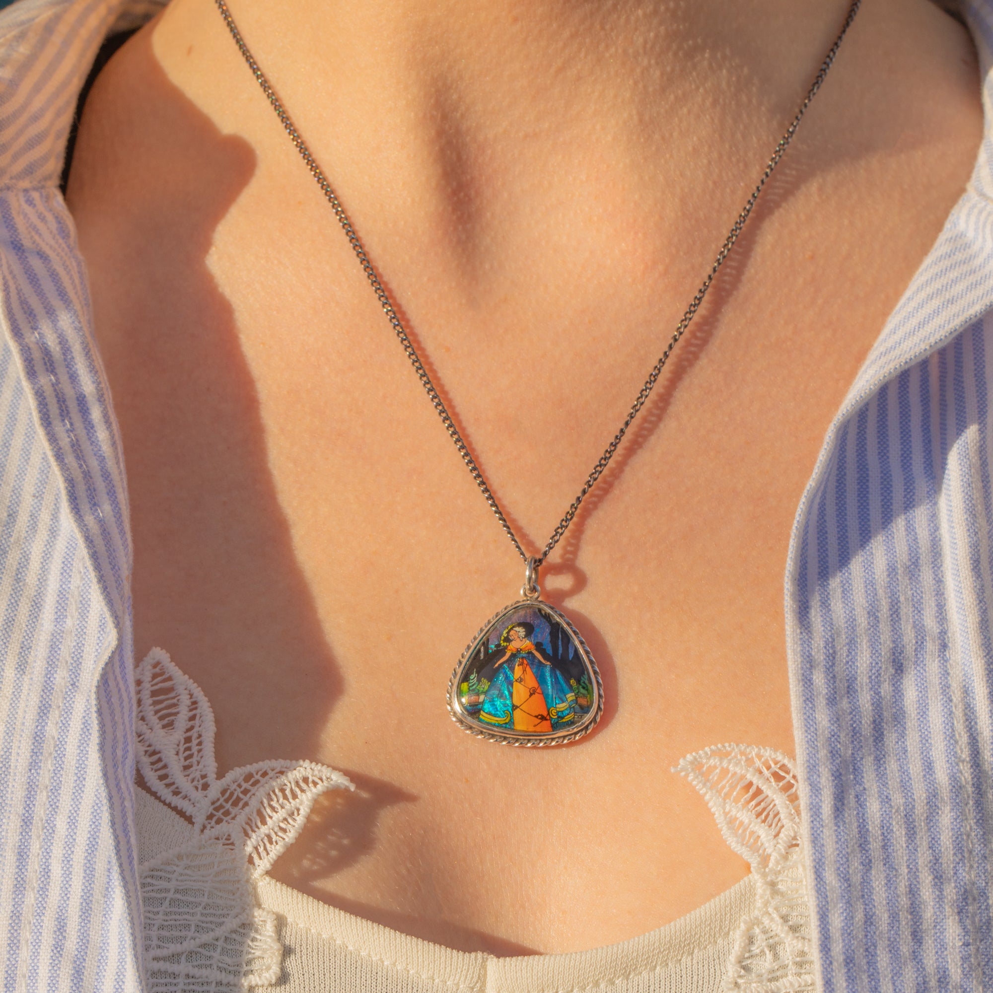 Bright shimmers of sky blue, turquoise, and deep ocean hues catch the light, sending an iridescent surge through the heart of the pendant.