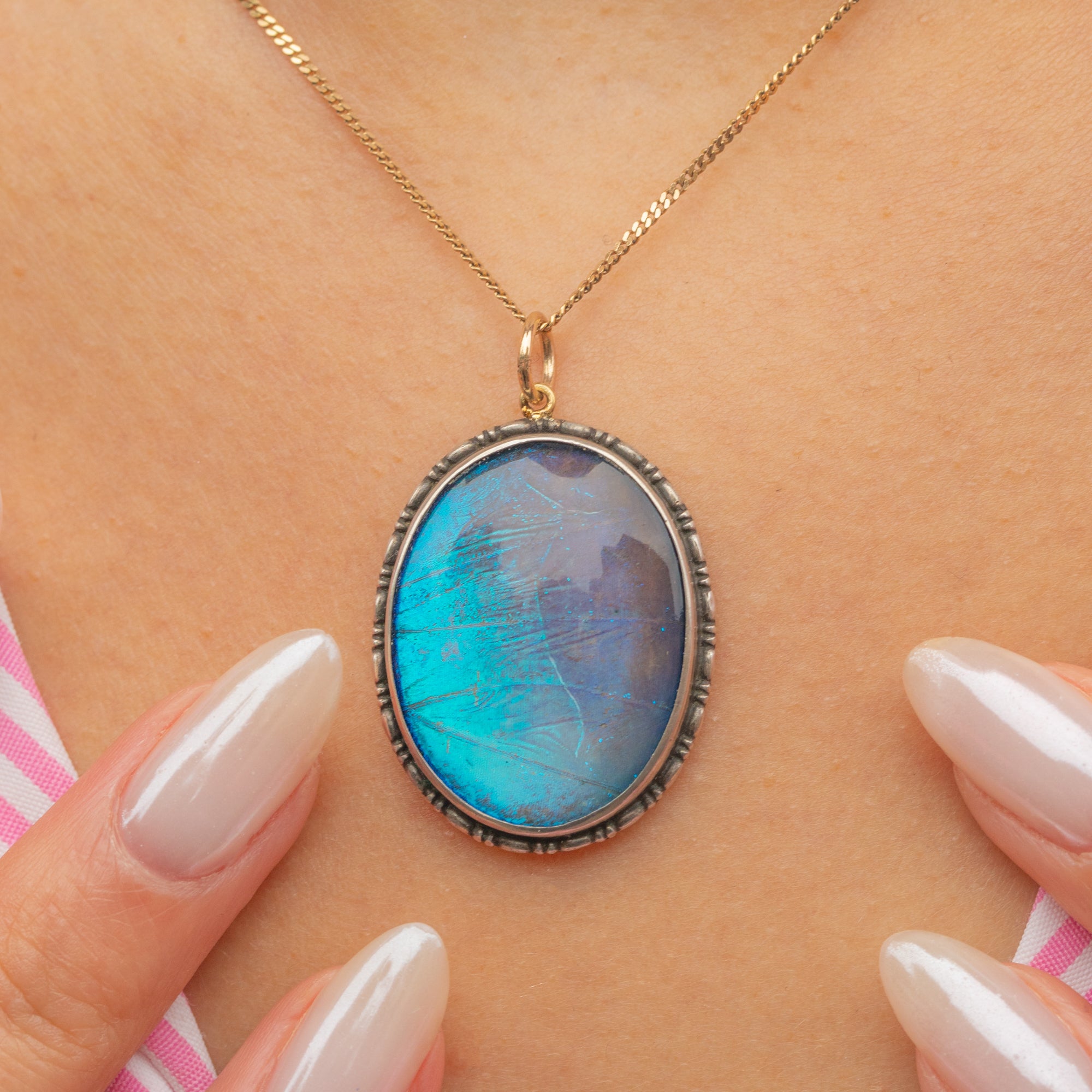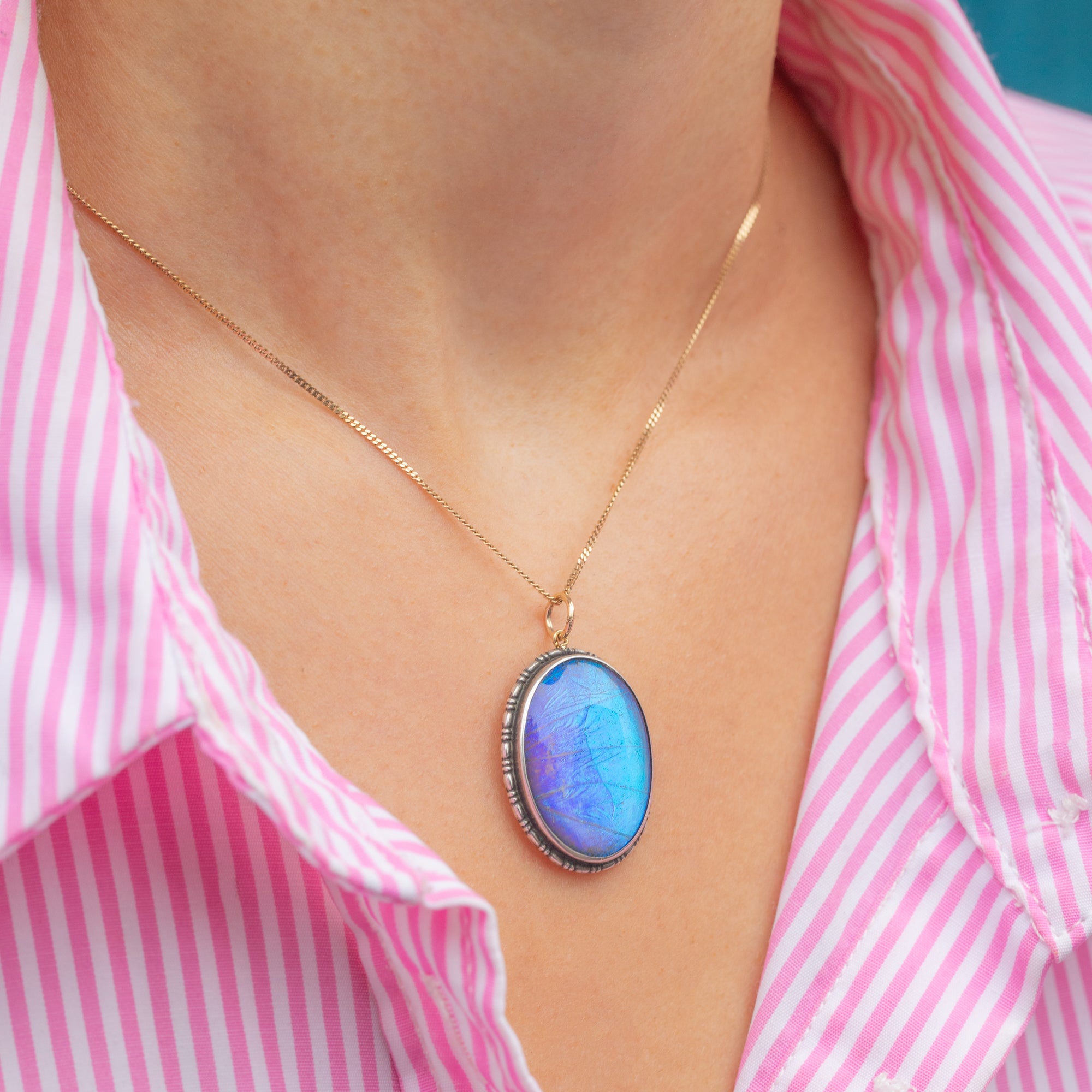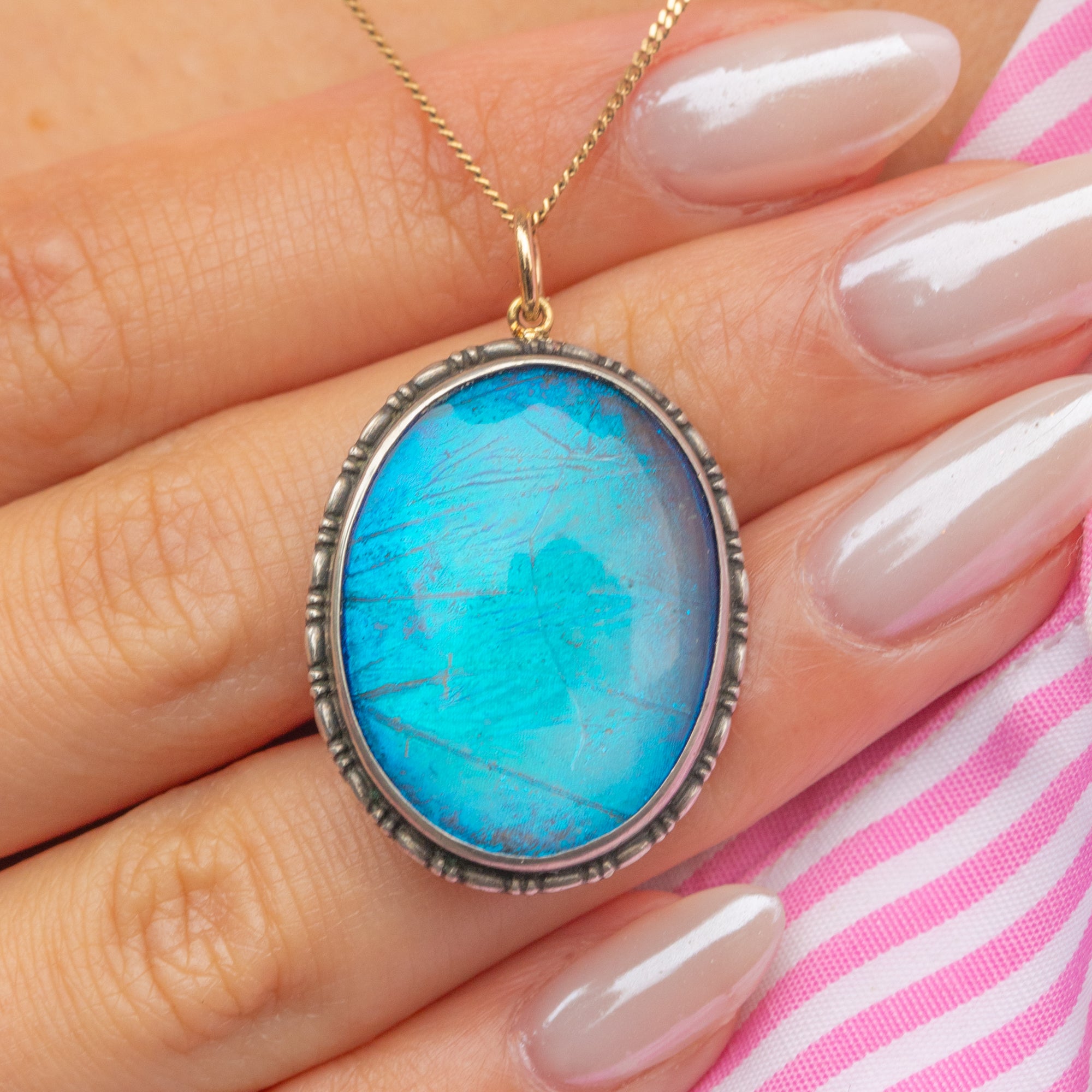This Art Deco Silver pendant showcases a prominent oval Butterfly Wing, displaying vivid iridescent hues that shift from blue to green and violet as it catches the light.