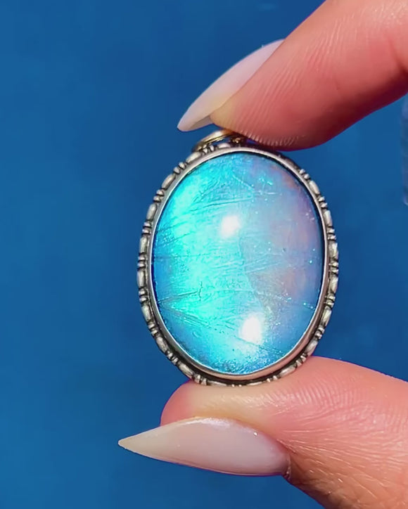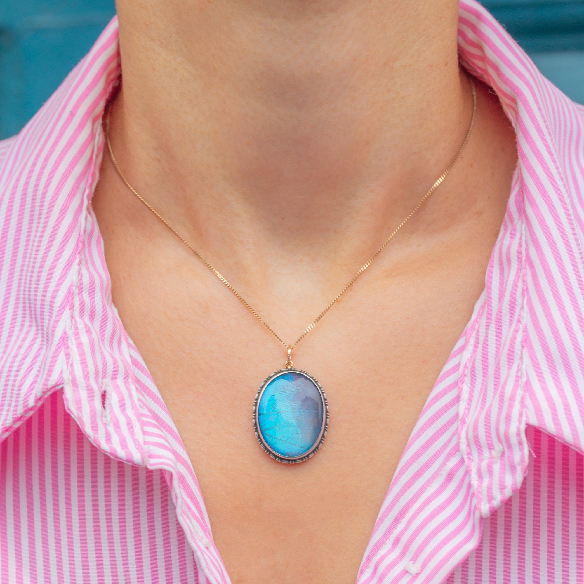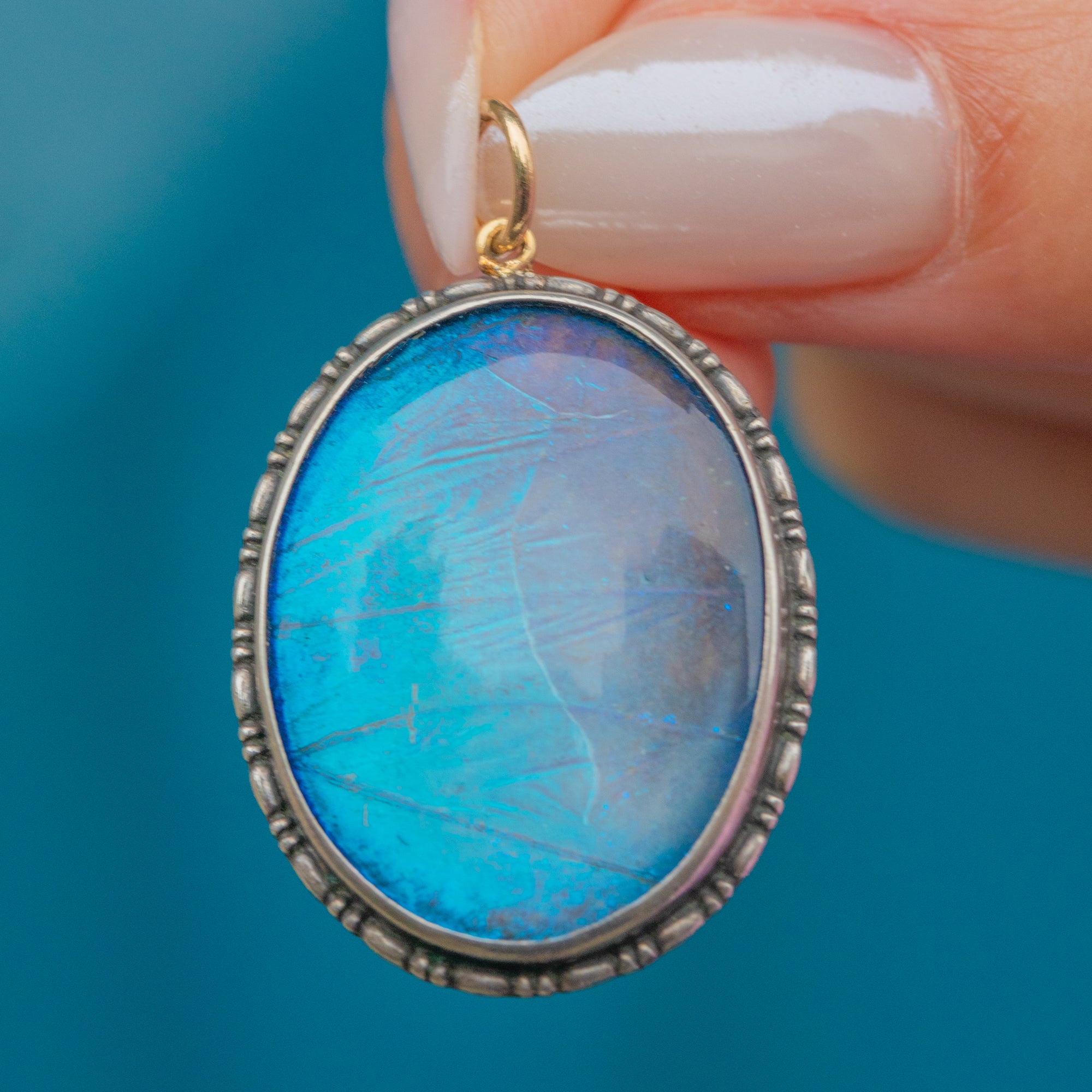 This Art Deco Silver pendant showcases a prominent oval Butterfly Wing, displaying vivid iridescent hues that shift from blue to green and violet as it catches the light.