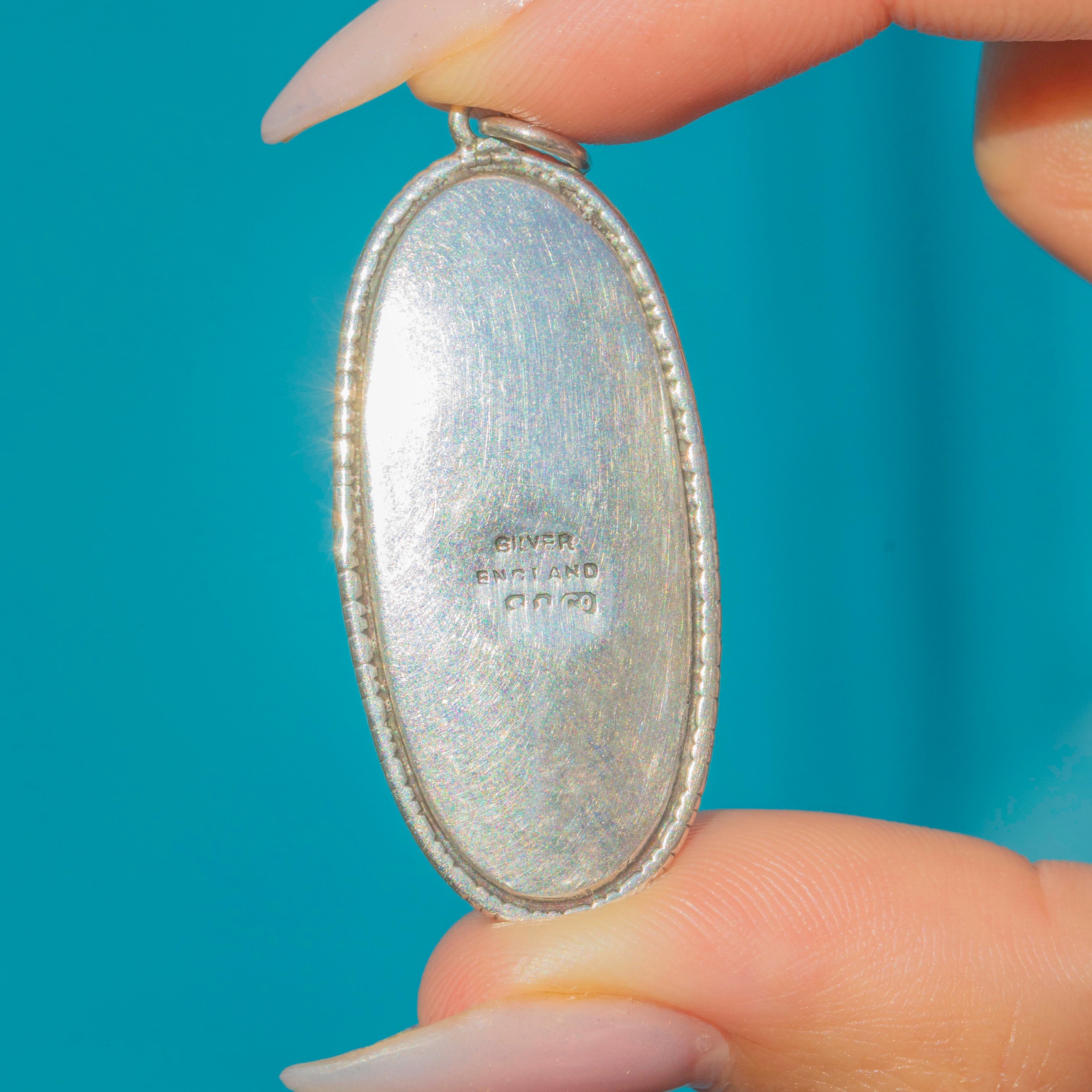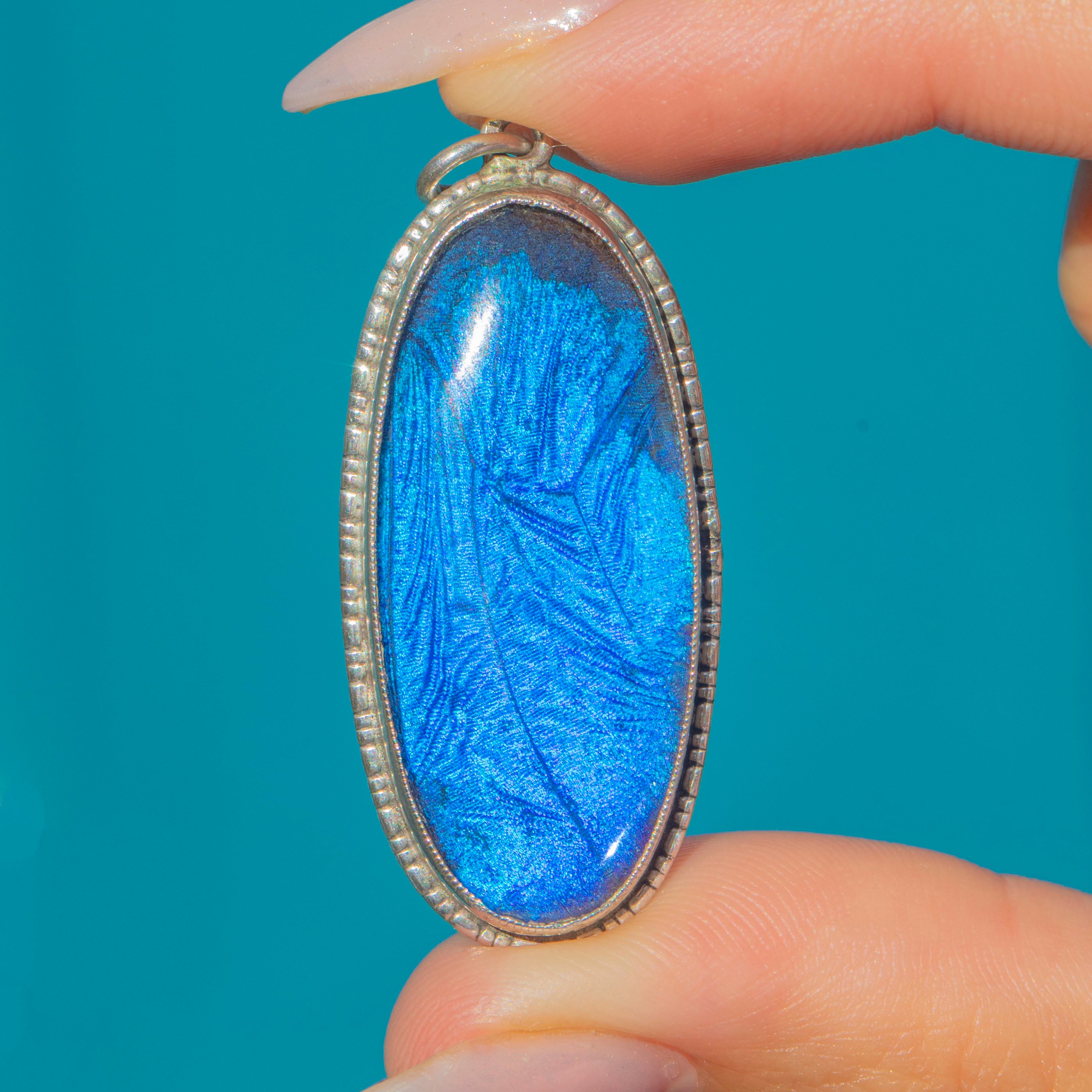 This striking Art Deco pendant captures the era’s love of colour and clean geometry, showcasing a vivid blue butterfly wing beneath a smooth oval cover. The wing’s natural iridescence shimmers from peacock teal to electric azure as it moves, framed by a crisp, beaded Silver bezel and a simple bale for everyday wear.