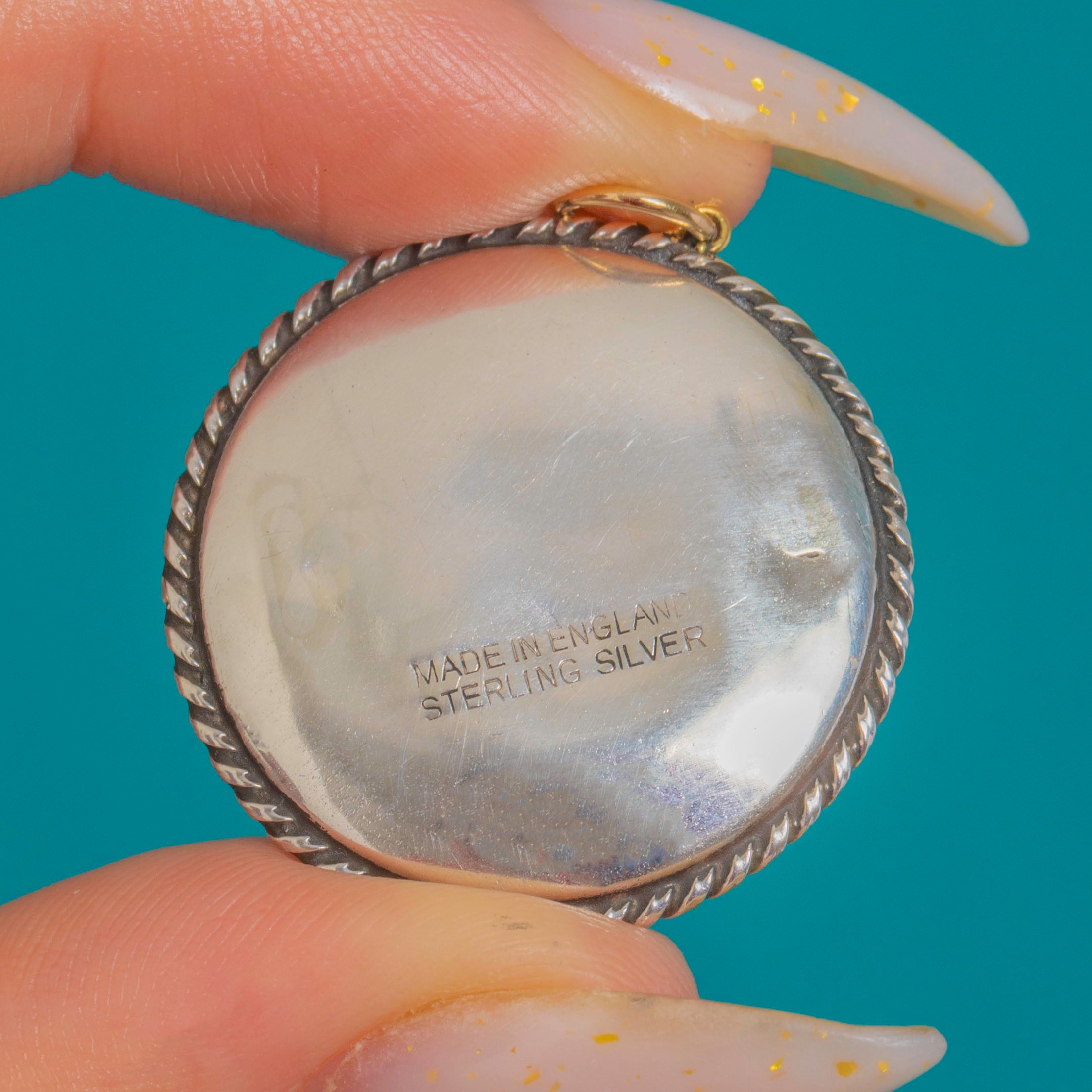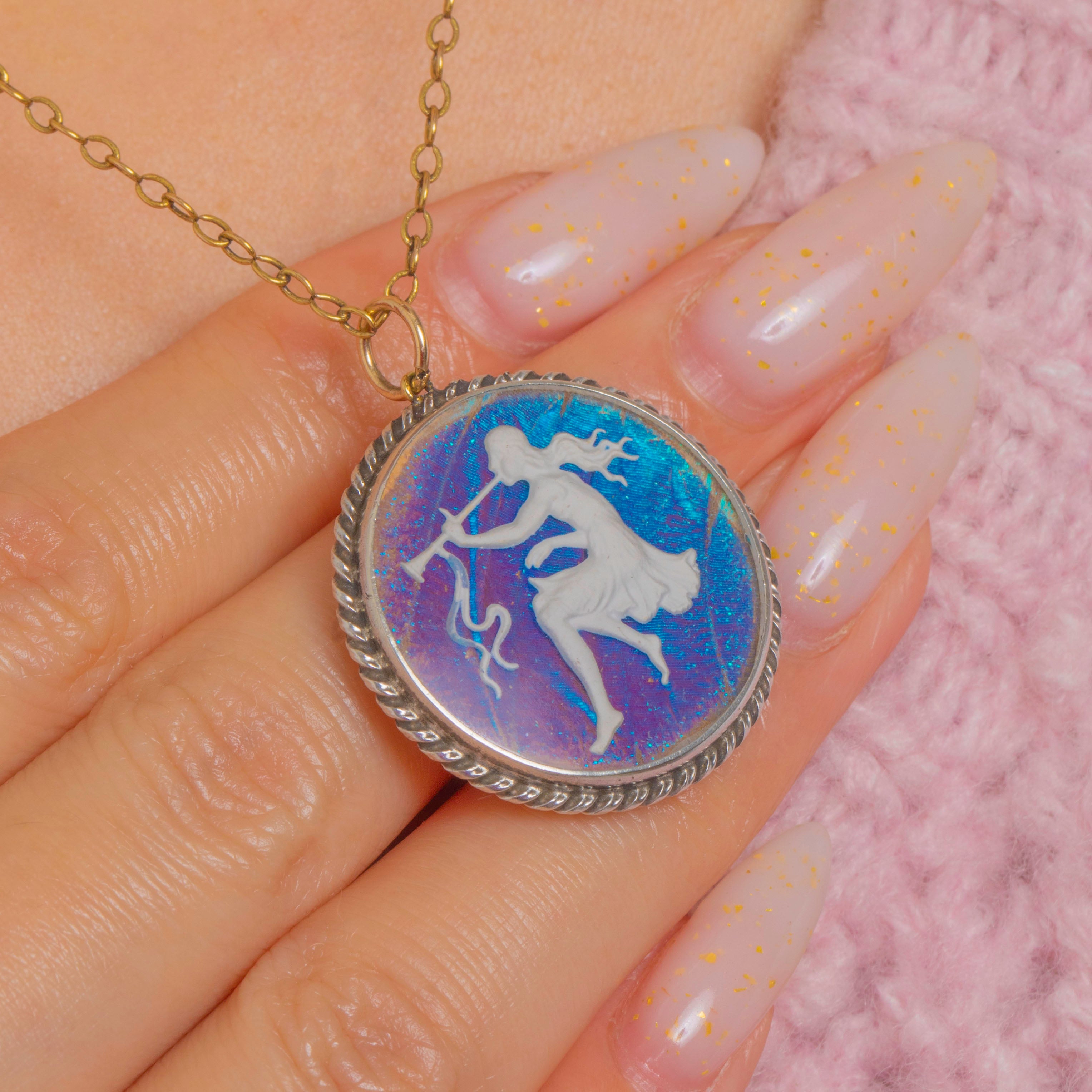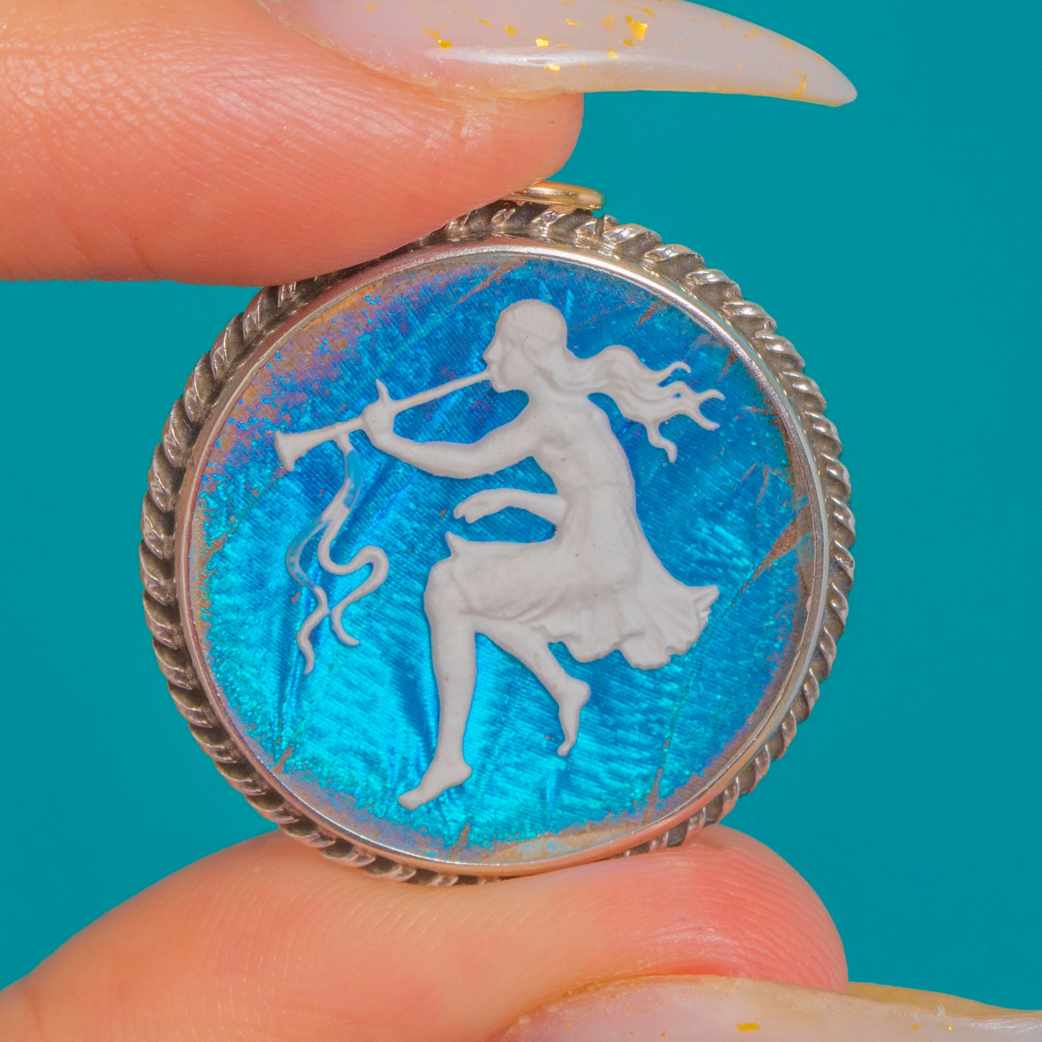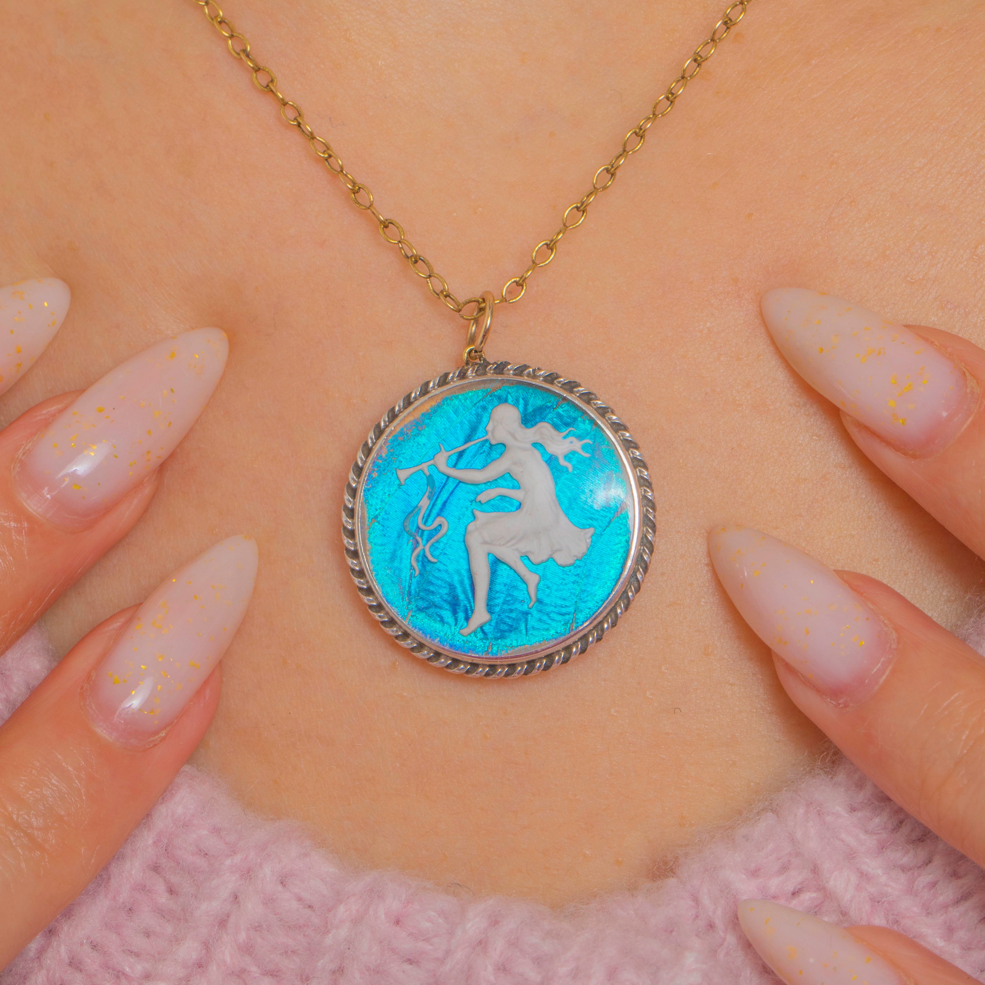 A radiant Art Deco butterfly wing pendant with a poetic twist. Crafted in Sterling Silver and stamped “MADE IN ENGLAND”, its iridescent Morpho Butterfly wing shimmers from aqua to blue‑violet, creating a luminous stage for a crisp matte white relief of the Goddess Pheme in graceful motion. A tactile twisted‑rope bezel frames the scene, adding texture and a refined vintage flourish.