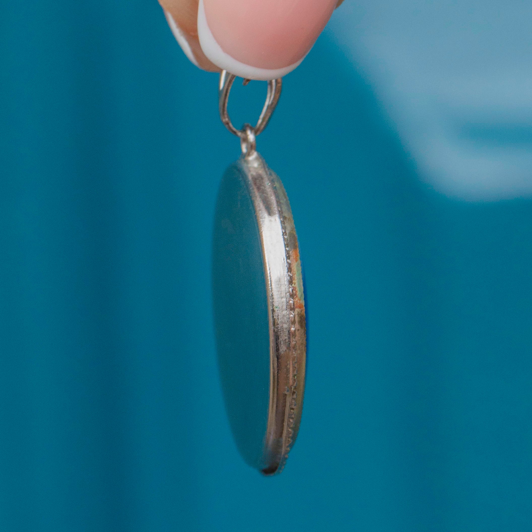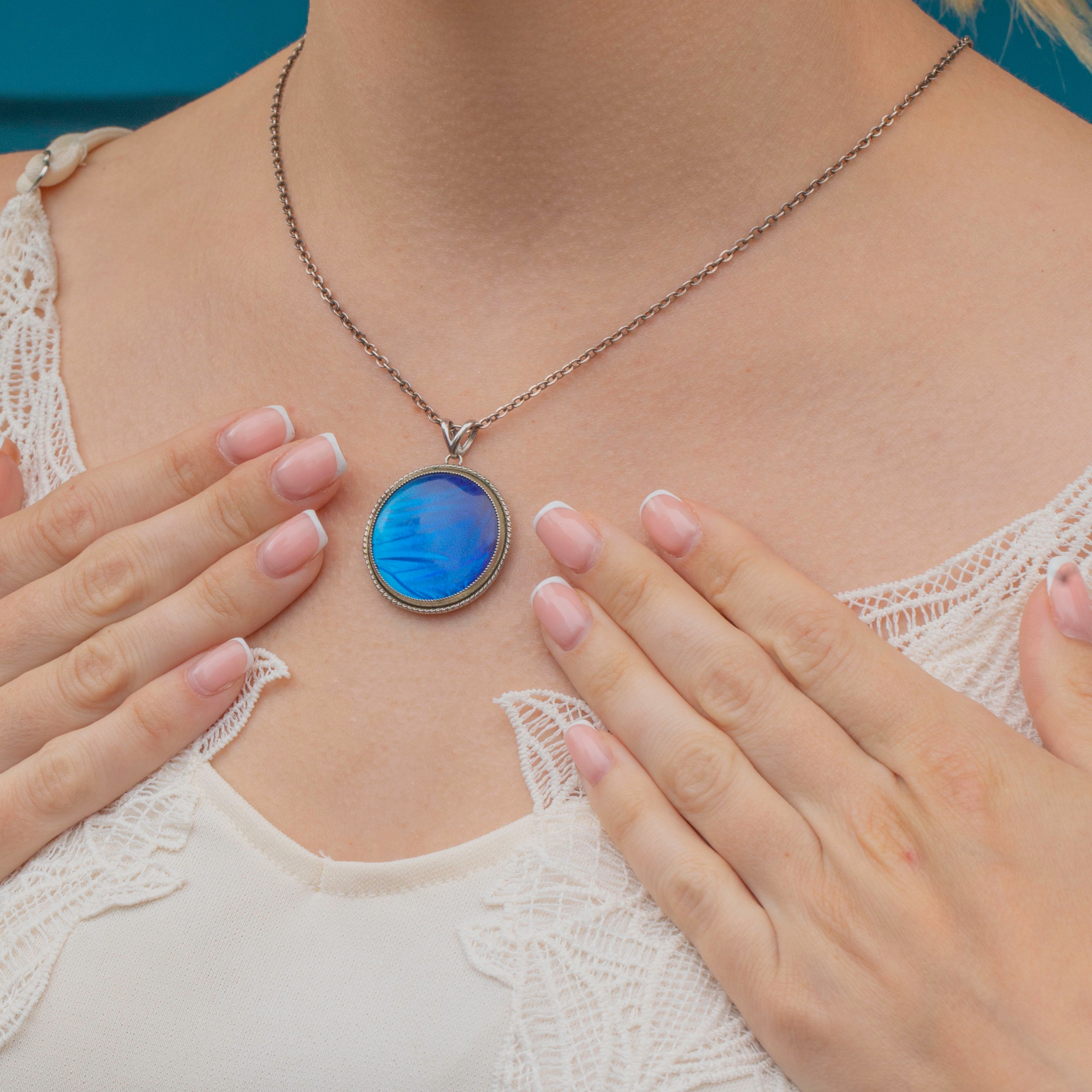 You will instantly become mesmerised by this Art Deco Silver round butterfly wing pendant! Presenting a bright and iridescent shimmer, this highly collectible pendant is the perfect piece to connect you to the Art Deco period!