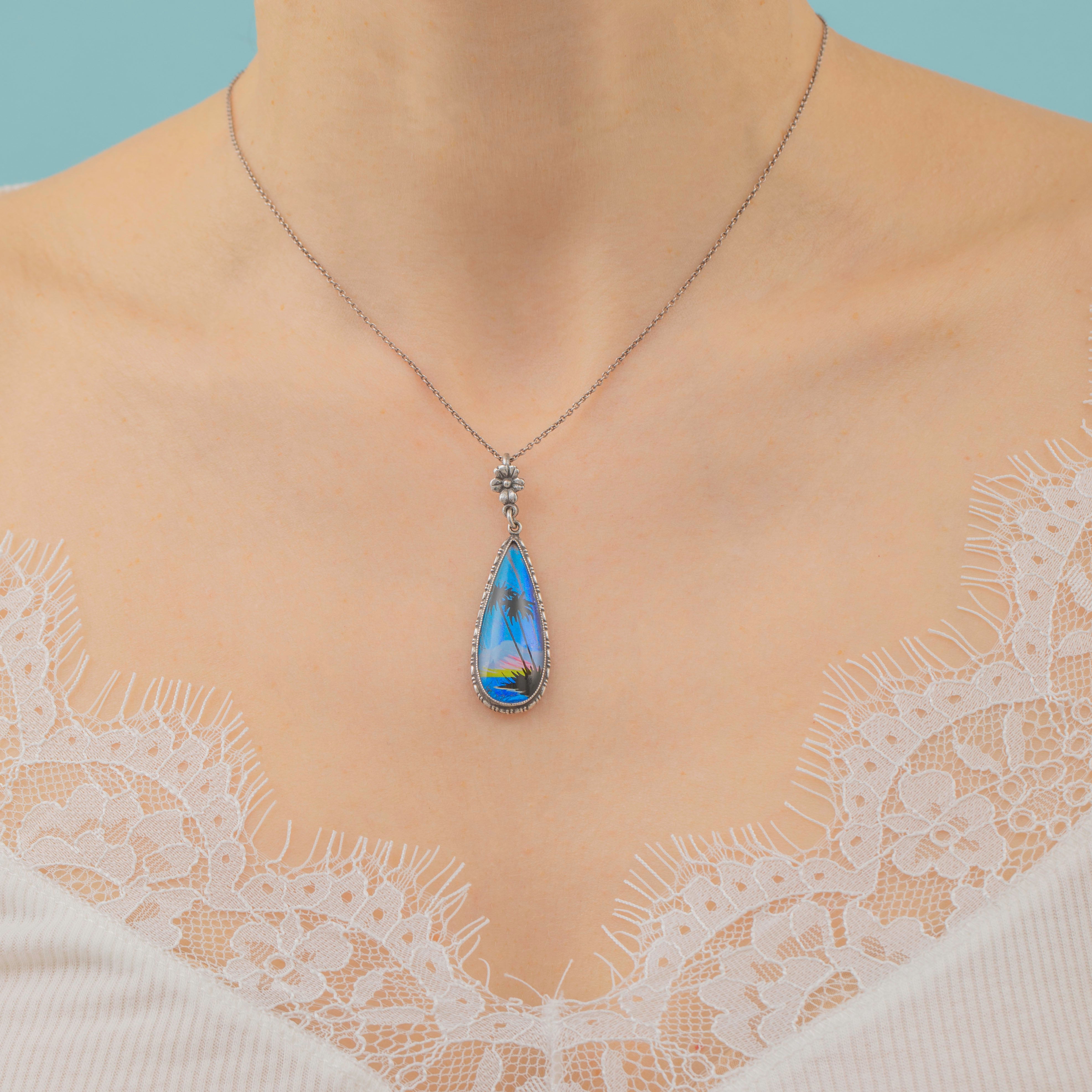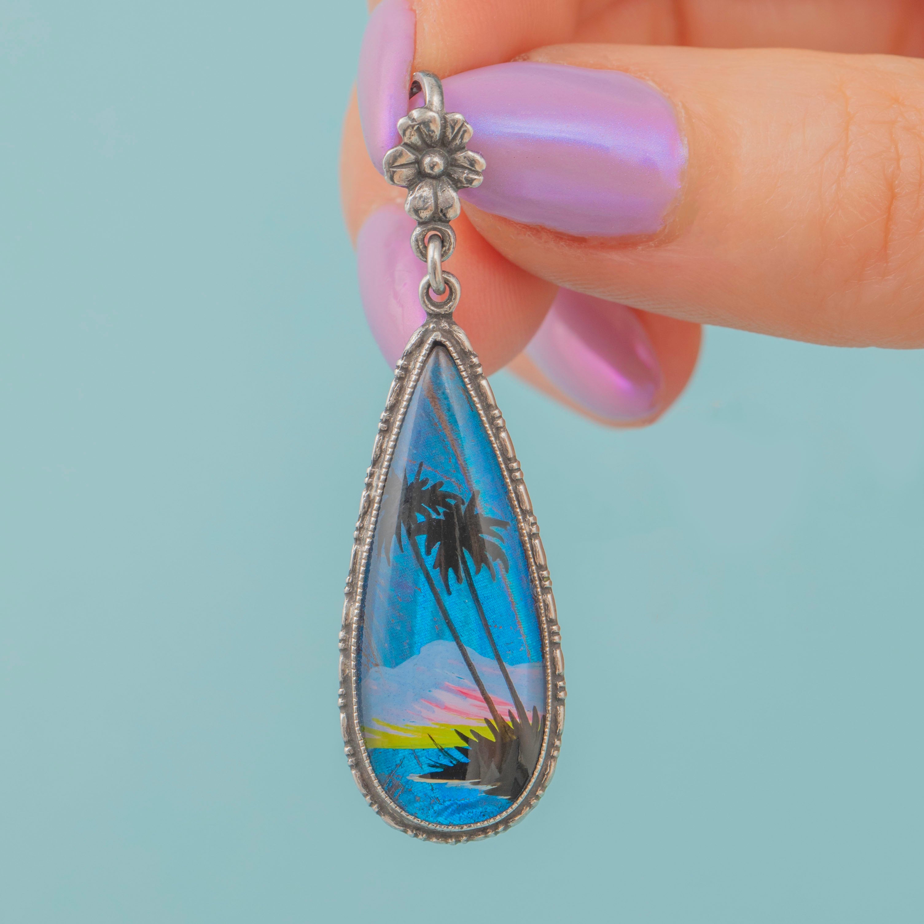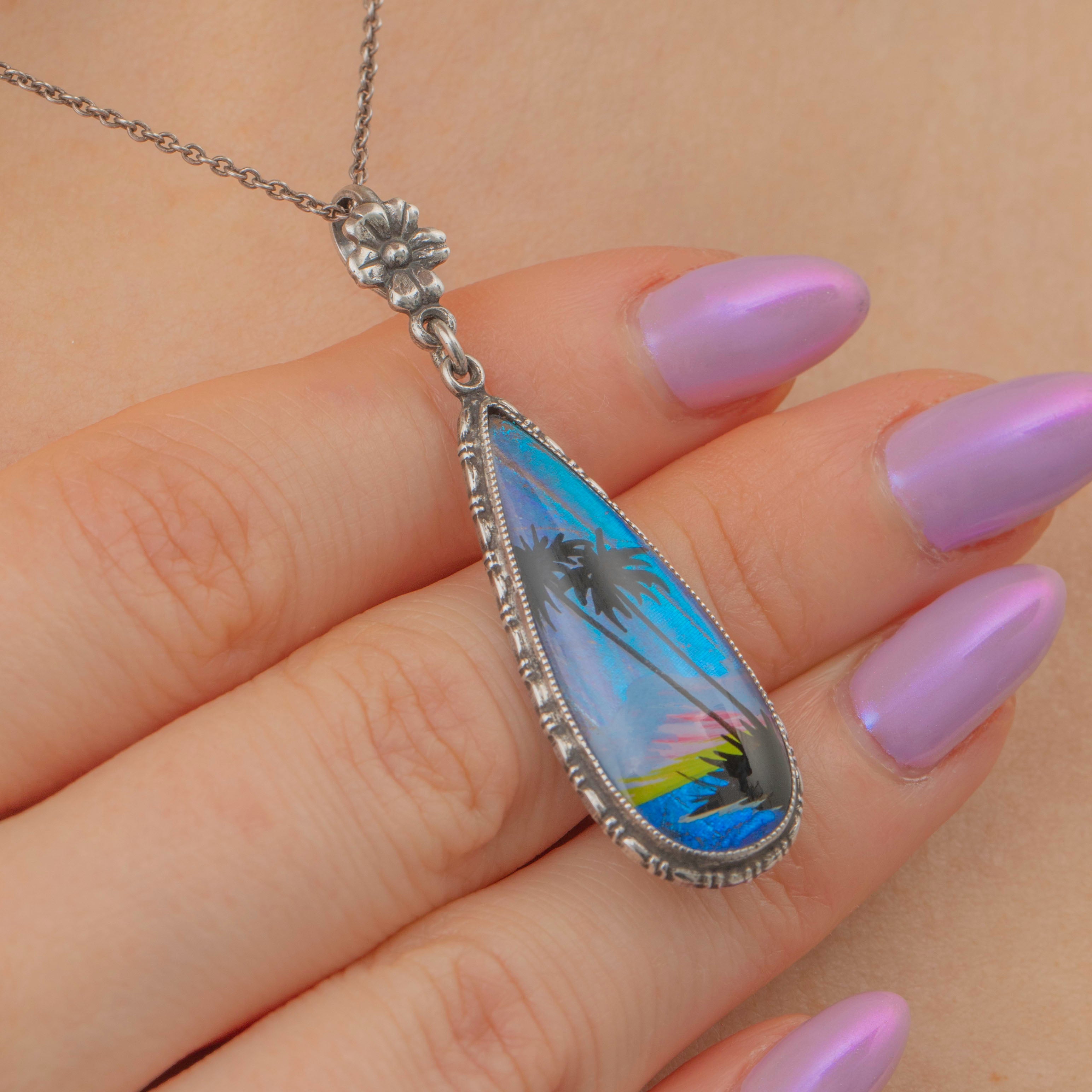 Art Deco Silver Butterfly Wing Tropical Scene Pendant, Thomas Mott