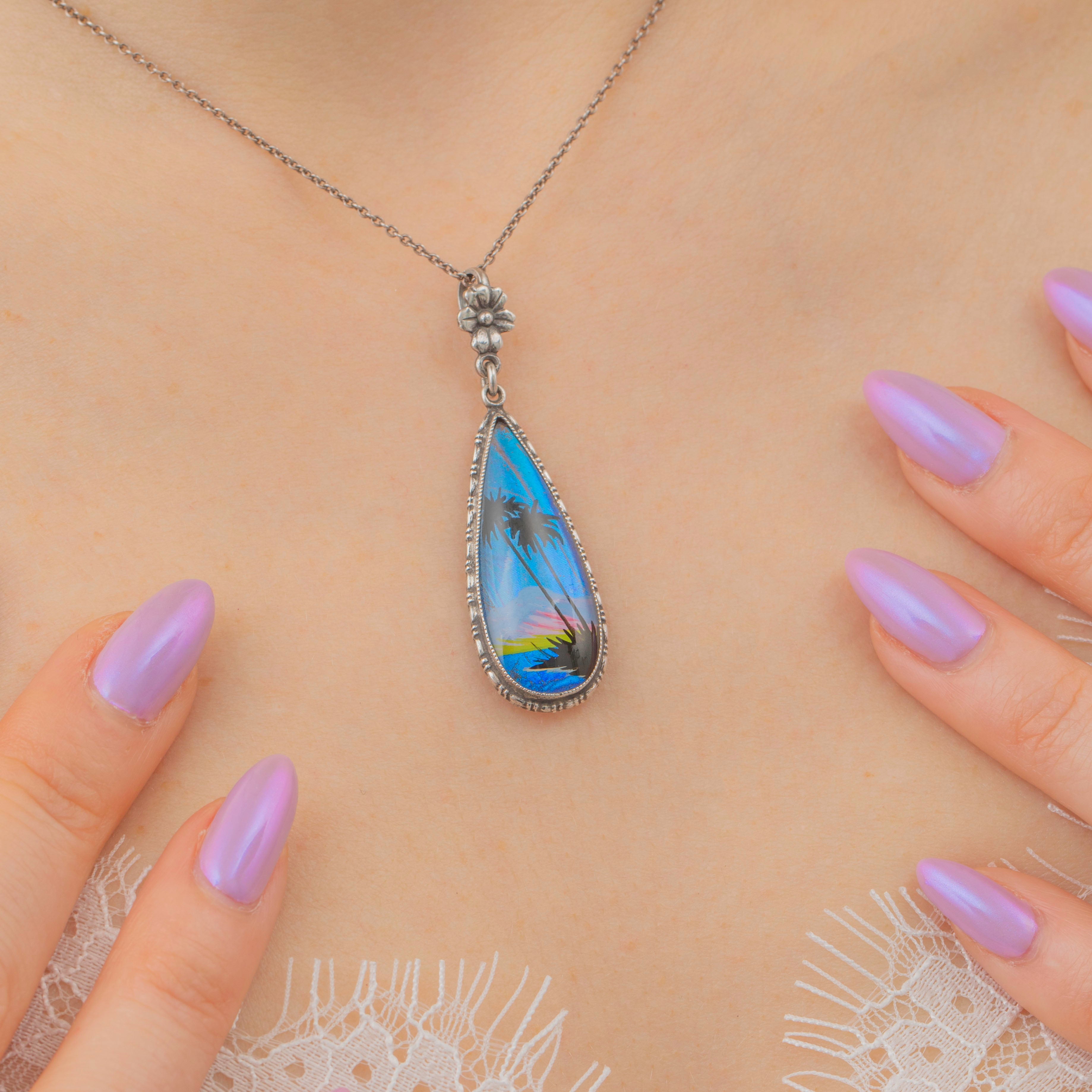 This Art Deco Silver butterfly wing pendant will instantly elevate your look! Attributed to the renowned Art Deco jeweller Thomas Mott, this drop pendant contains a precious Morpho butterfly wing, instantly identifiable by its beautiful blue luminescence.