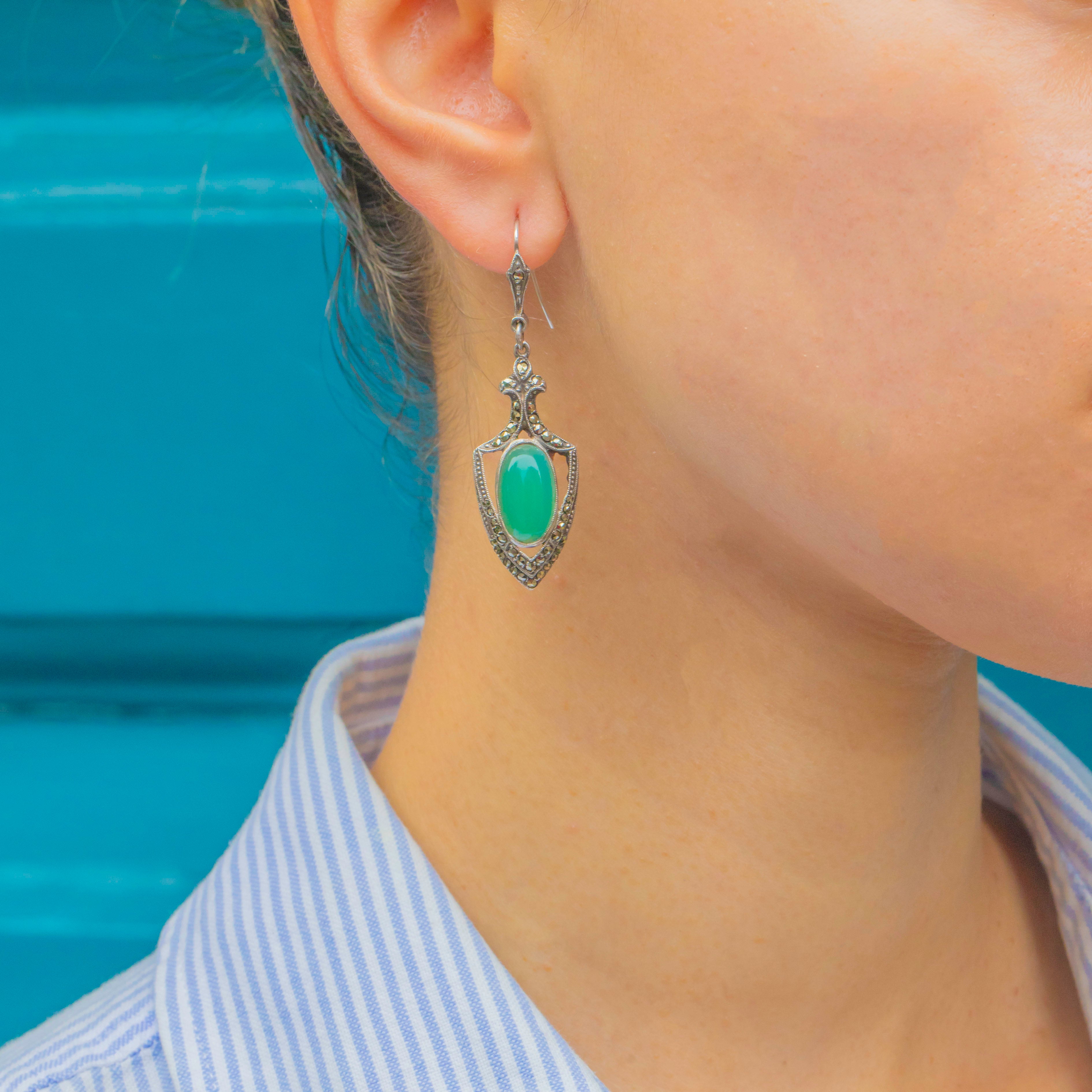 The Chrysoprase gemstones glow with their signature bright green hue, bringing a refreshing pop of colour that contrasts beautifully with the darker sparkle of the Marcasite. Lightly elongated, these earrings are designed to flatter the jawline and catch the light with every movement, embodying the confident glamour of the era.