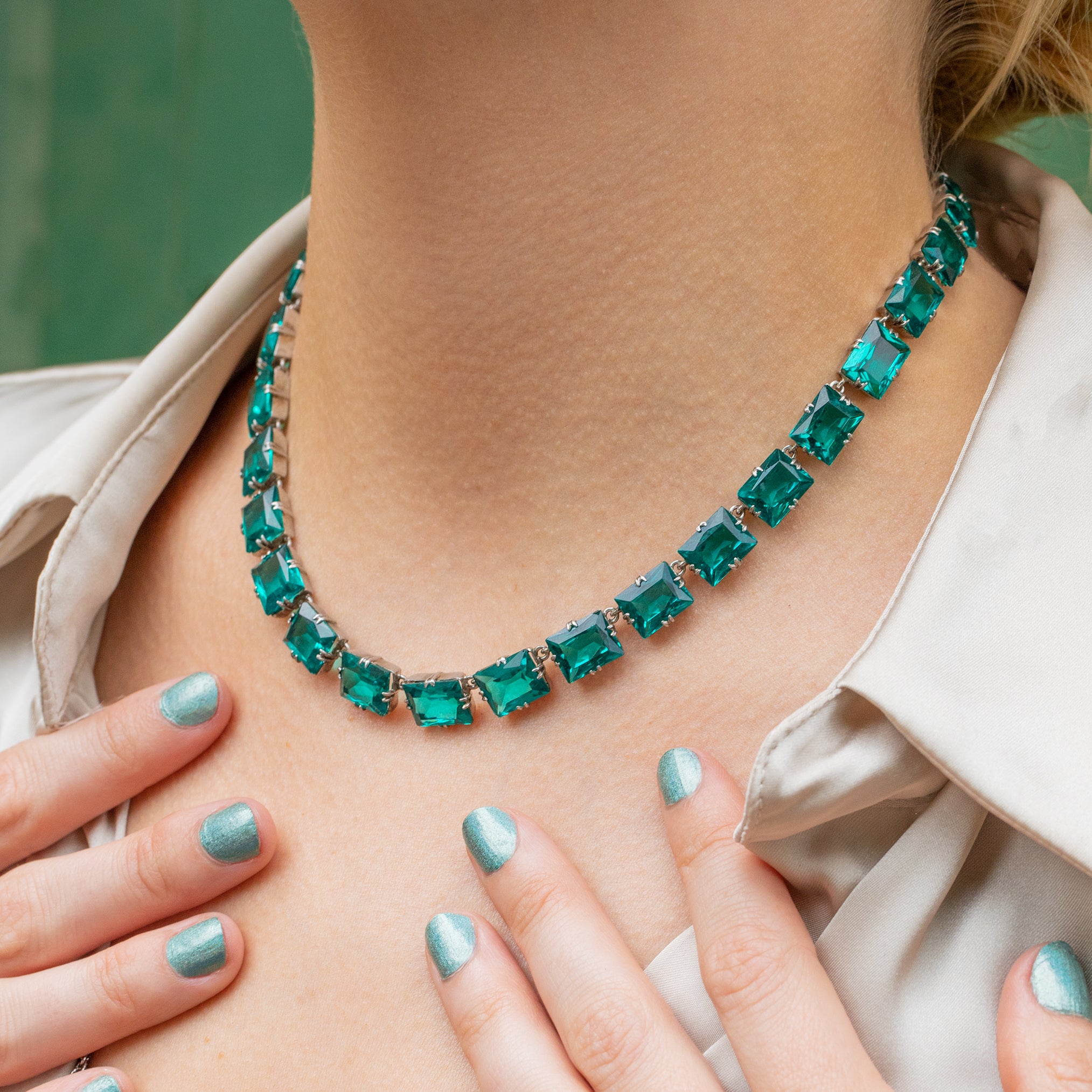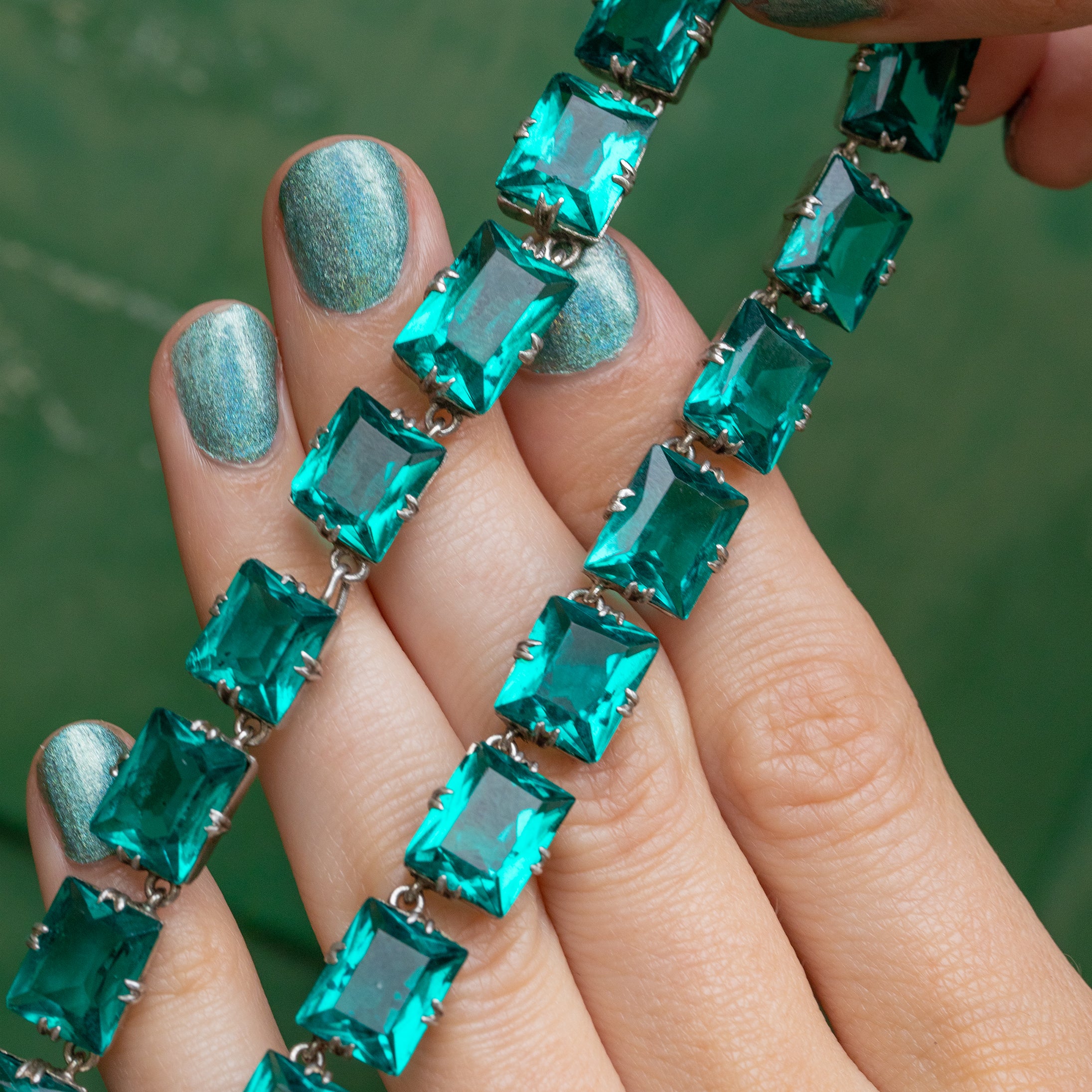 With an electric colour the Art Deco Green Paste stones are vibrant and eye catching, sure to bring a joyful pop to your jewellery collection. At 15 inches, Art Deco Riviere necklace is perfect for stacking or wearing solo meaning you can style her until your heart's content!