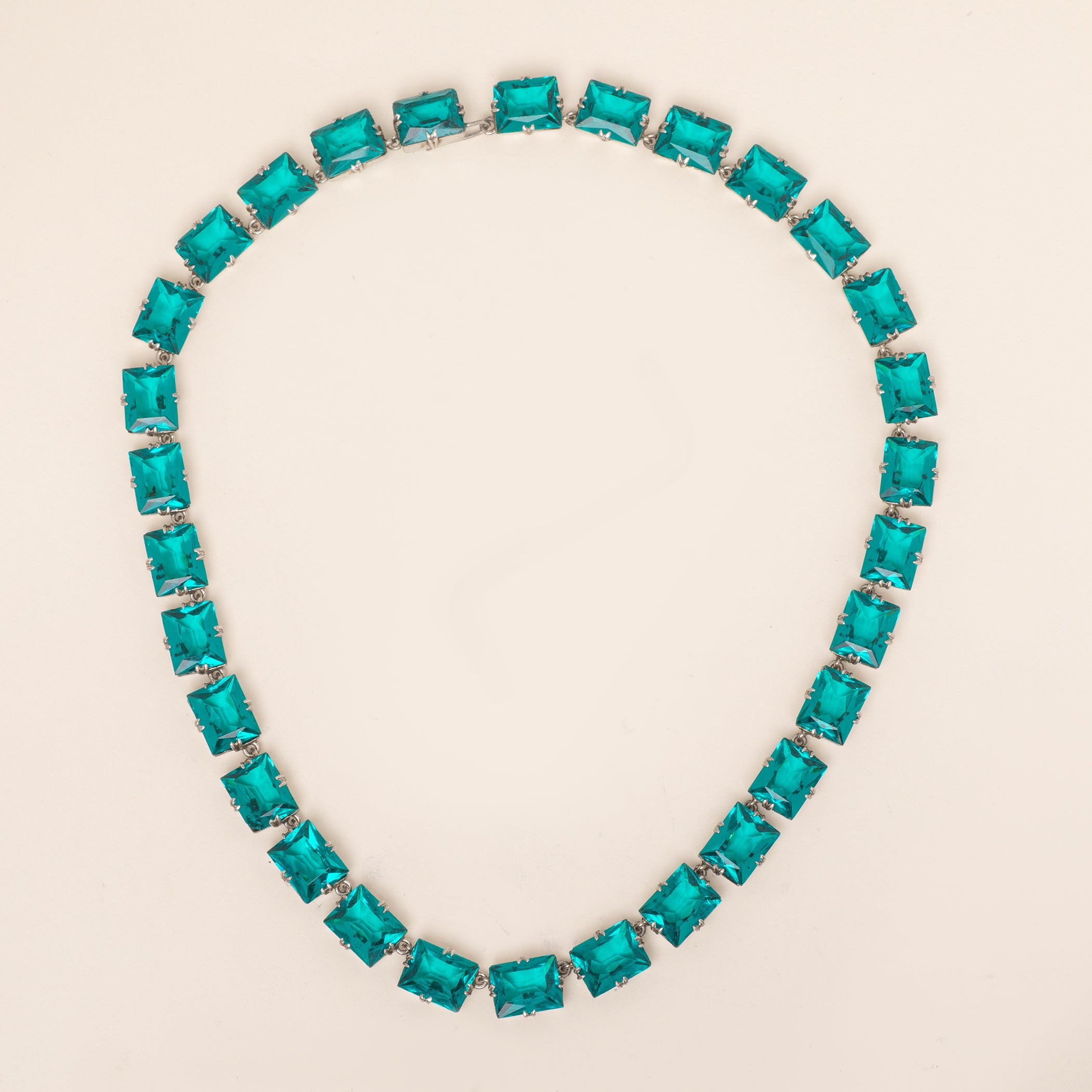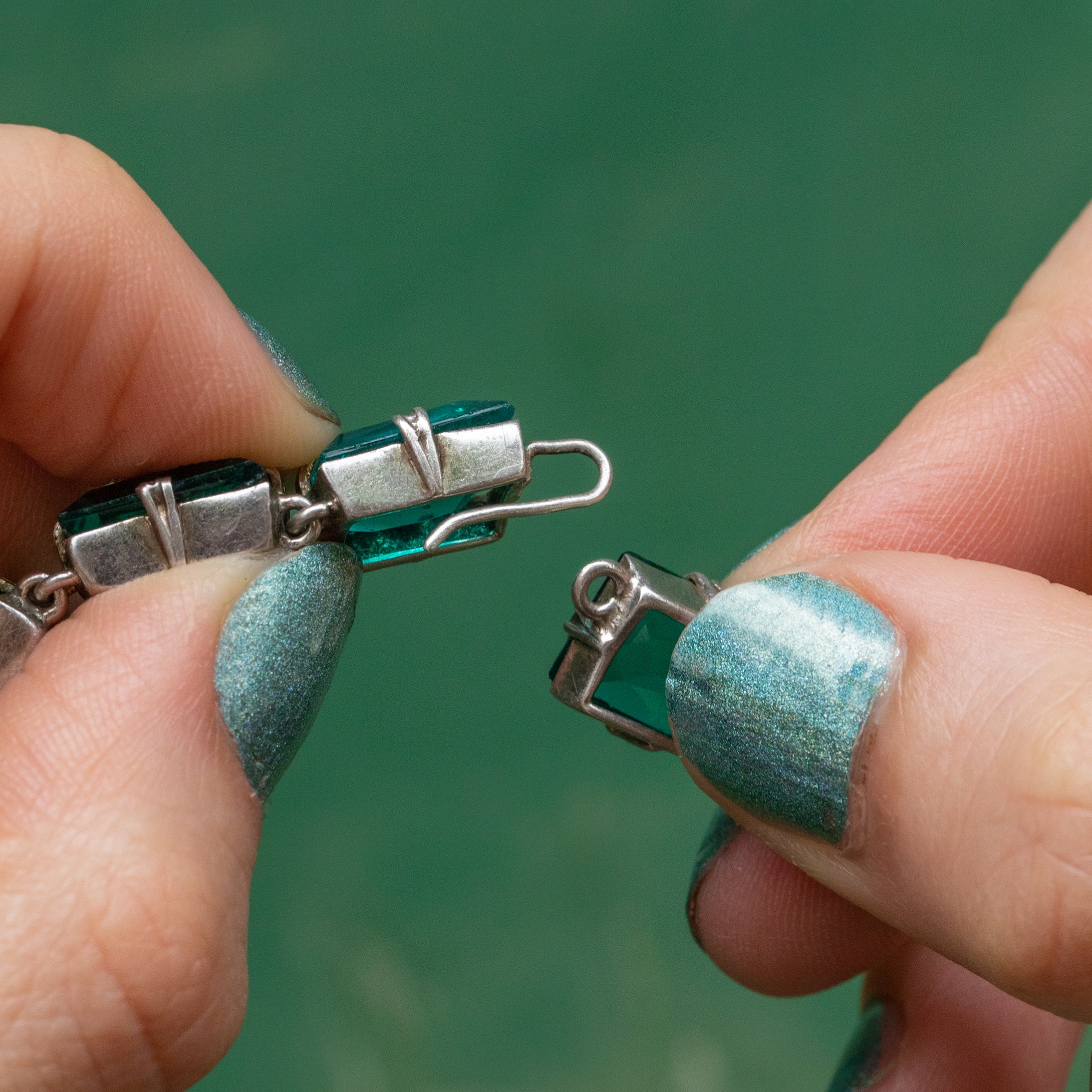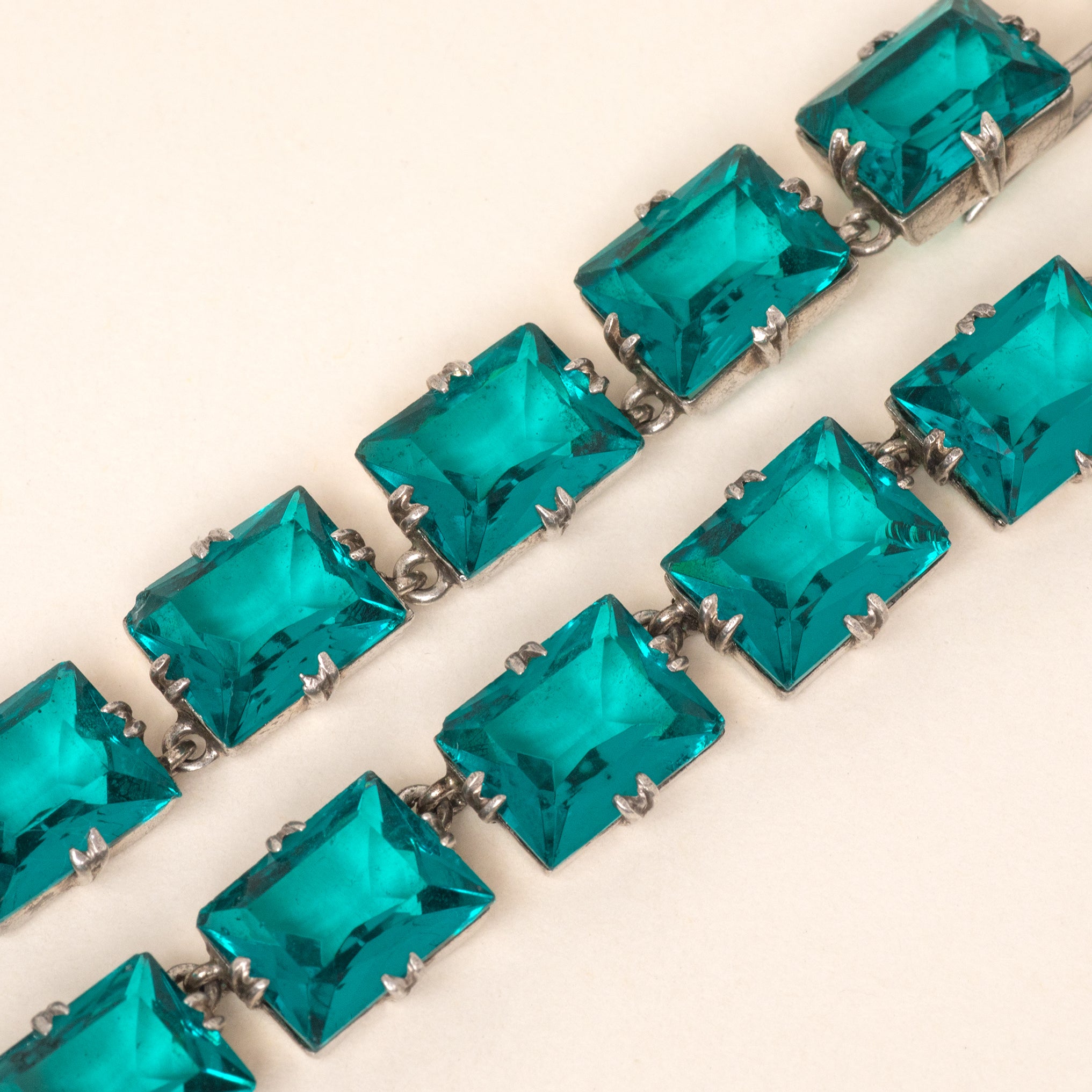 This Art Deco Silver Green Paste Riviere necklace is nothing short of jaw of dropping. Crafted from resplendent Sterling Silver this piece is quintessentially Art Deco and will be sure to take you back to the glitz and glamour of the 1920s.