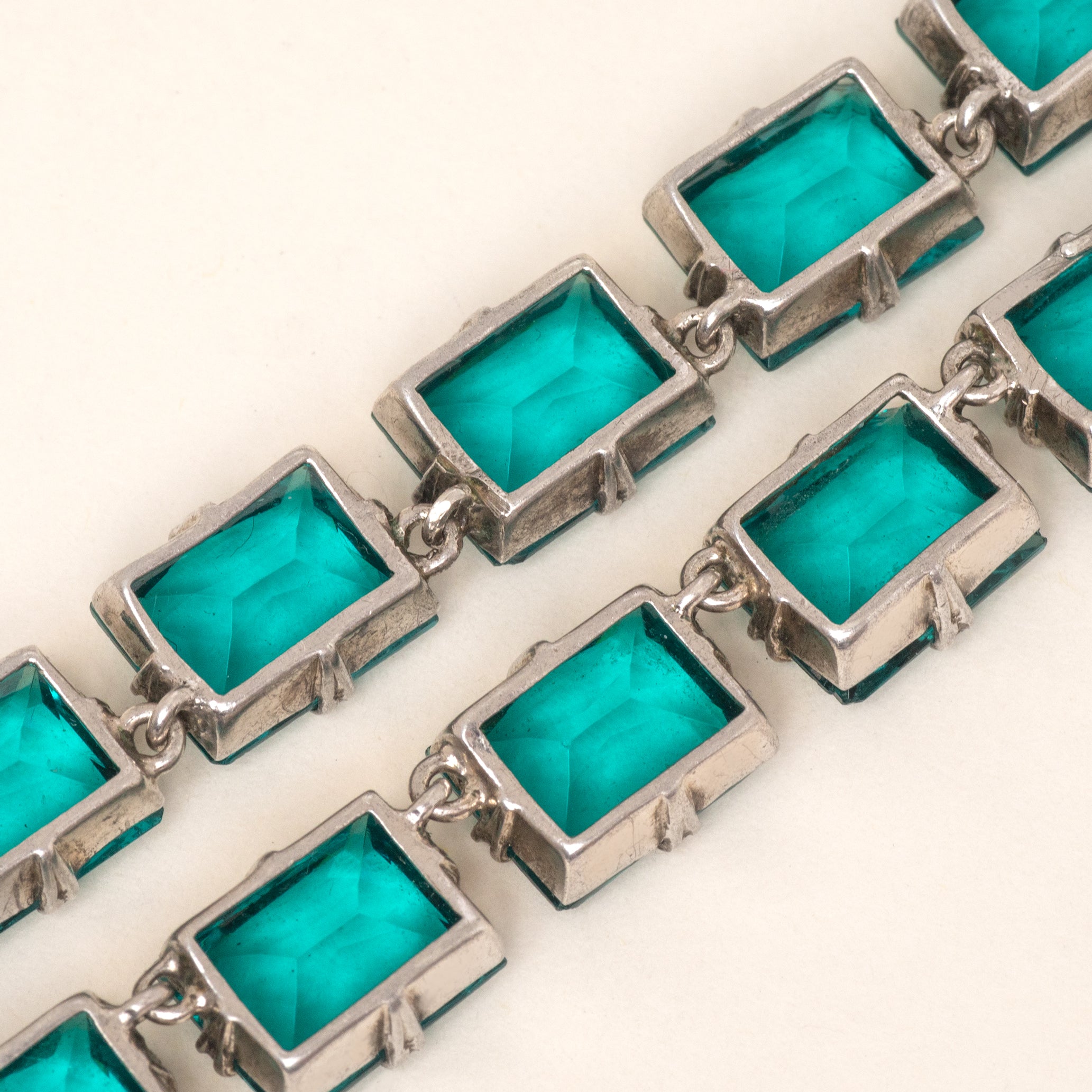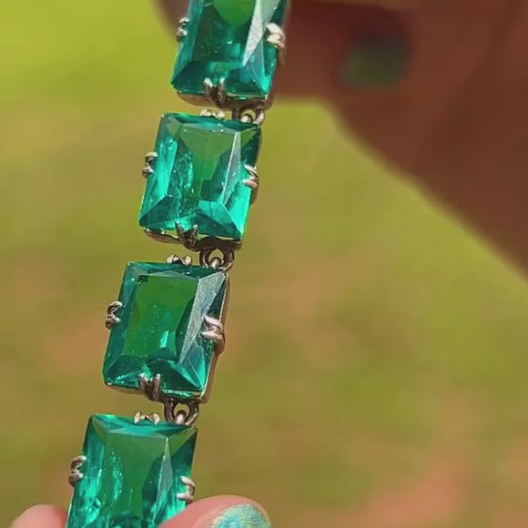 EXCELLENT: This Art Deco Silver Green Paste Riviere necklace is in excellent condition. Her stones are uniform and set securely, while her Sterling Silver is well preserved and durable. Free from marks, chips and signs of ageing, the green Paste is superbly crisp. The hue a rich forest green that's full of intensity and life! Boasts the same excellent condition now as 100 years ago.