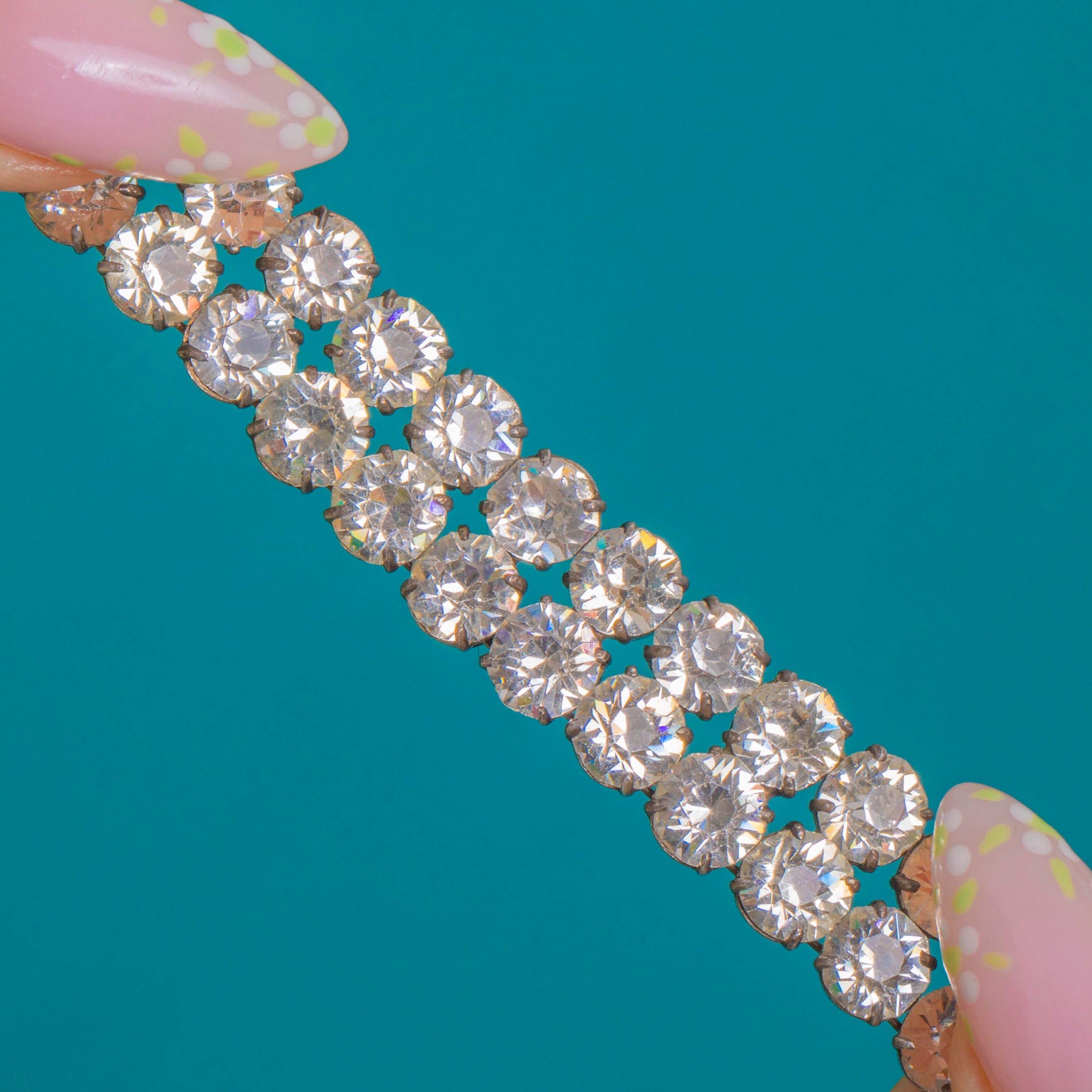 シックで洗練され、絶え間なく輝くこのArt Decoダブルロウブレスレットは、精密さと光への愛を体現した時代の美意識を映し出しています。完璧に整列した2列の鮮やかなホワイトペーストストーンが、端正な4本爪シャトンセッティングに収められ、手首の動きにしなやかに寄り添う、流麗な輝きのバンドを生み出します。