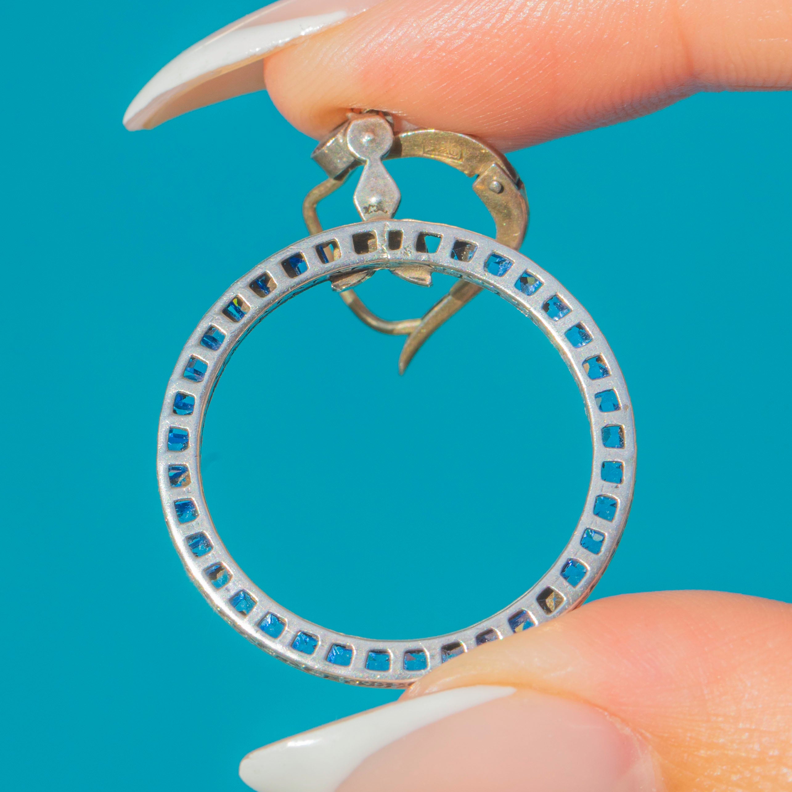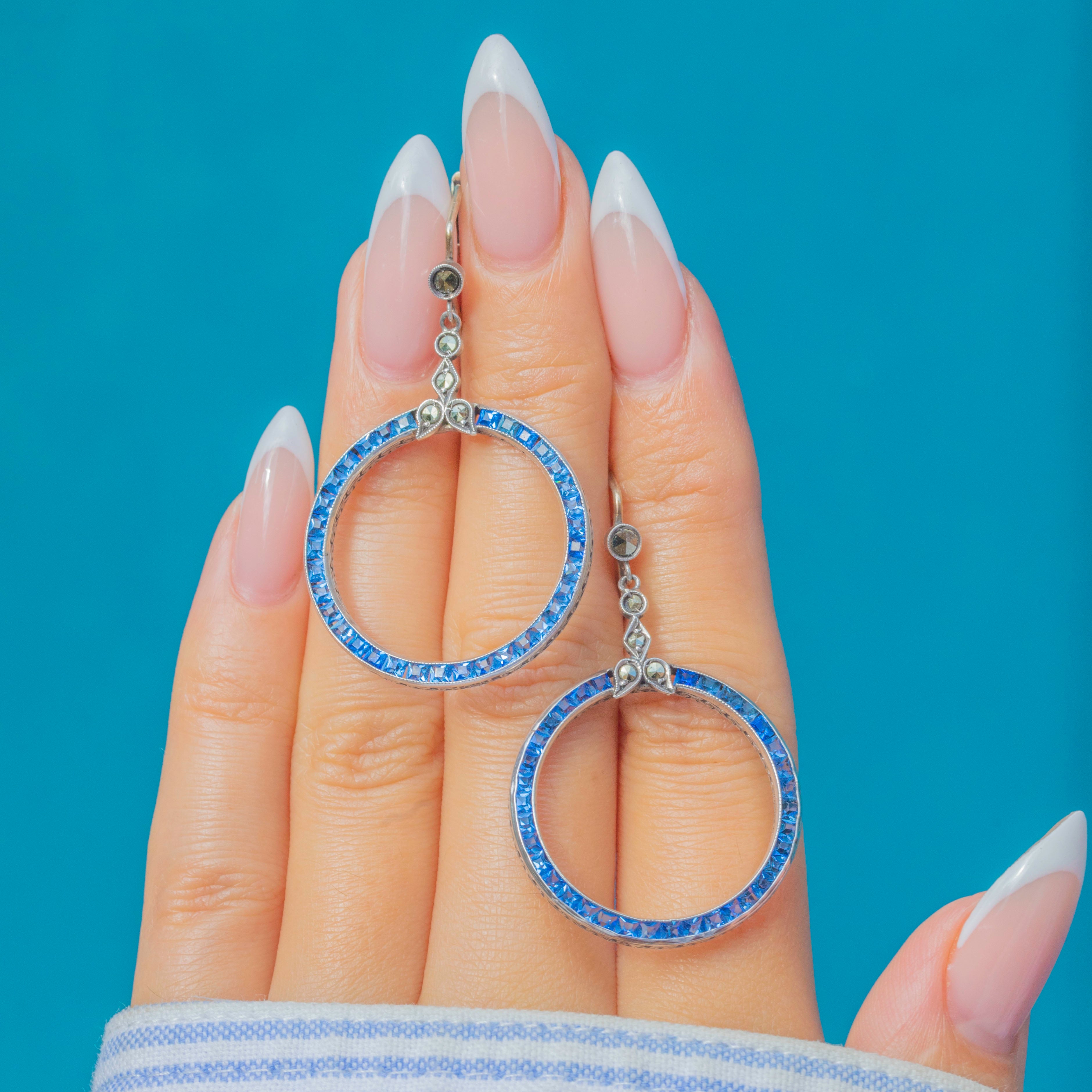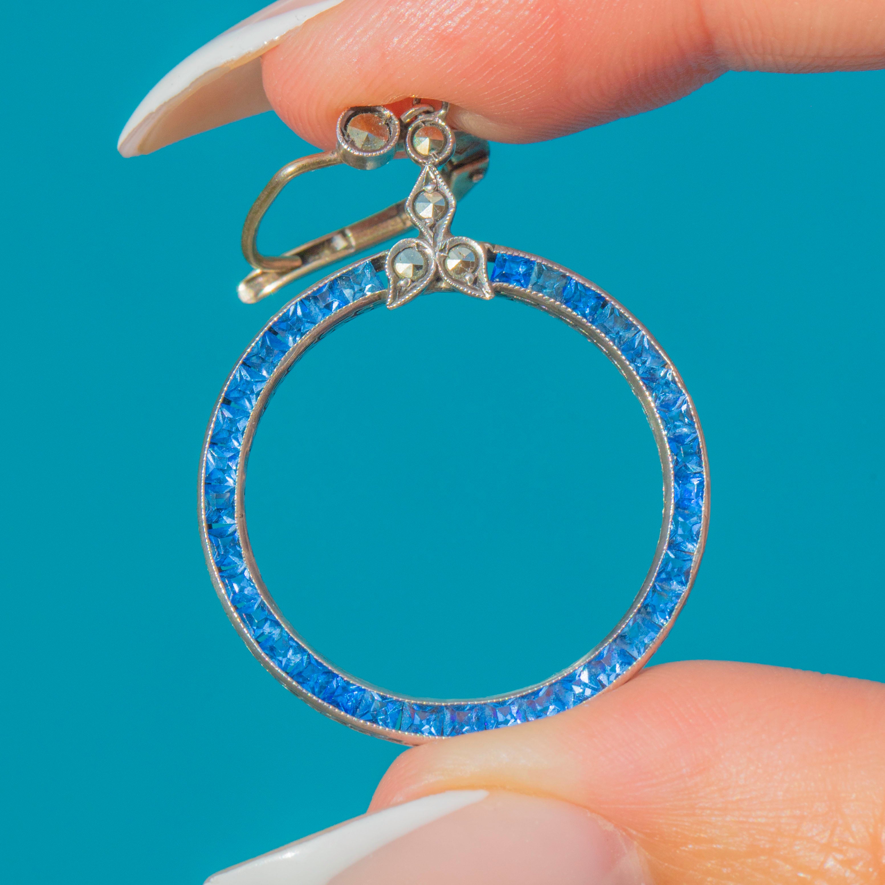 A striking pair of Art Deco earrings, showcasing vivid blue Paste gemstones channel-set around open hoops of Silver. The bold circular form captures the clean lines and symmetry that defined the Deco era, while sparkling Marcasite accents add a subtle shimmer at the top. Finished with secure French lever-back fittings, they swing elegantly with every movement and bring a splash of vibrant colour to the ear.