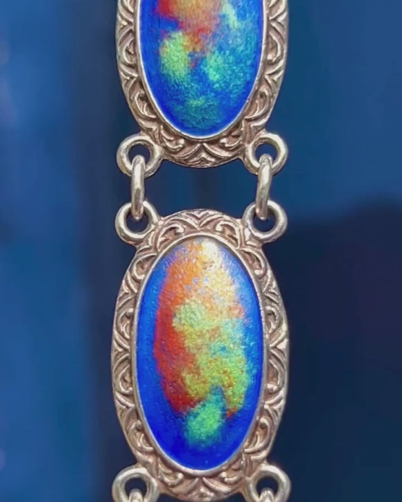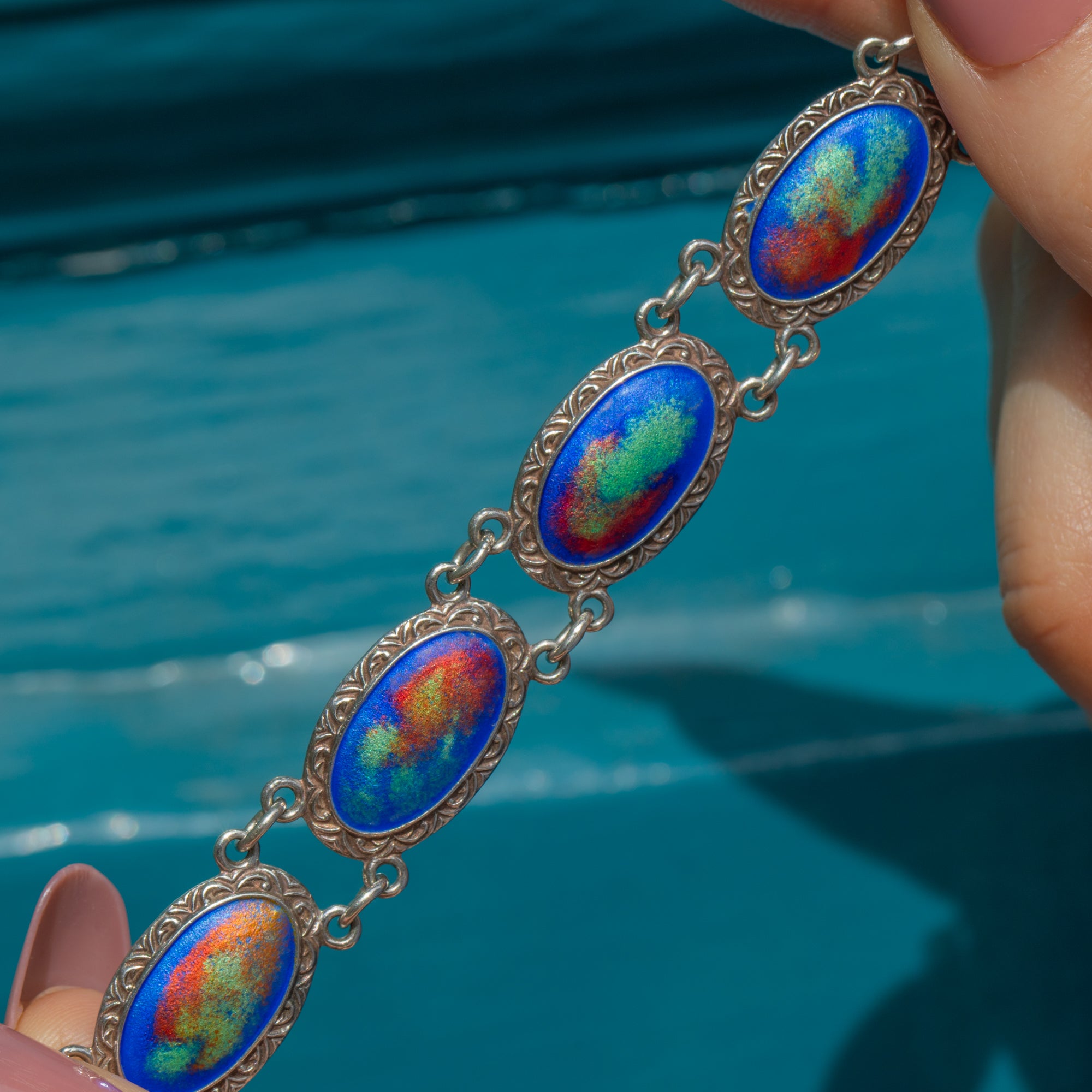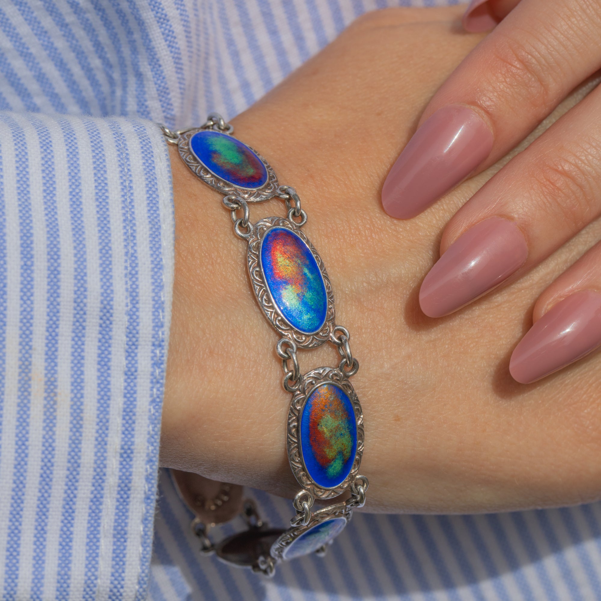 EXCELLENT. We are pleased to offer this Art Deco Silver peacock Enamel bracelet in excellent condition! The Enamel is pristine and free from chips, with vibrant hues throughout. The Silver is bright with a light patina having accrued within the details making the colours pop, each link stamped 'SILVER' on the back. The clasp is in lovely condition allowing you to wear this outstanding Deco delight with absolute confidence!