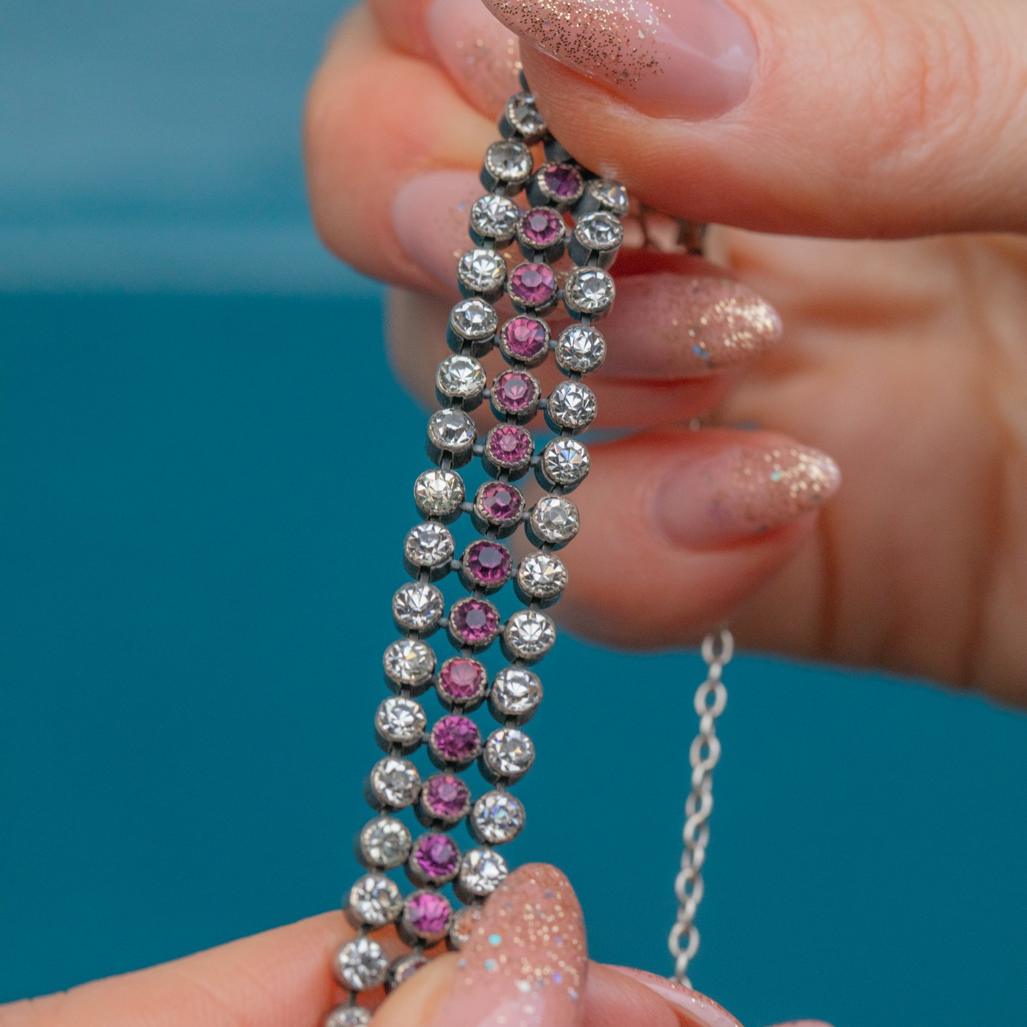 EXCELLENT. This Art Deco Silver Purple & White Paste three row bracelet is in excellent condition. Her Paste gemstones are all present and glisten like nobody's business! She fastens securely, complete with a security chain allowing for safe confident wear.