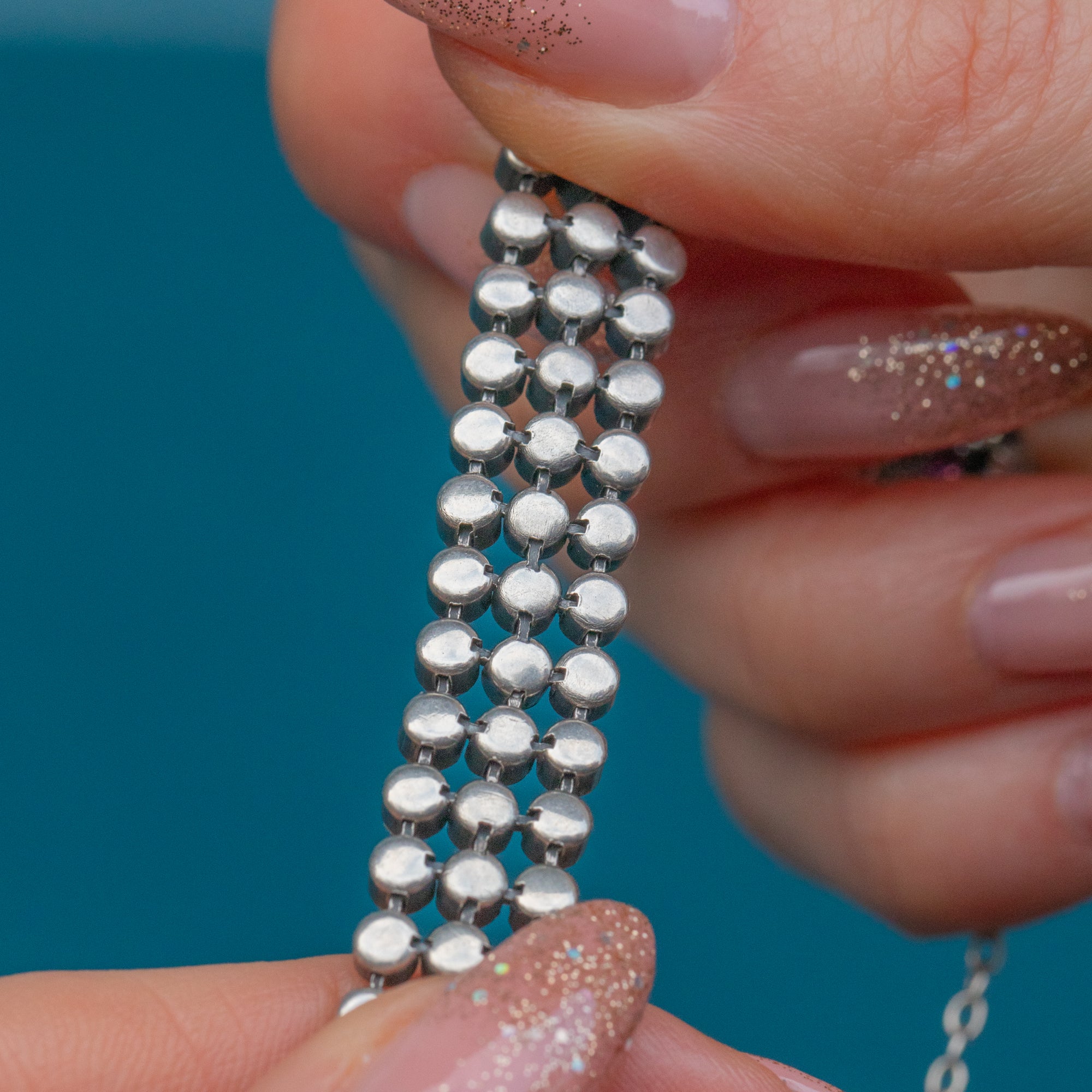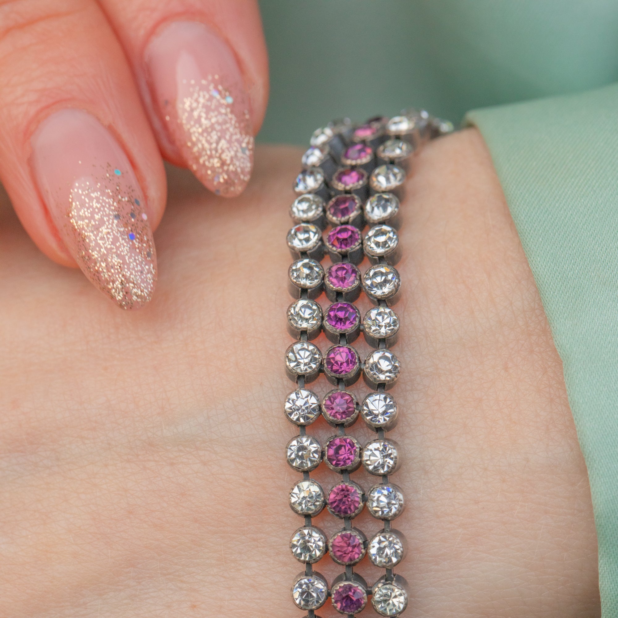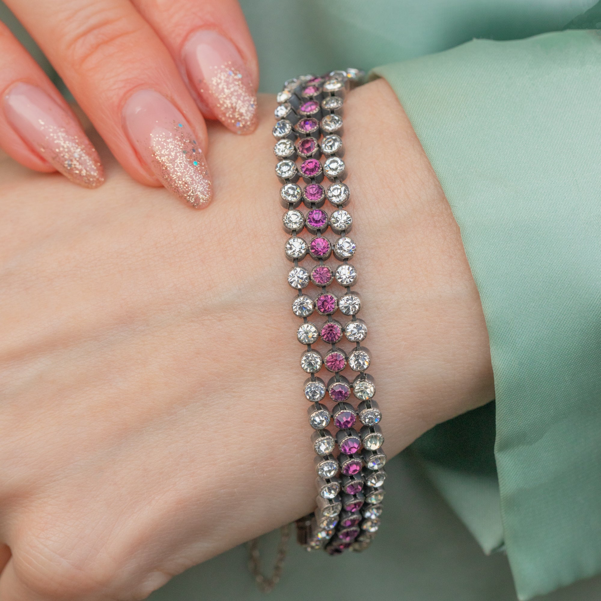 This is an impeccable Art Deco Silver Purple & White Paste three row bracelet! Displaying three rows of scrumptious Paste gemstones that sparkle miraculously under the light, this bracelet captures Art Deco beauty in its essence.