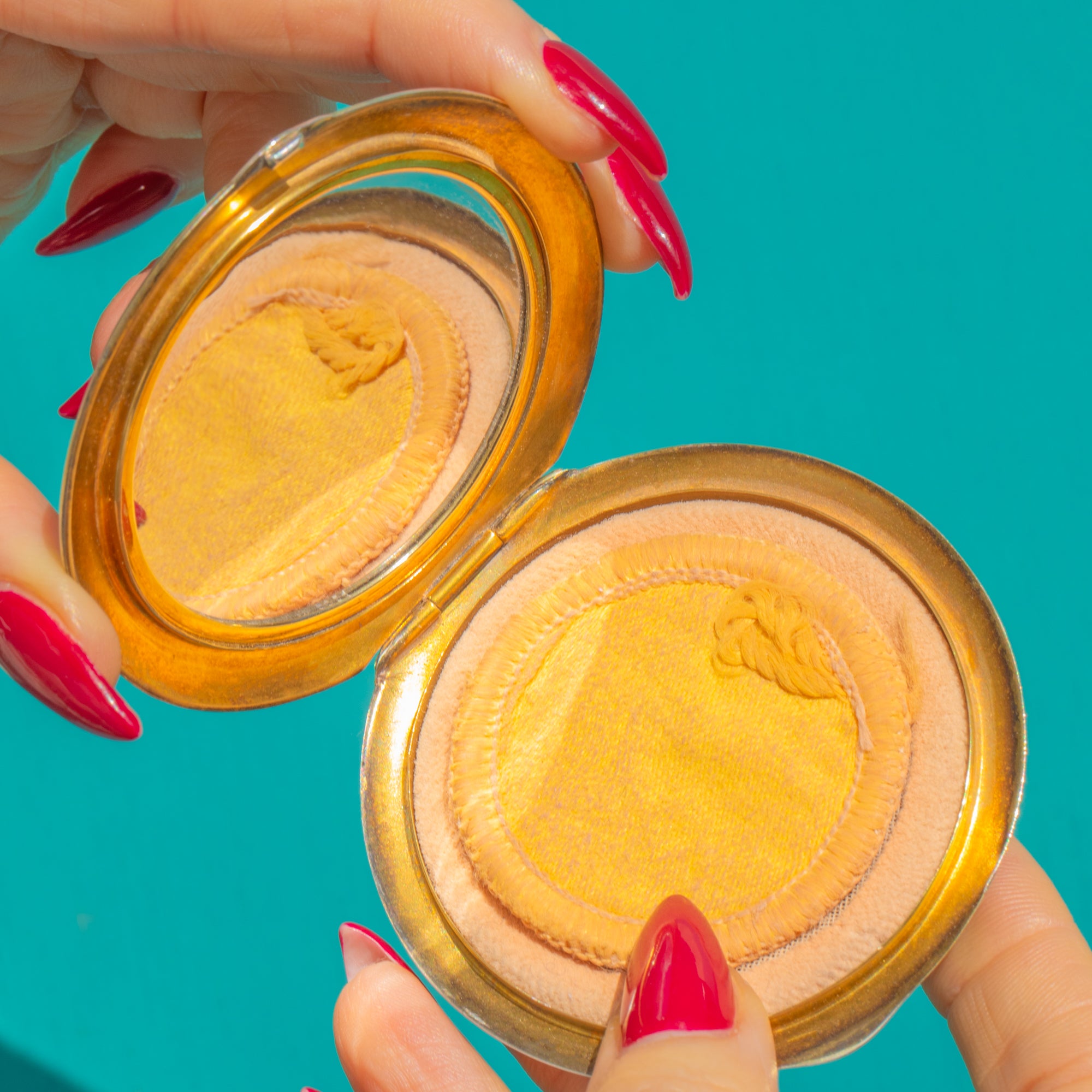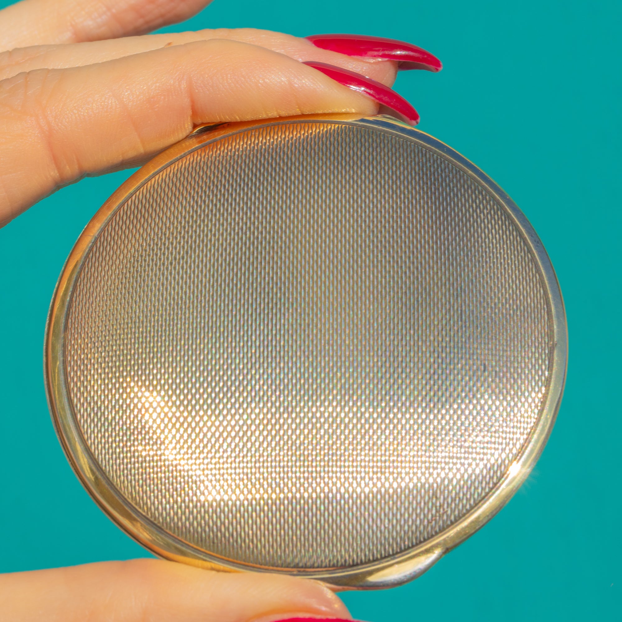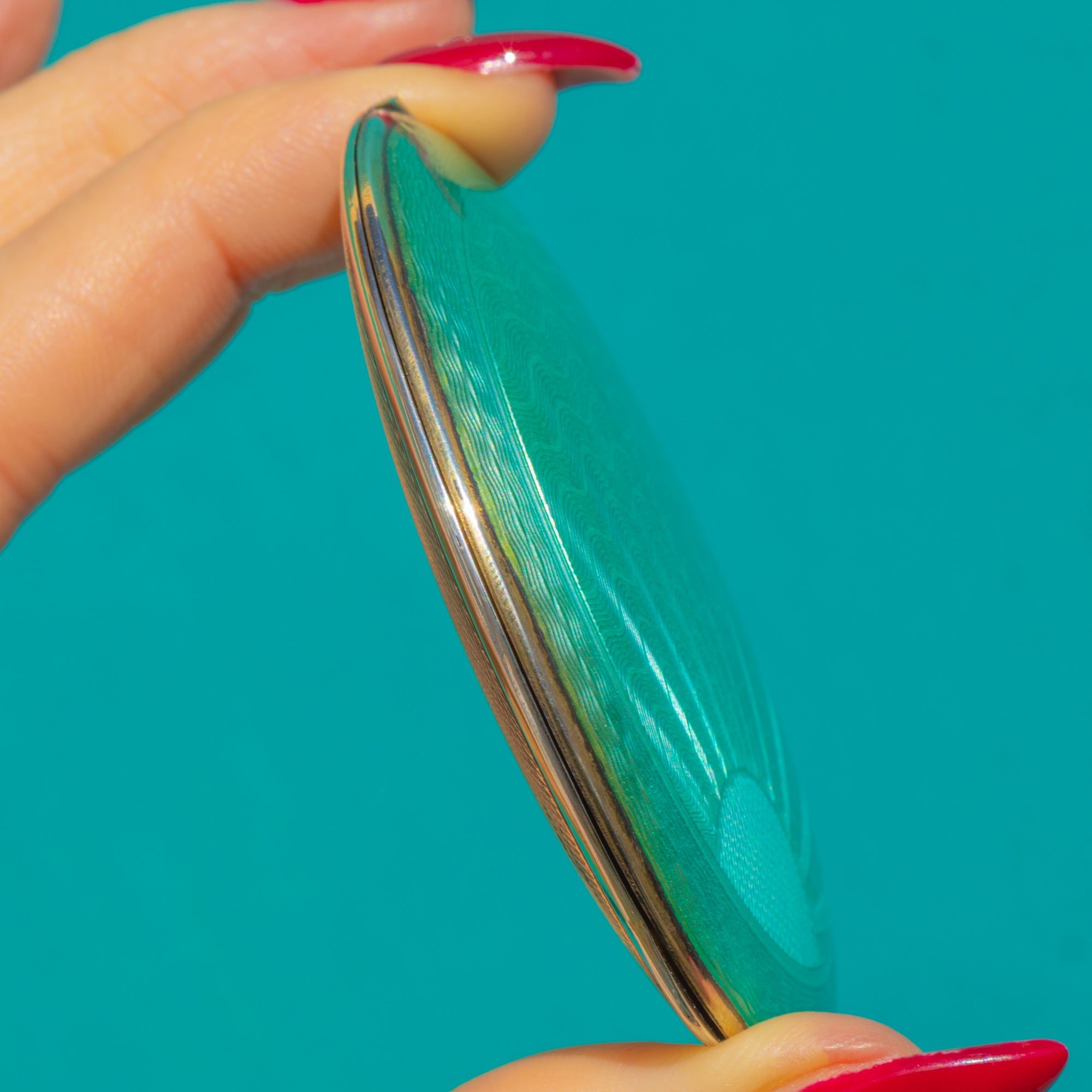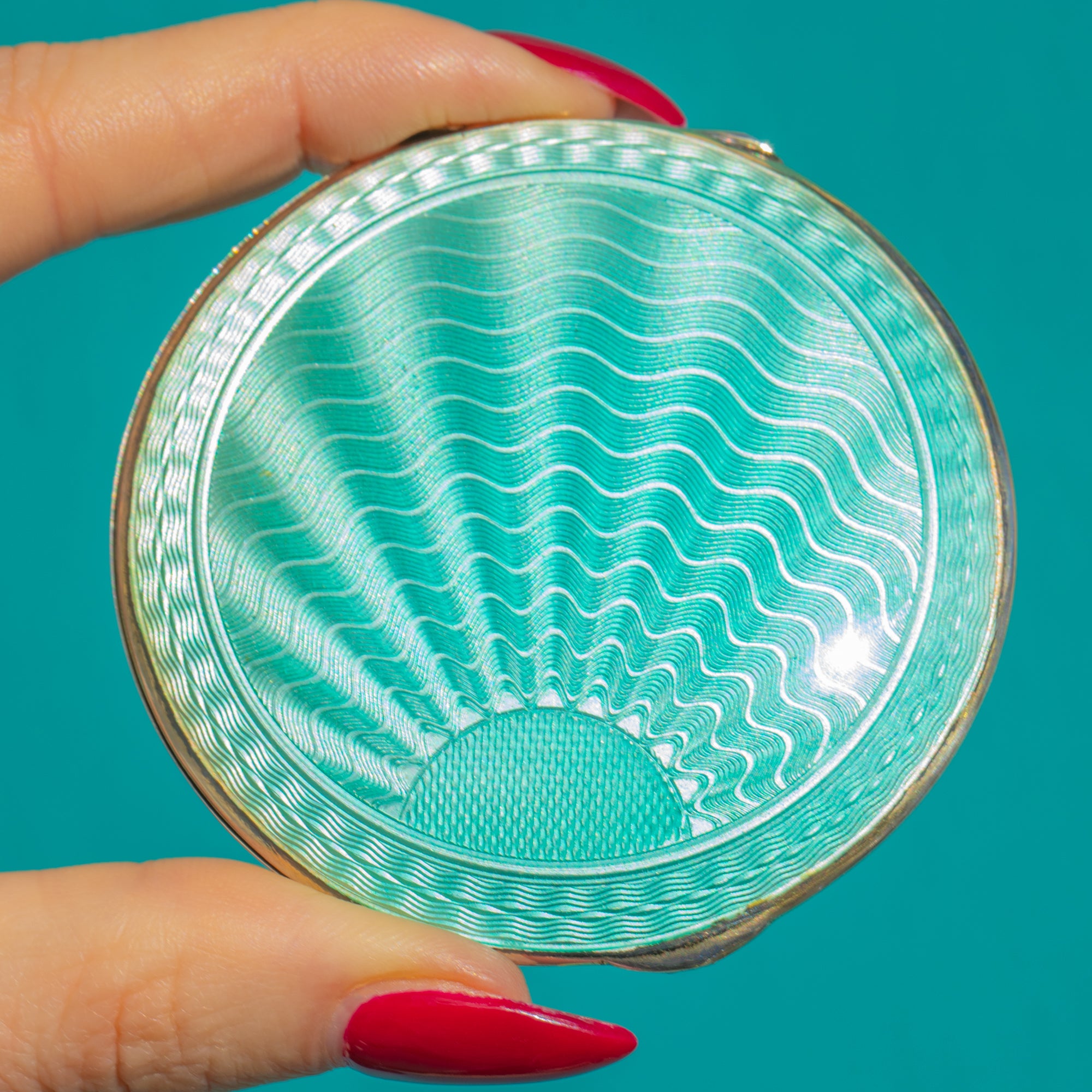 ドレッシングテーブルを彩る逸品、こちらのArt Decoコンパクトは、ターコイズ・ギロシェエナメルの澄んだ輝きが魅力です。エンジンターンによる波模様が光を受けて美しくきらめきます。ラウンド型のスターリングシルバー製ケースは洗練されたシンプルさで、鮮やかなエナメルと繊細なサンバースト調の装飾が主役となるデザインです。