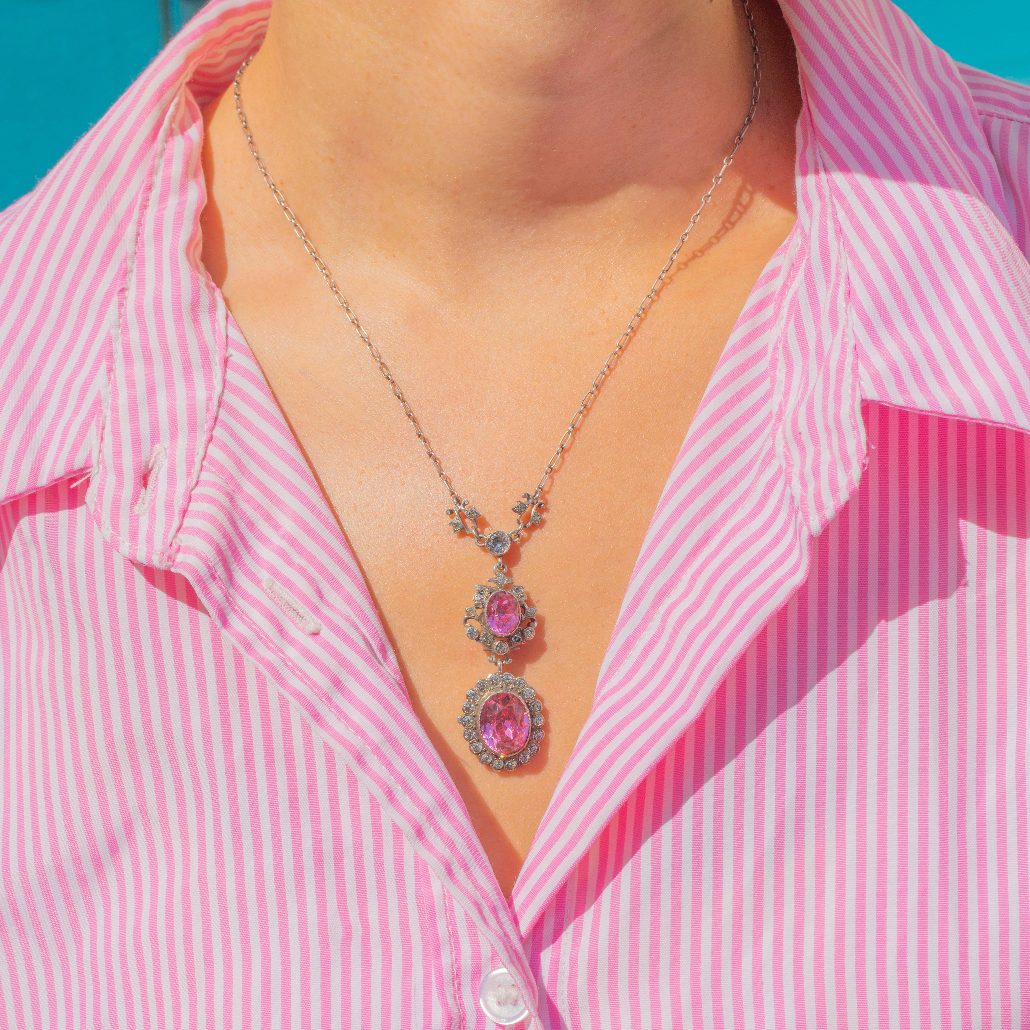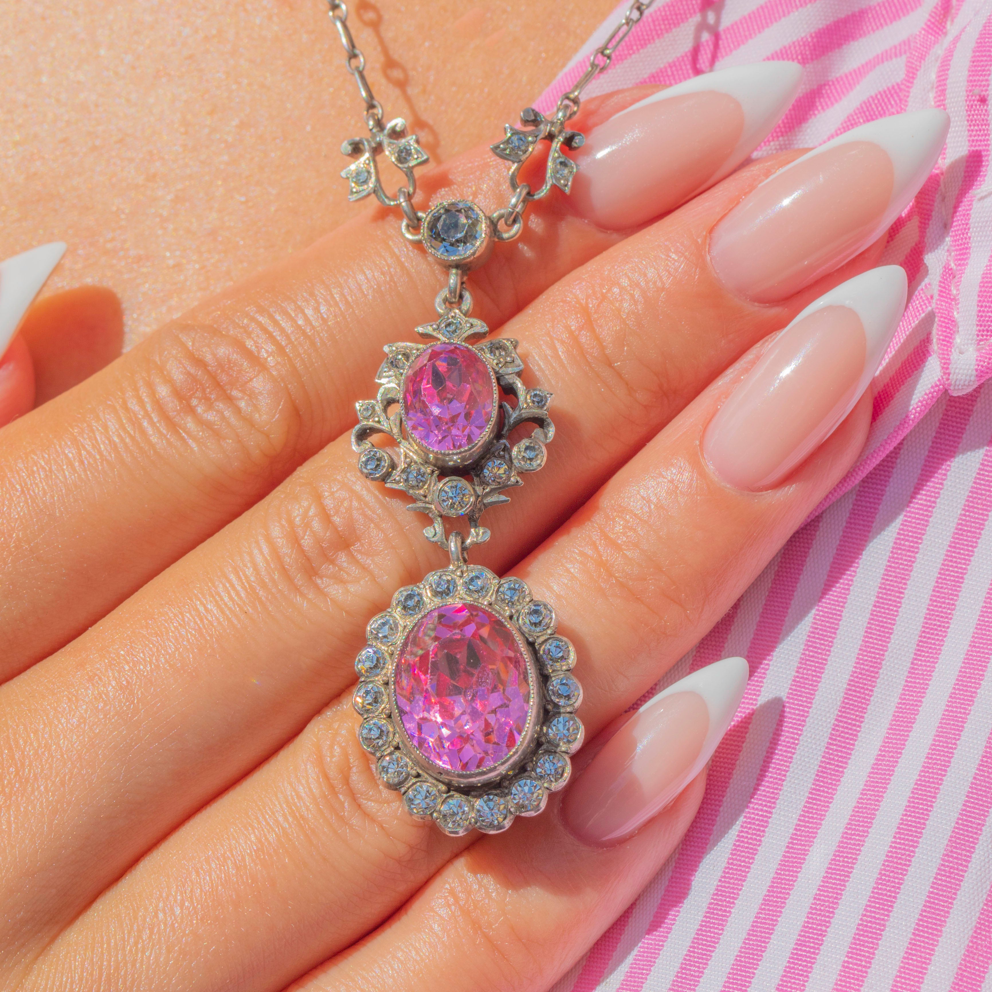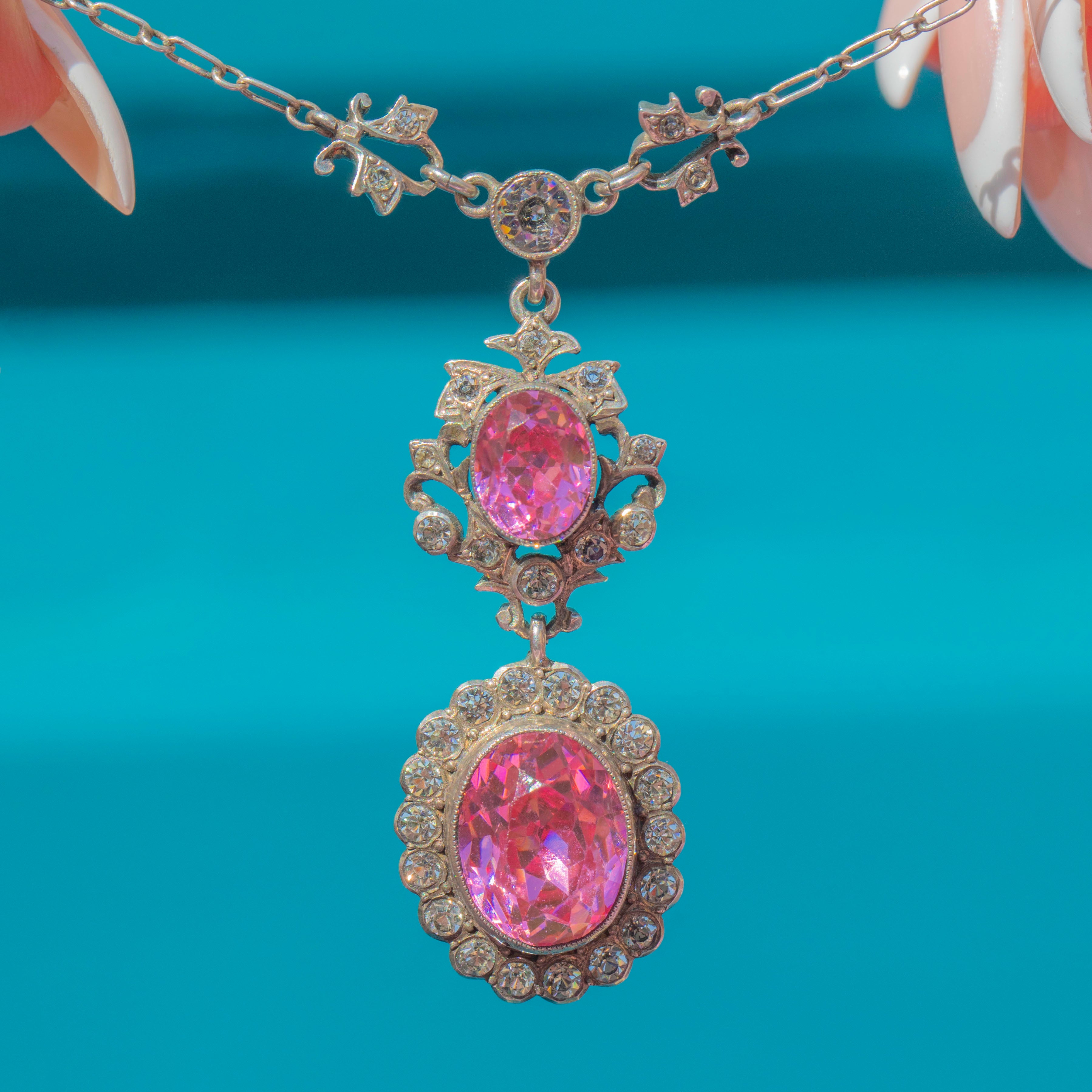 A spectacular Antique Art Deco drop necklace set with vibrant foiled hot pink Paste stones. The design begins with a delicate leaf motif set with bright white Paste, leading to an oval pink Paste gem and culminating in a dramatic larger drop framed by a halo of glittering white Paste. The foiled pink stones glow with a luminous intensity, a much sought-after shade that epitomises the glamour of the Art Deco era.