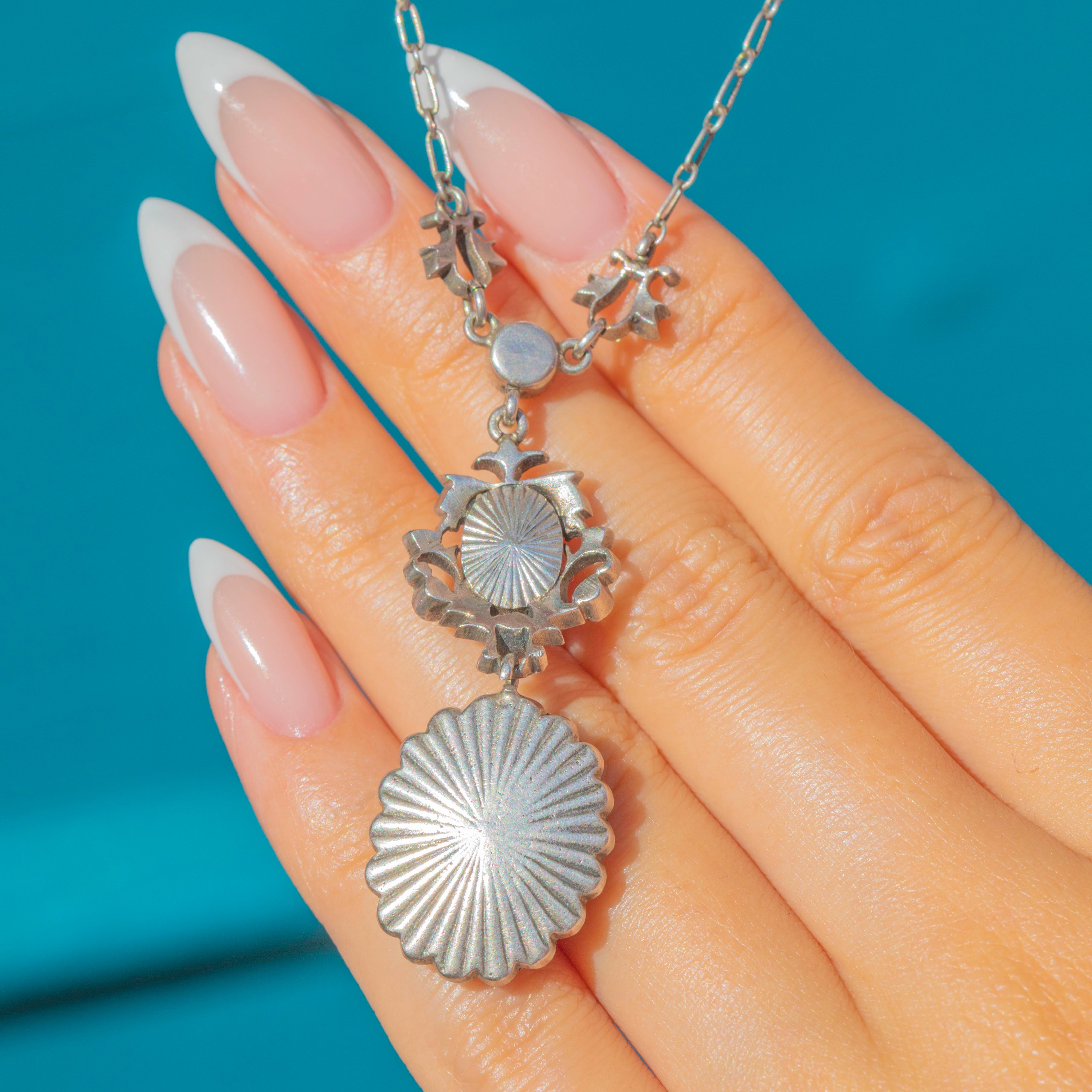 Crafted in Sterling Silver throughout, the reverse is just as striking as the front, decorated with engraved sunray designs. With its 17" chain and elegant 2" drop, this necklace balances bold colour with refined antique artistry, making it a stunning statement piece.