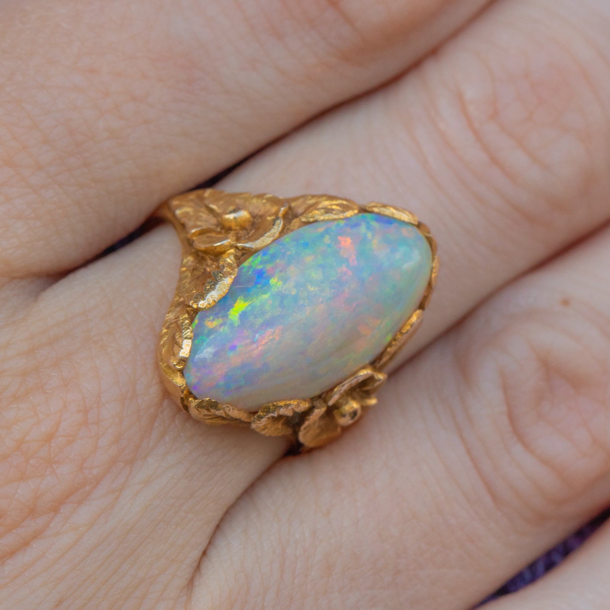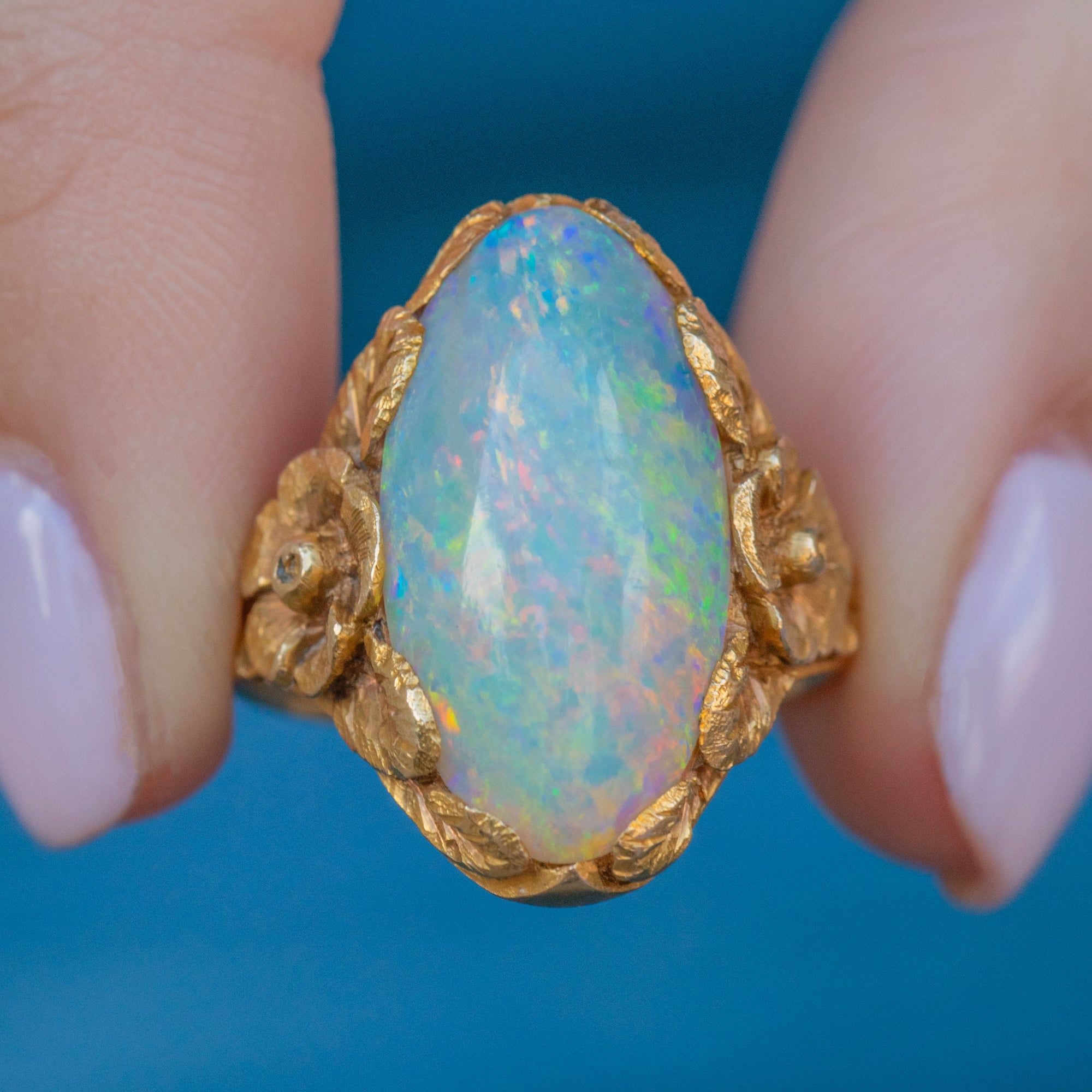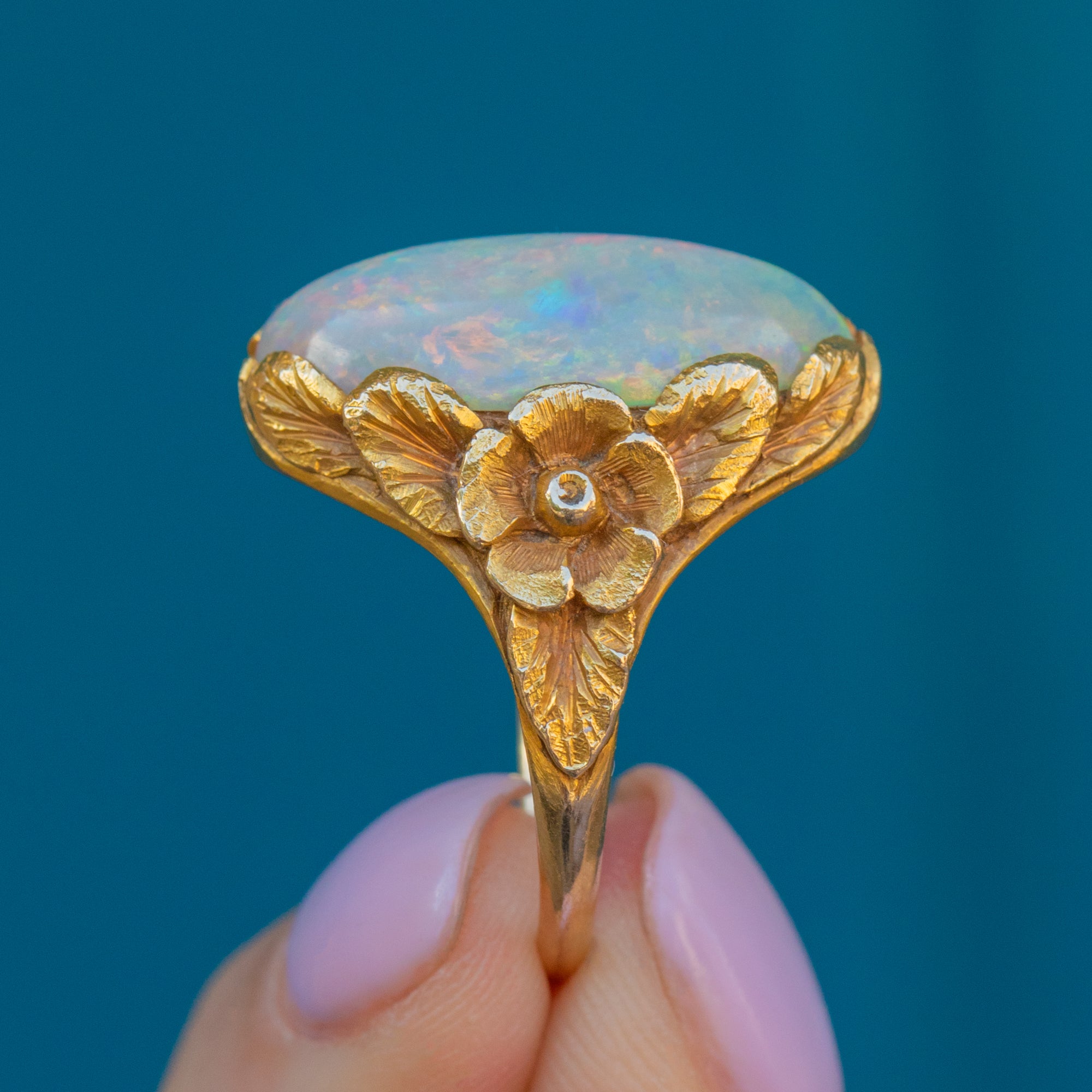 Displaying exquisite craftsmanship, her Opal is embraced by floral shoulders and fanning leaves, creating a mesmerising setting in which the Opal sits. Your eye effortlessly draws around this antique Opal ring and, crafted entirely from buttery 18ct Gold, she is bound to make you weak at the knees.