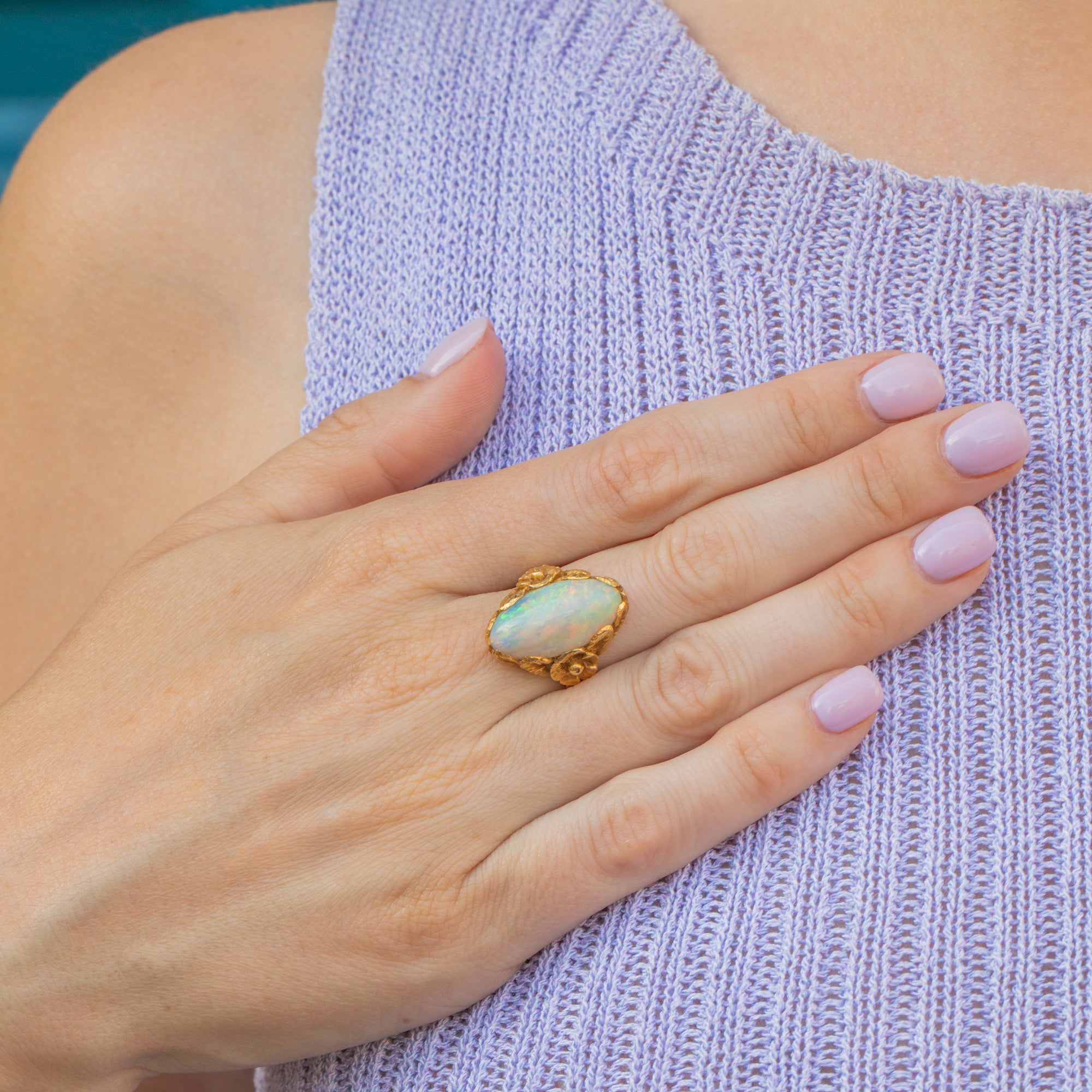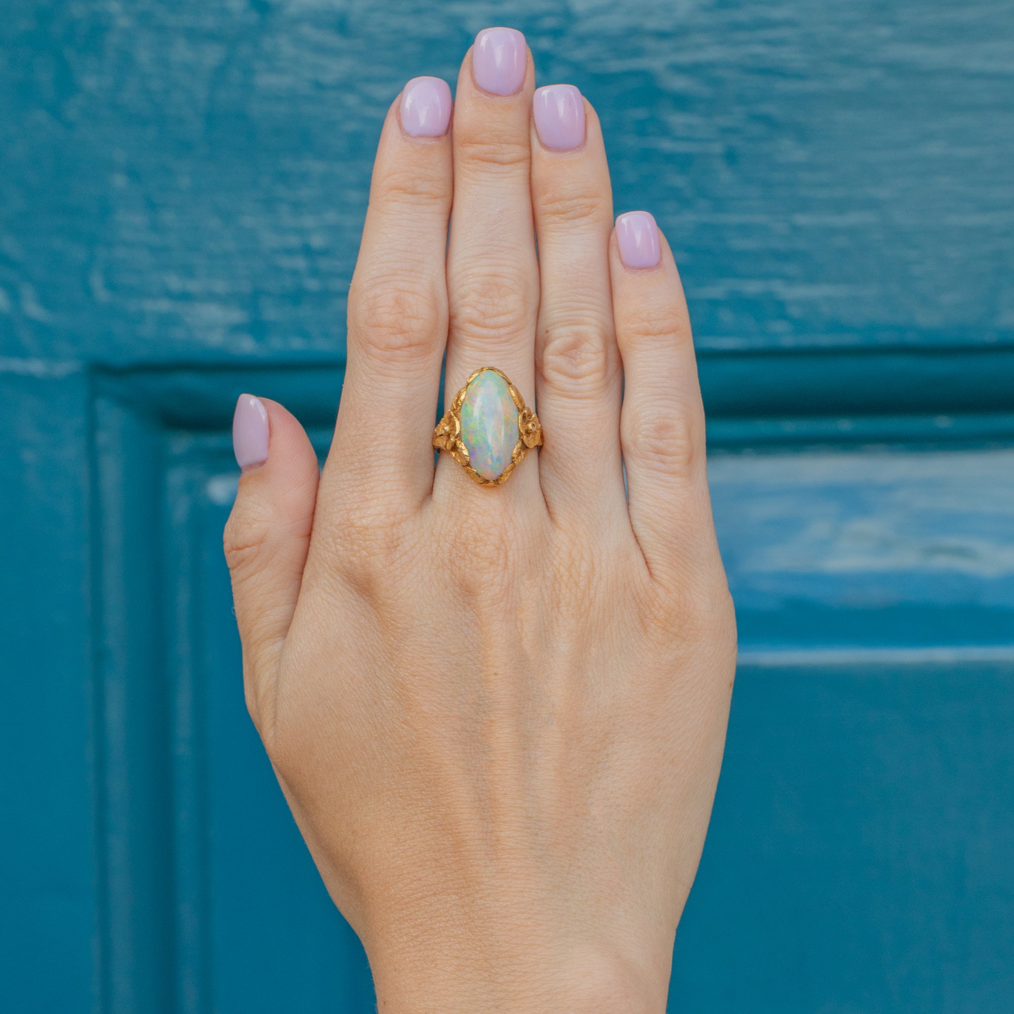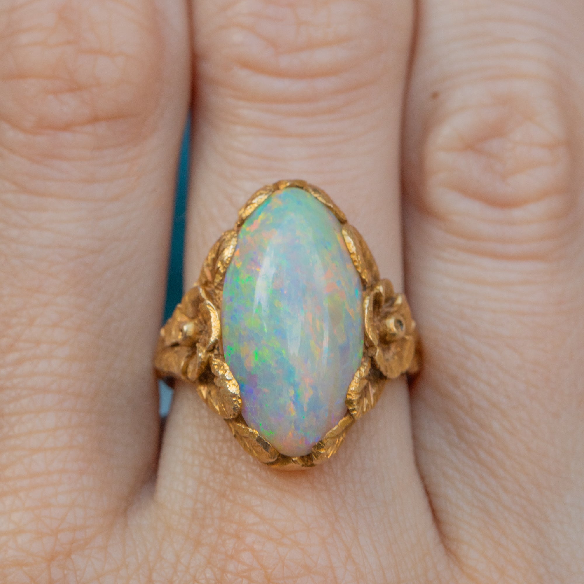 Displaying exquisite craftsmanship, her Opal is embraced by floral shoulders and fanning leaves, creating a mesmerising setting in which the Opal sits. Your eye effortlessly draws around this antique Opal ring and, crafted entirely from buttery 18ct Gold, she is bound to make you weak at the knees.