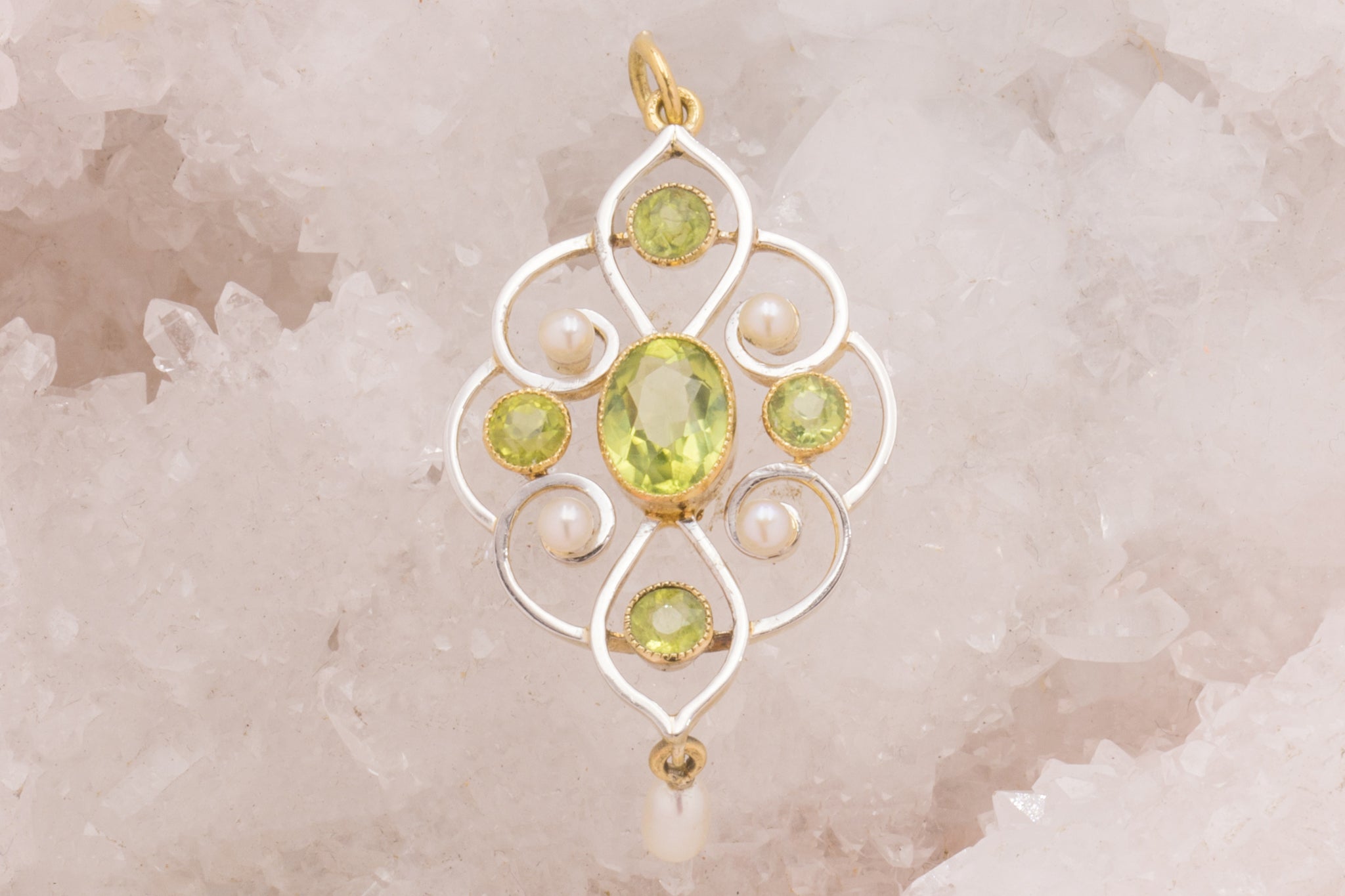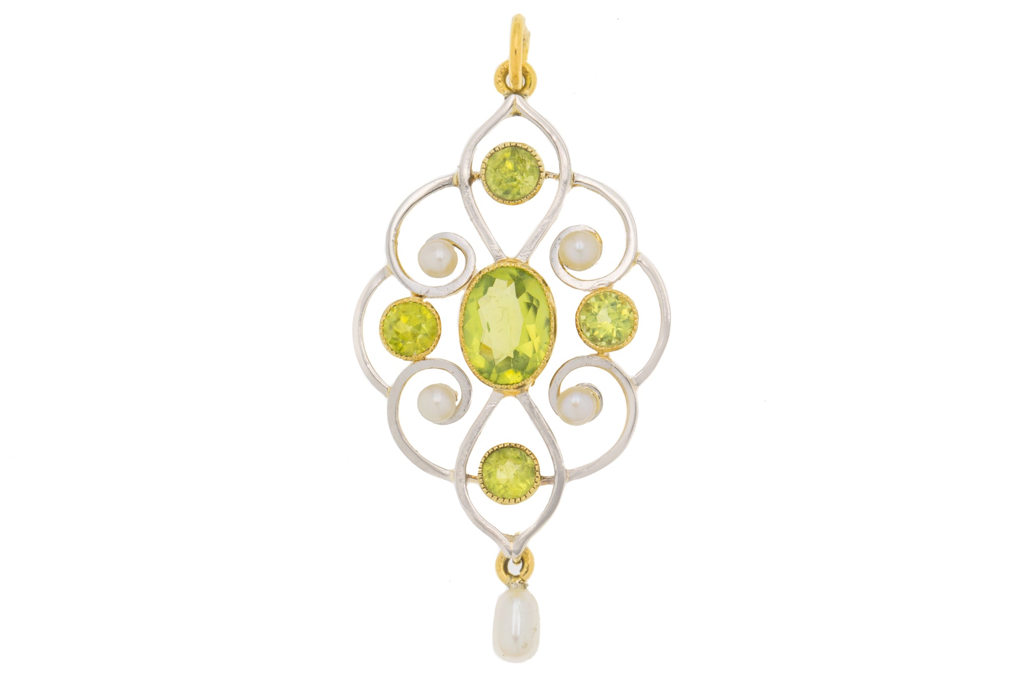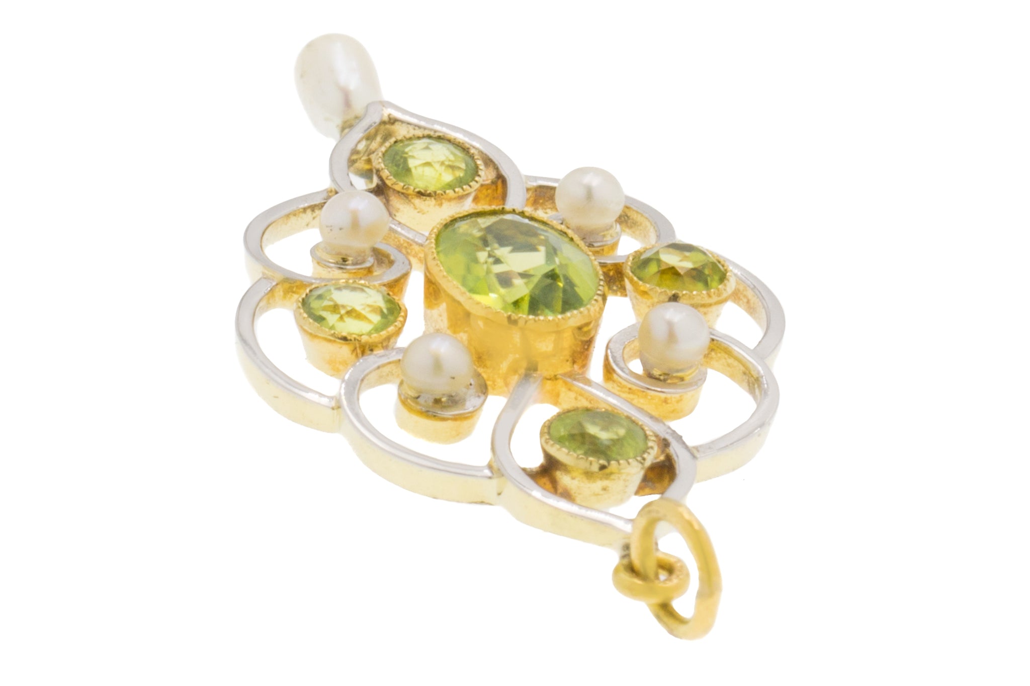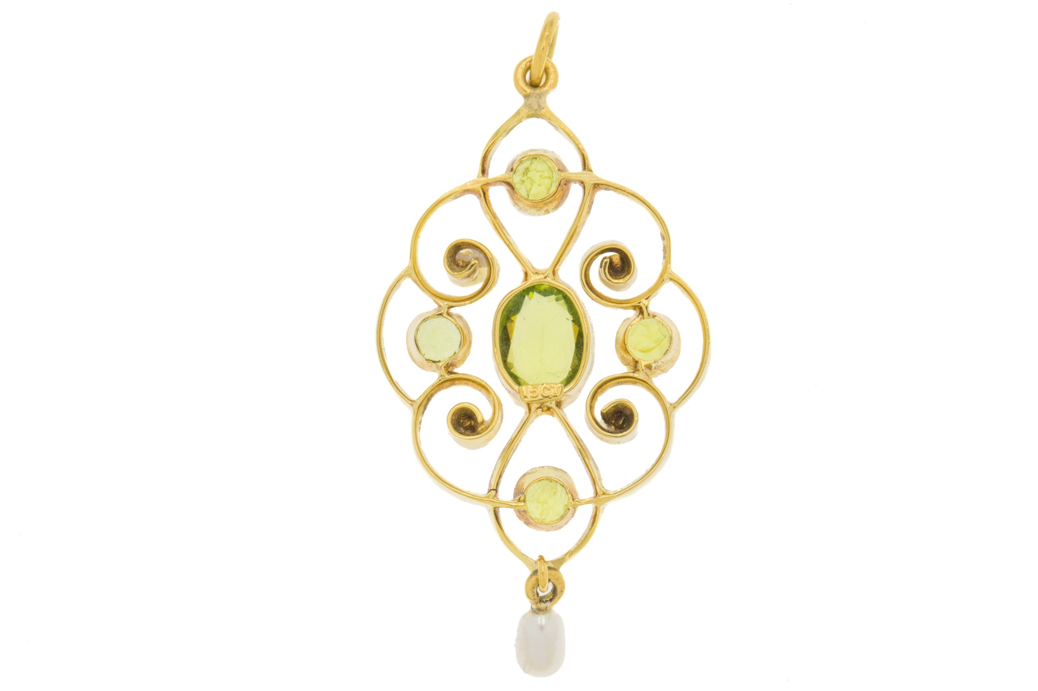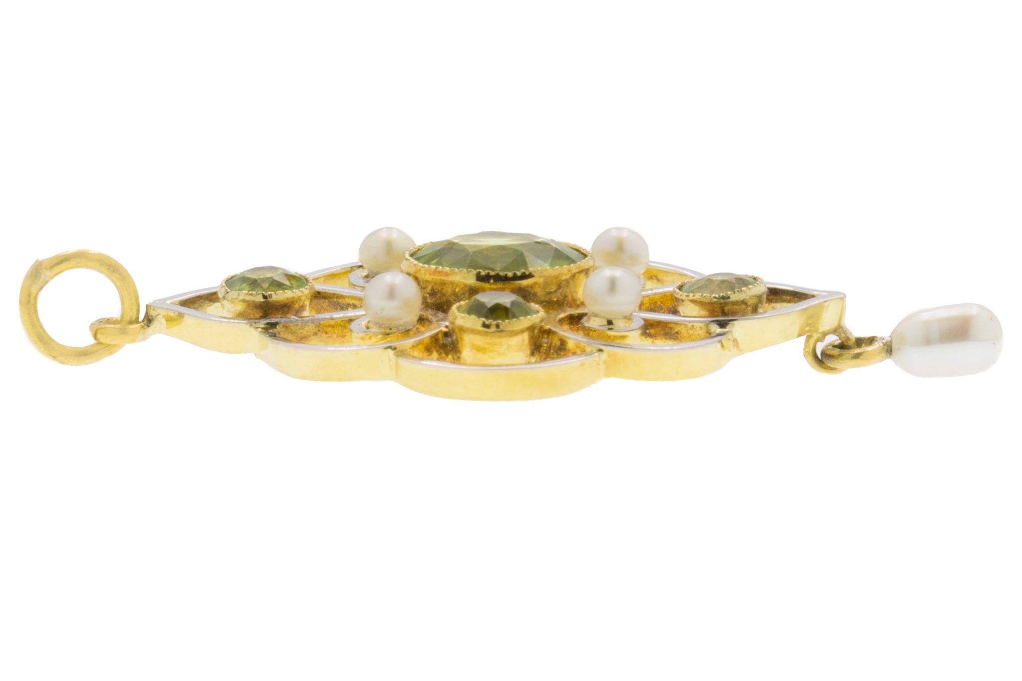 アールヌーボー 15ct ゴールド パール ペリドット ドロップ ペンダント、1.00ct