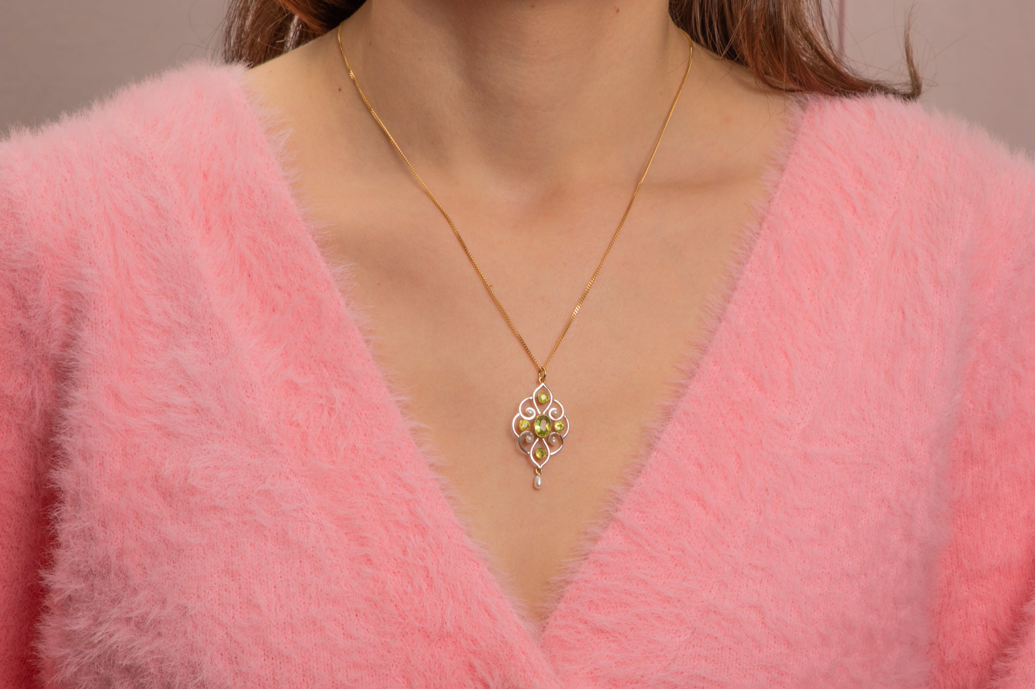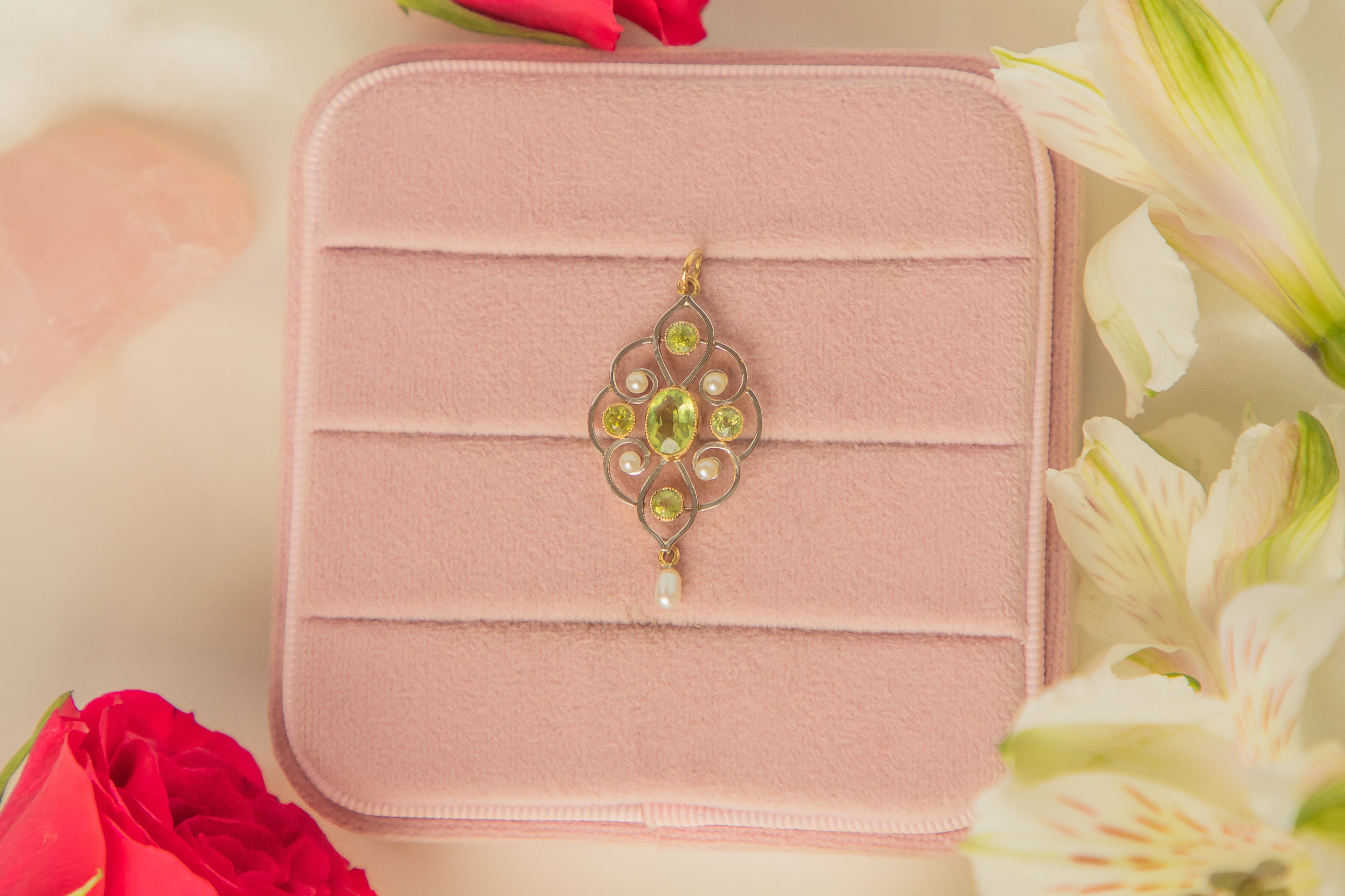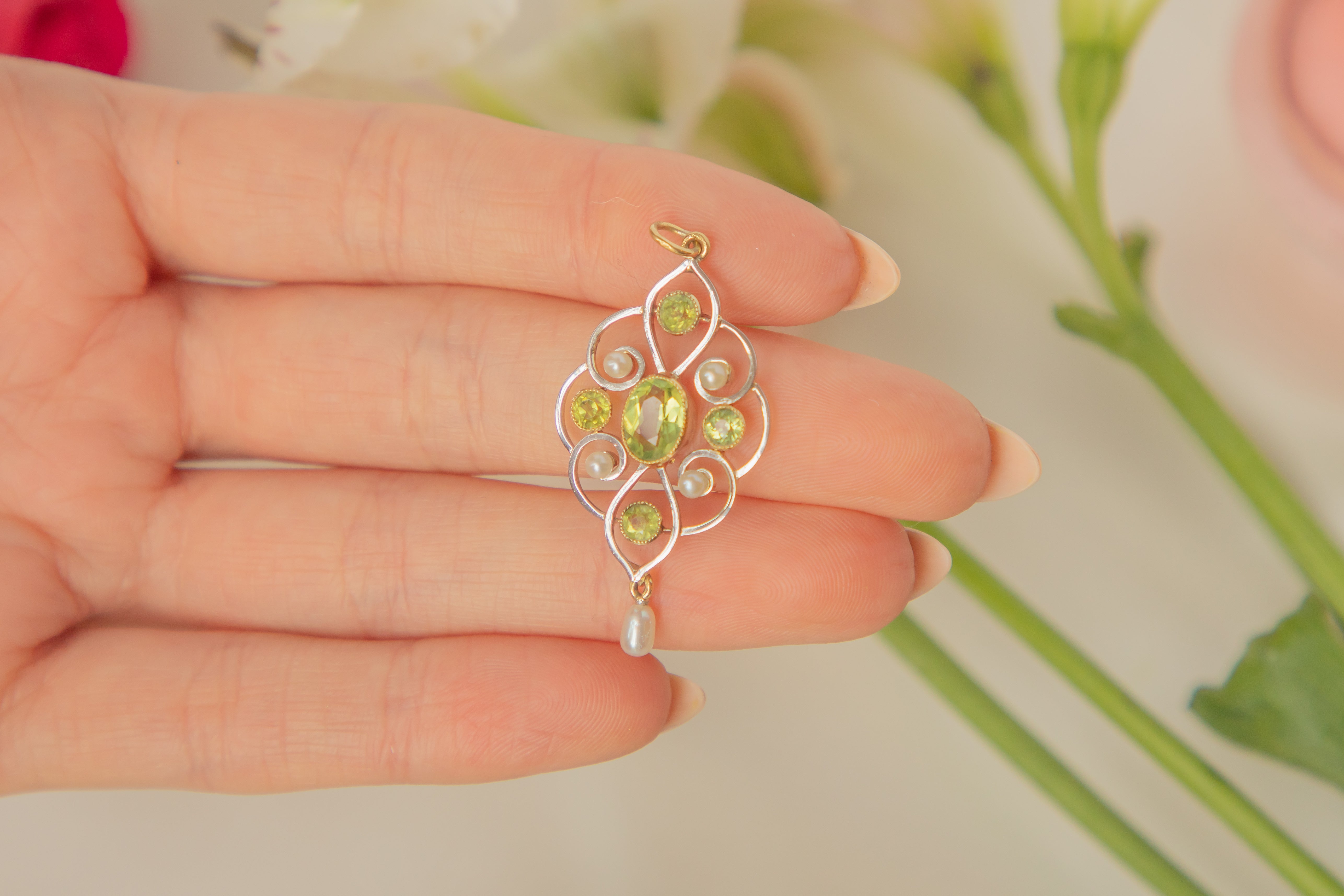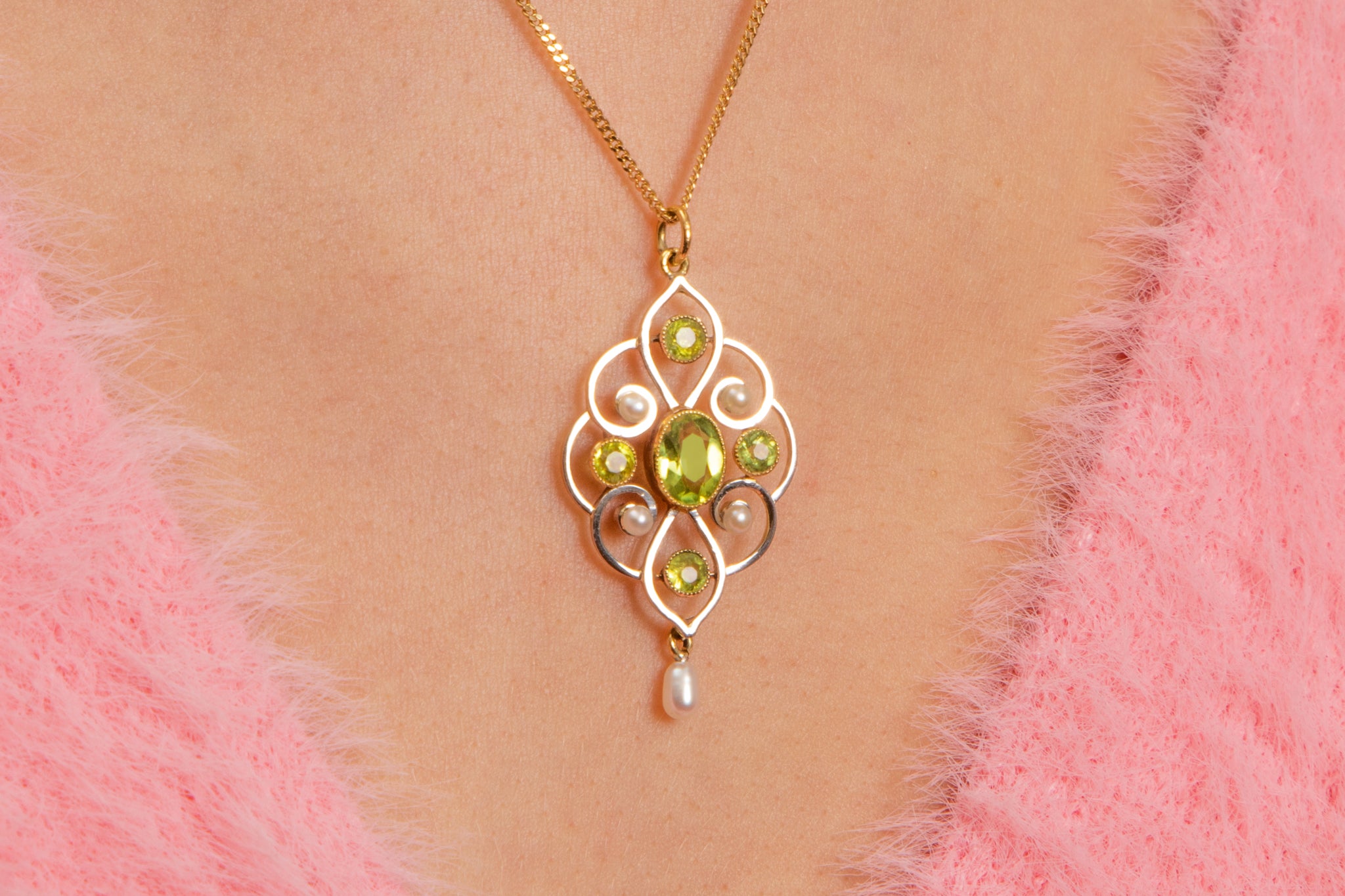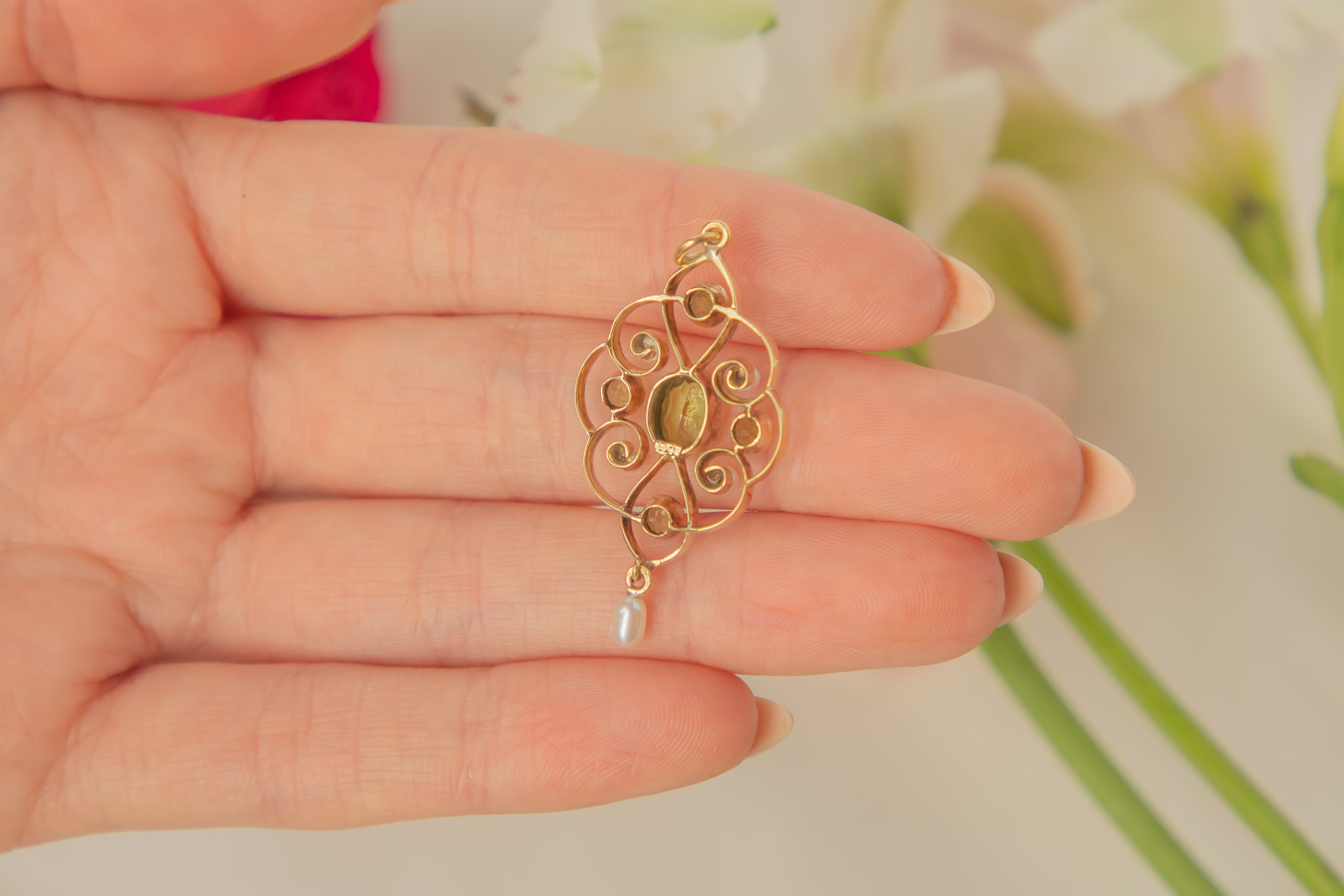 アールヌーボー 15ct ゴールド パール ペリドット ドロップ ペンダント、1.00ct