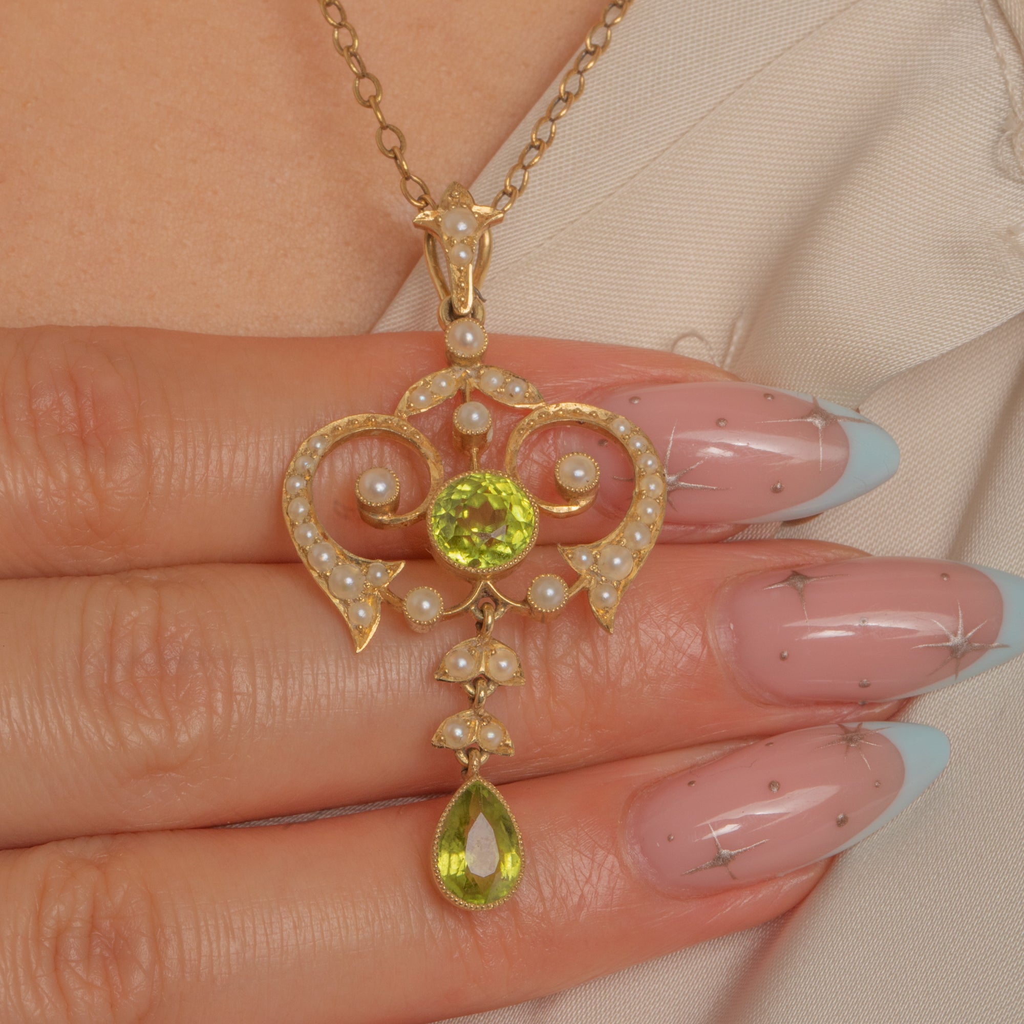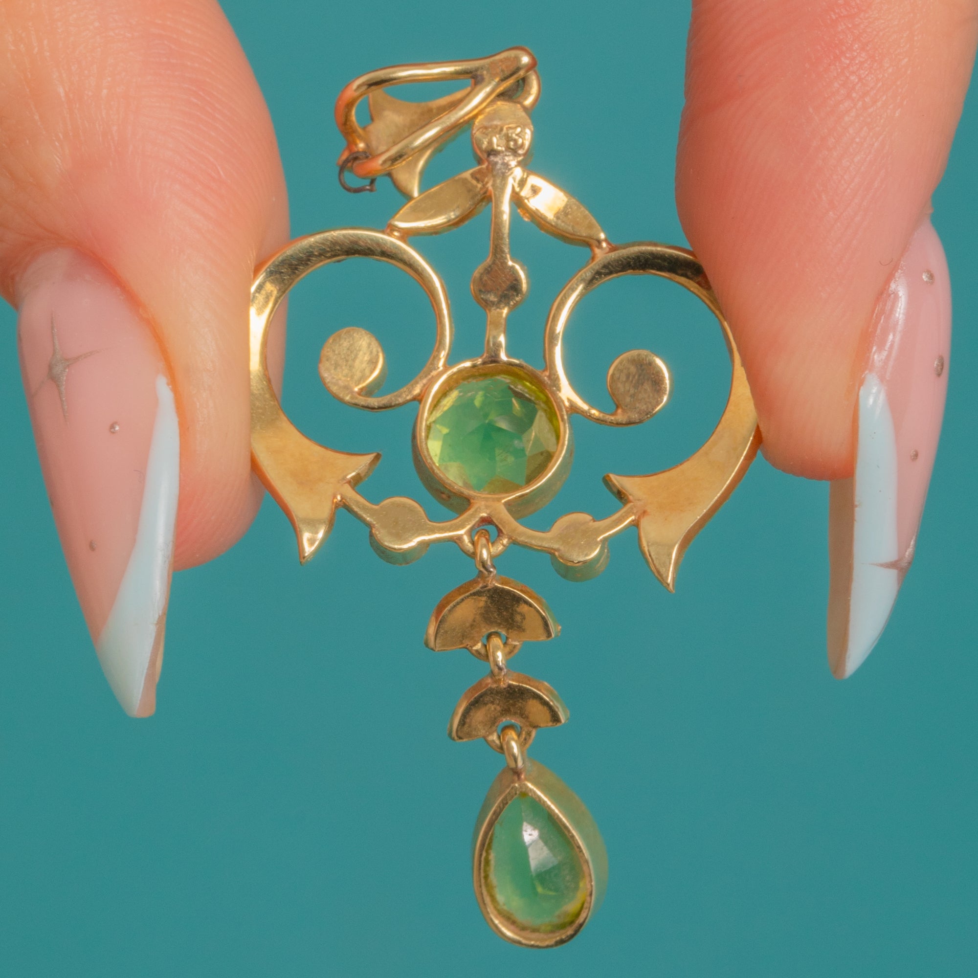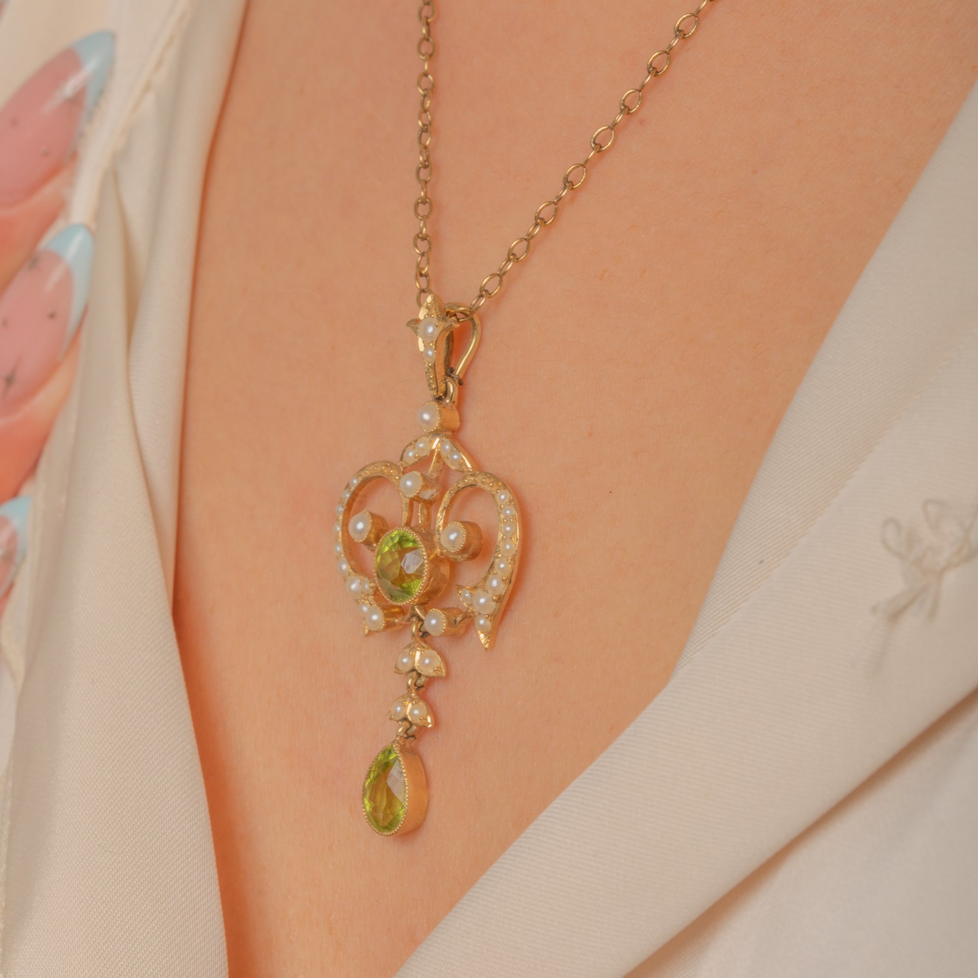 A luminous Art Nouveau pendant crafted in rich 15ct Gold, its airy openwork design swirling with romantic heart‑like scrolls and delicate milgrain beading. A vivid apple‑green Peridot crowns the centre, while a gracefully articulated pear‑shaped Peridot drop dances below, the whole framed by tiny creamy Pearls in trefoil flourishes.