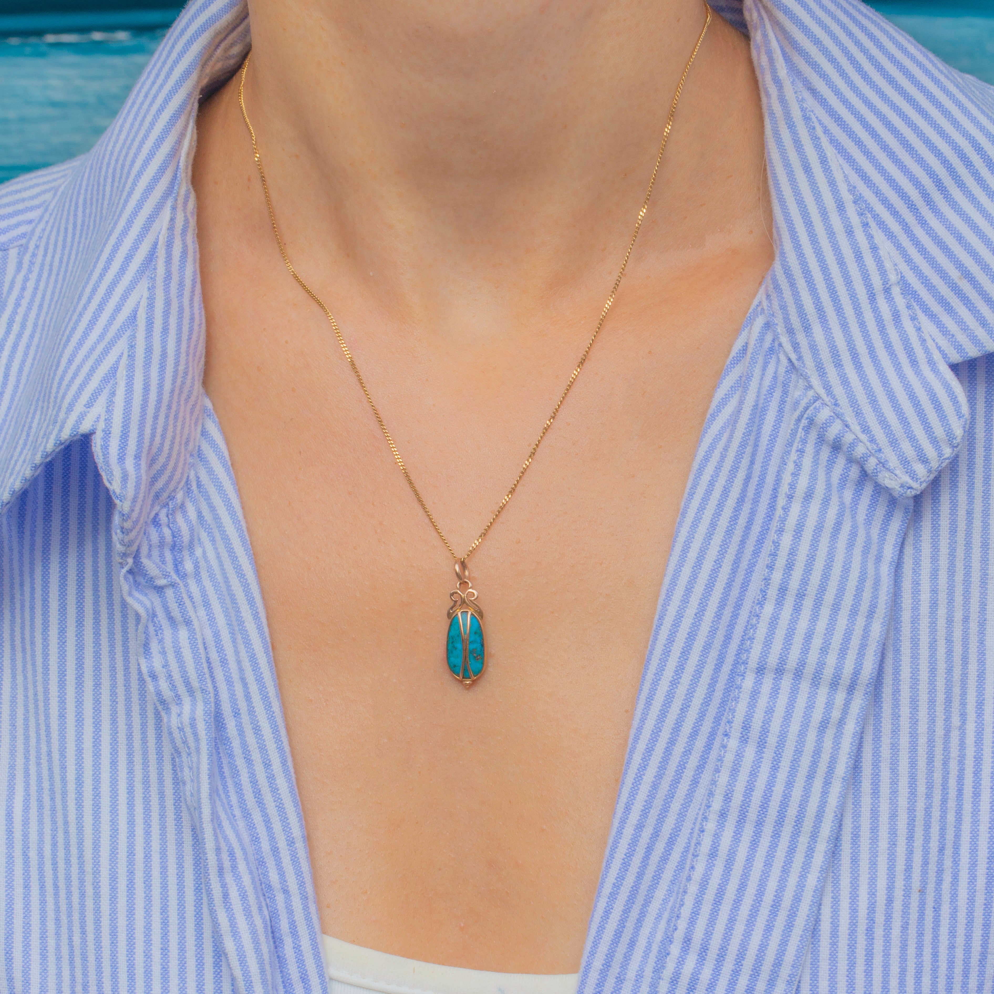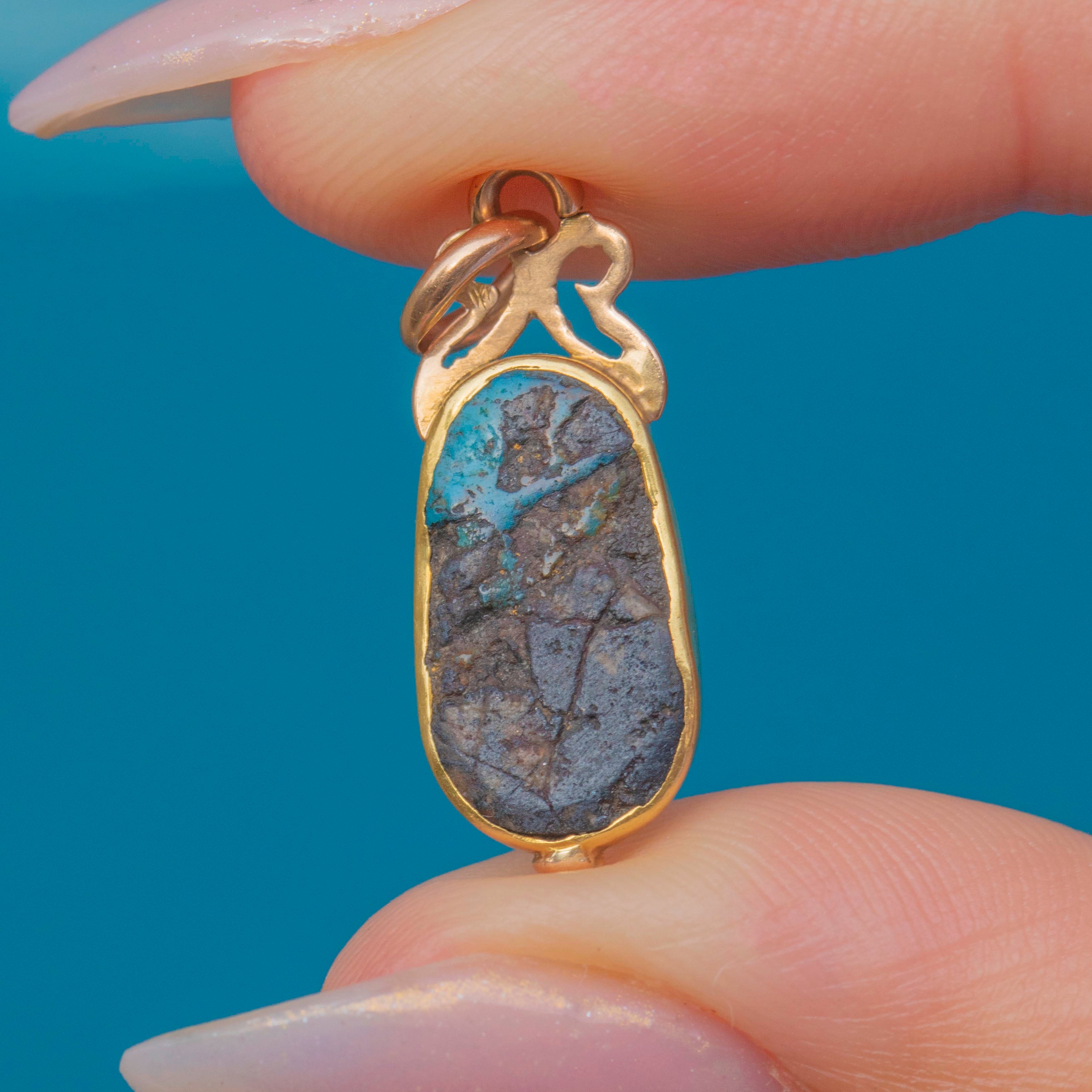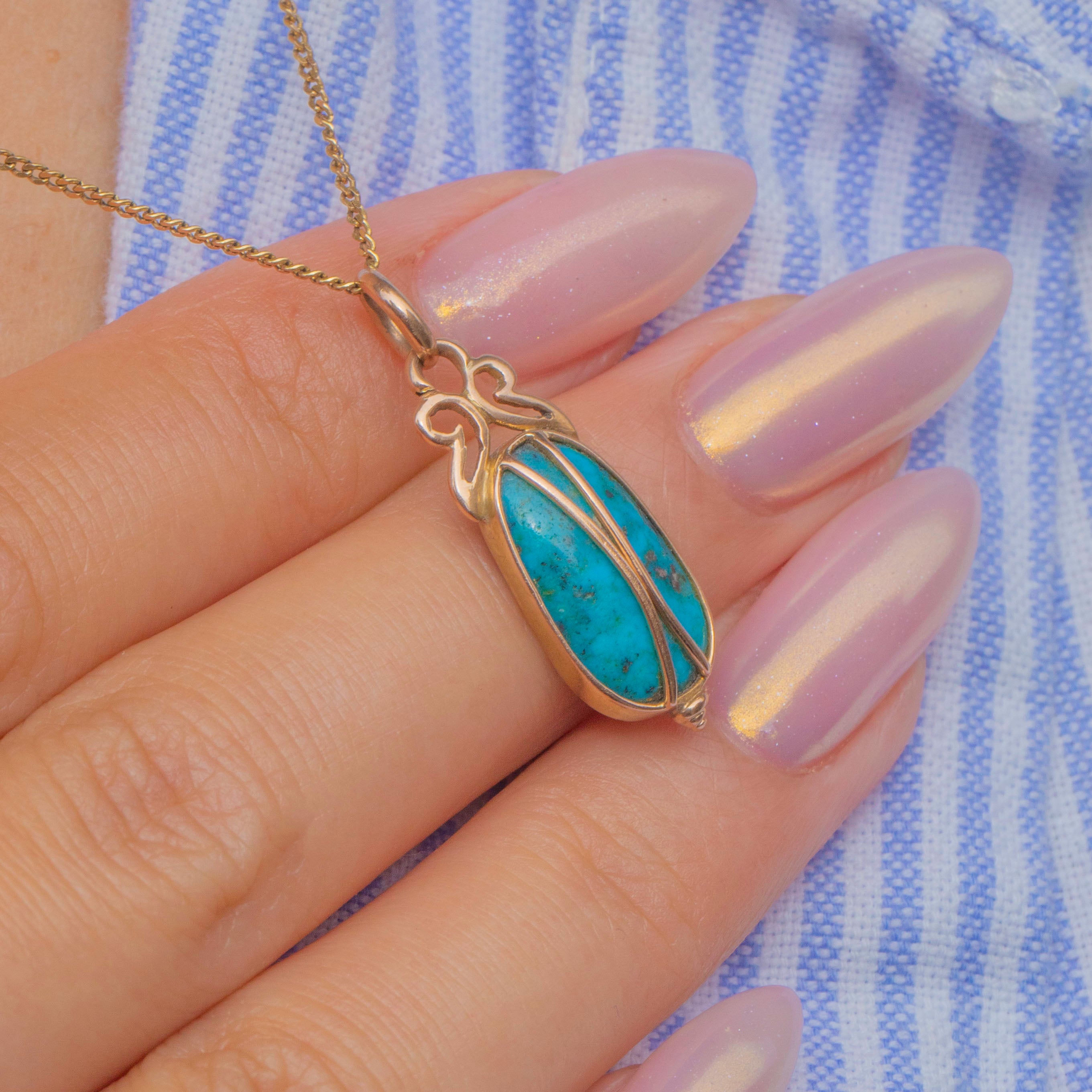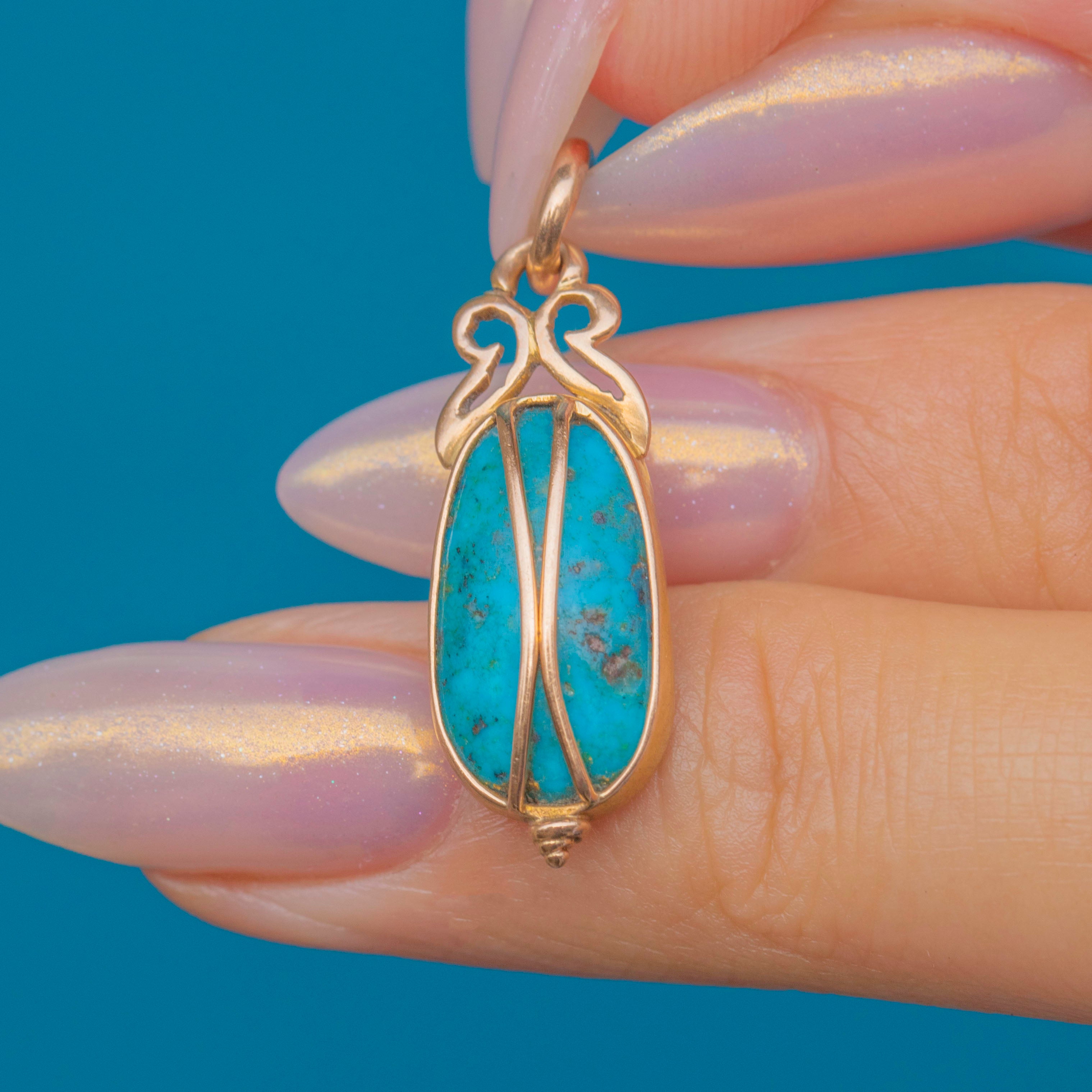 The stylish natural antique Turquoise charm is secured in a solid 15ct Gold bezel setting with two delicate bar-like elements on the outer edges, giving a subtle cage effect. An ornate bale completes the piece, reflecting the flowing, nature-inspired aesthetics of the period.