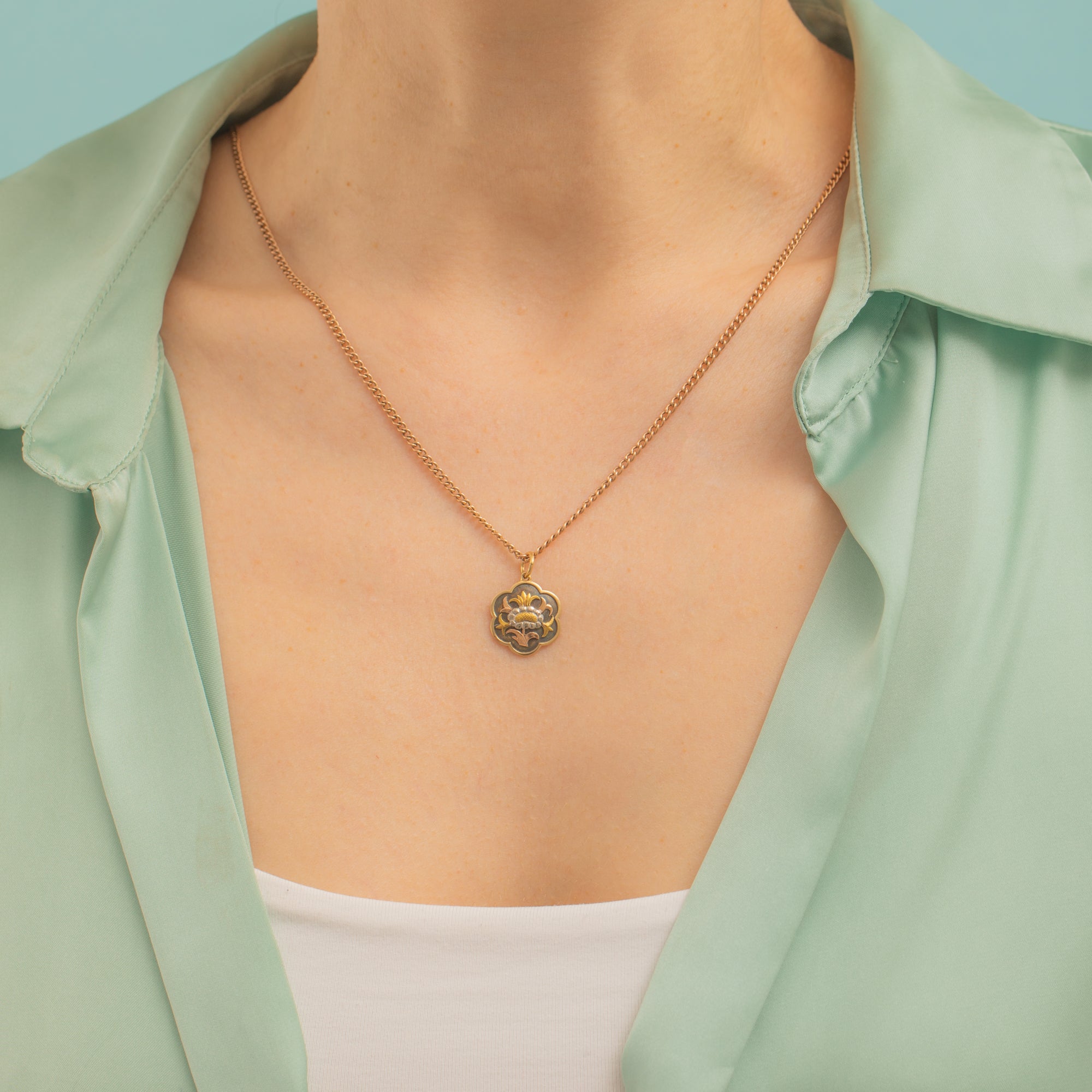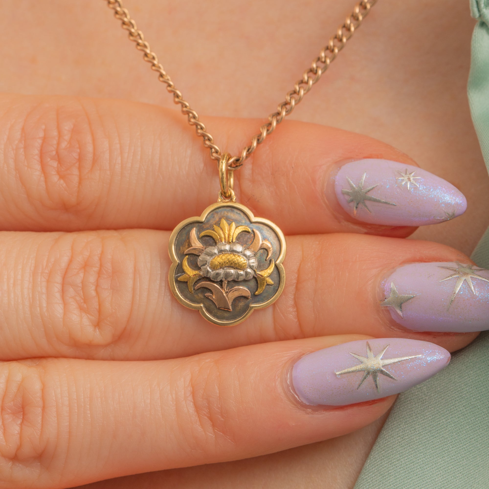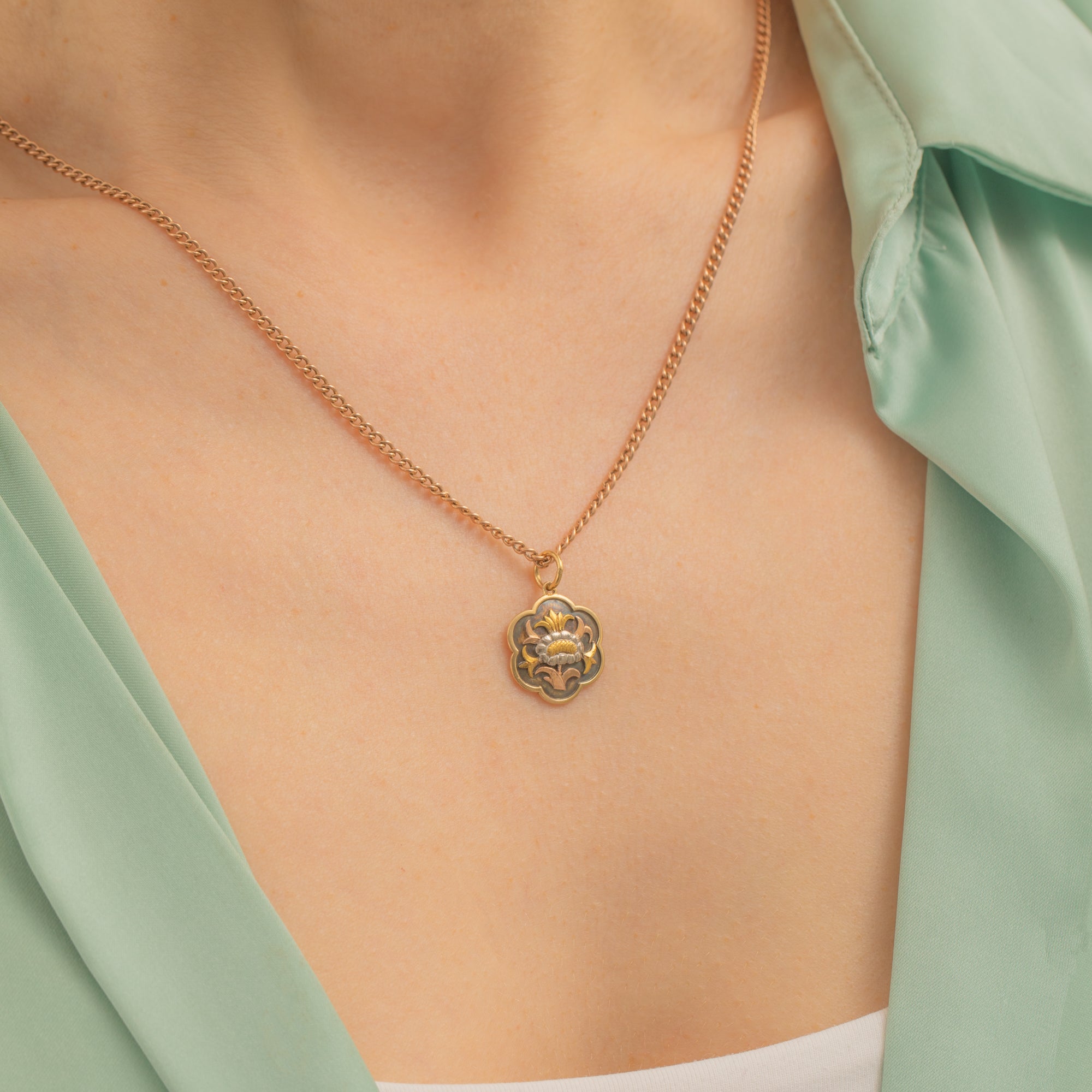 The pretty daisy motif in the centre is enhanced by white Gold petals and contrasted by a dark patina backdrop that makes the floral details pop. Lightweight and easy to wear, this antique daisy pendant is the perfect everyday accessory!