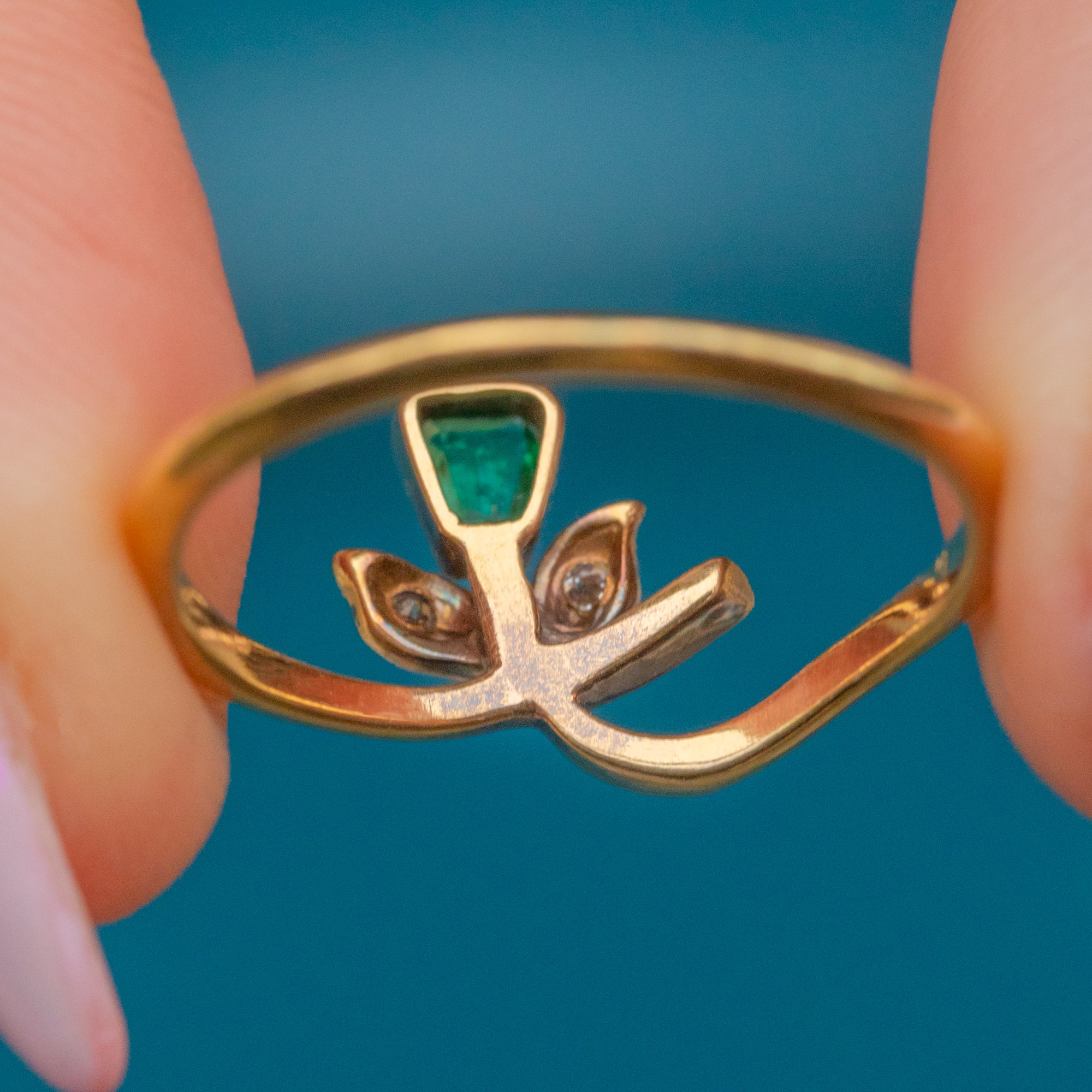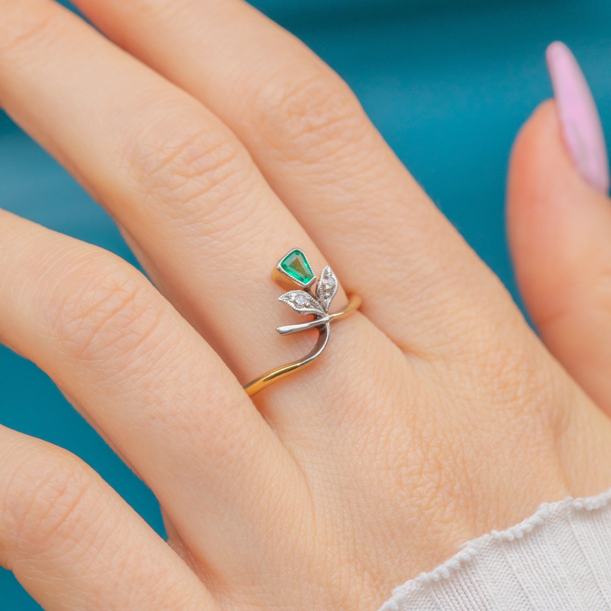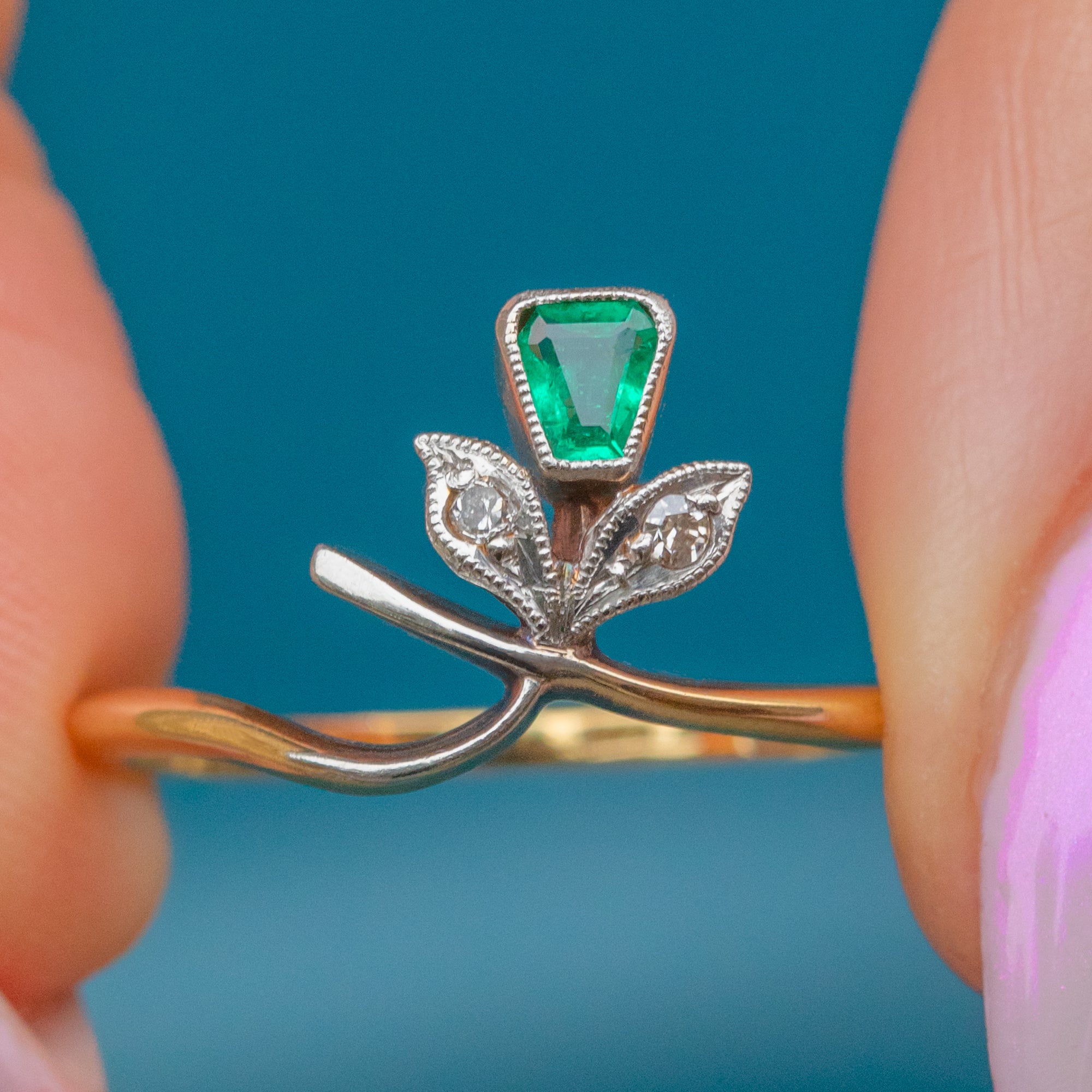 A delicate Art Nouveau ring designed as a stylised flower, set with a vivid green Emerald and twinkling rose-cut Diamonds. The asymmetric, organic lines of the petals and the flowing 18ct Gold band perfectly capture the graceful naturalism of the Art Nouveau era.
