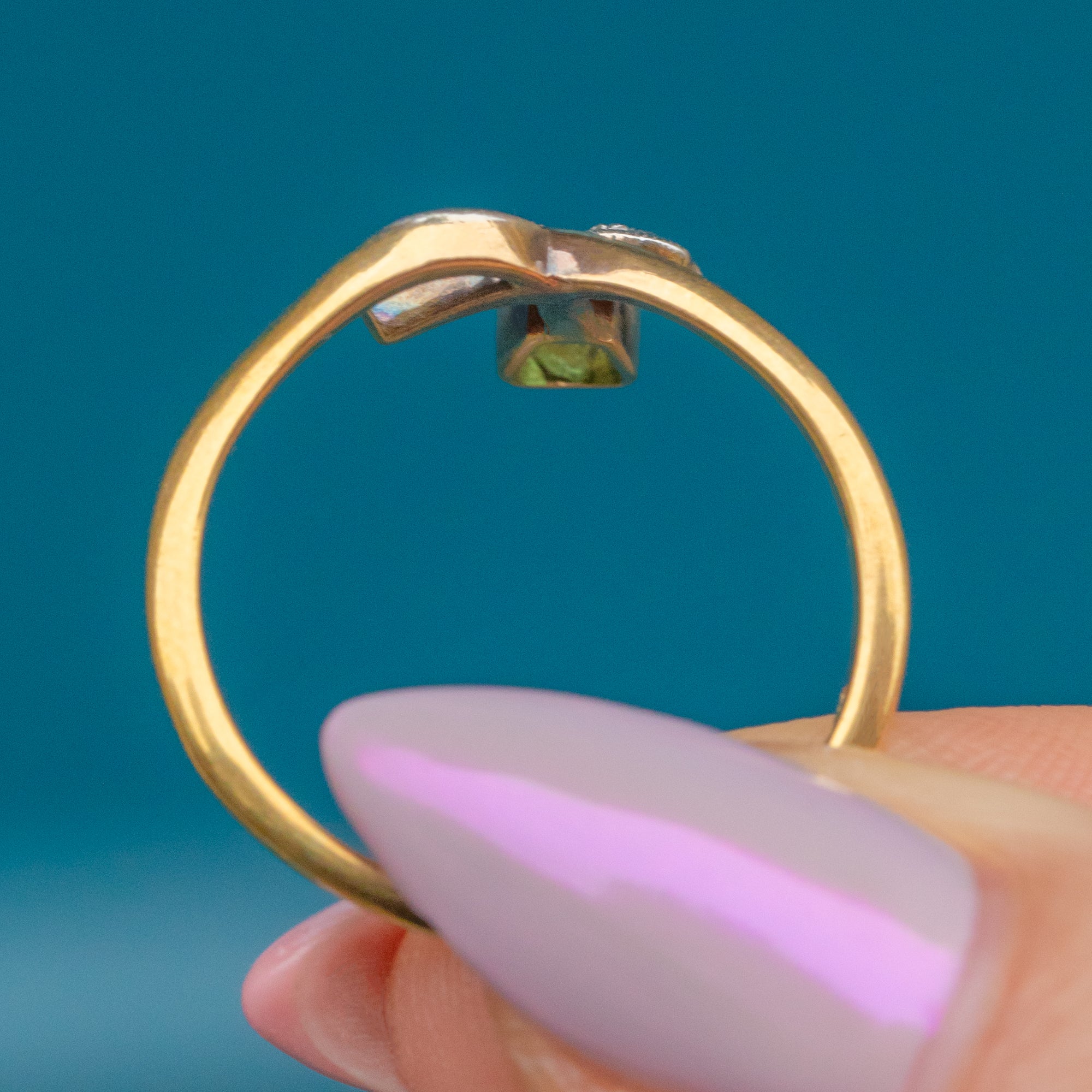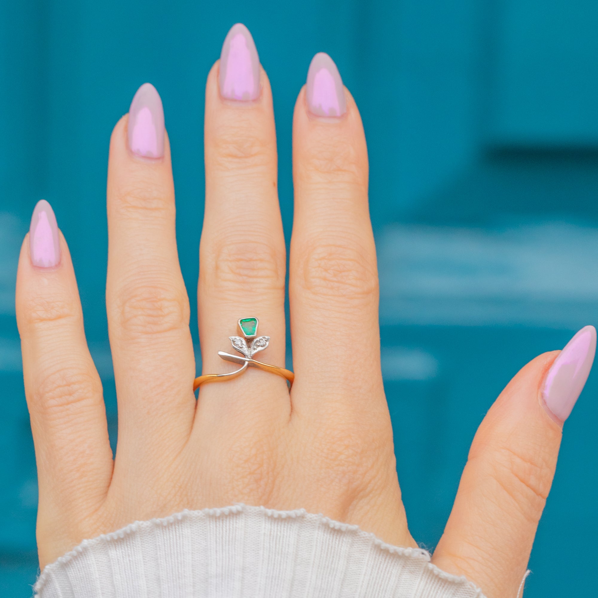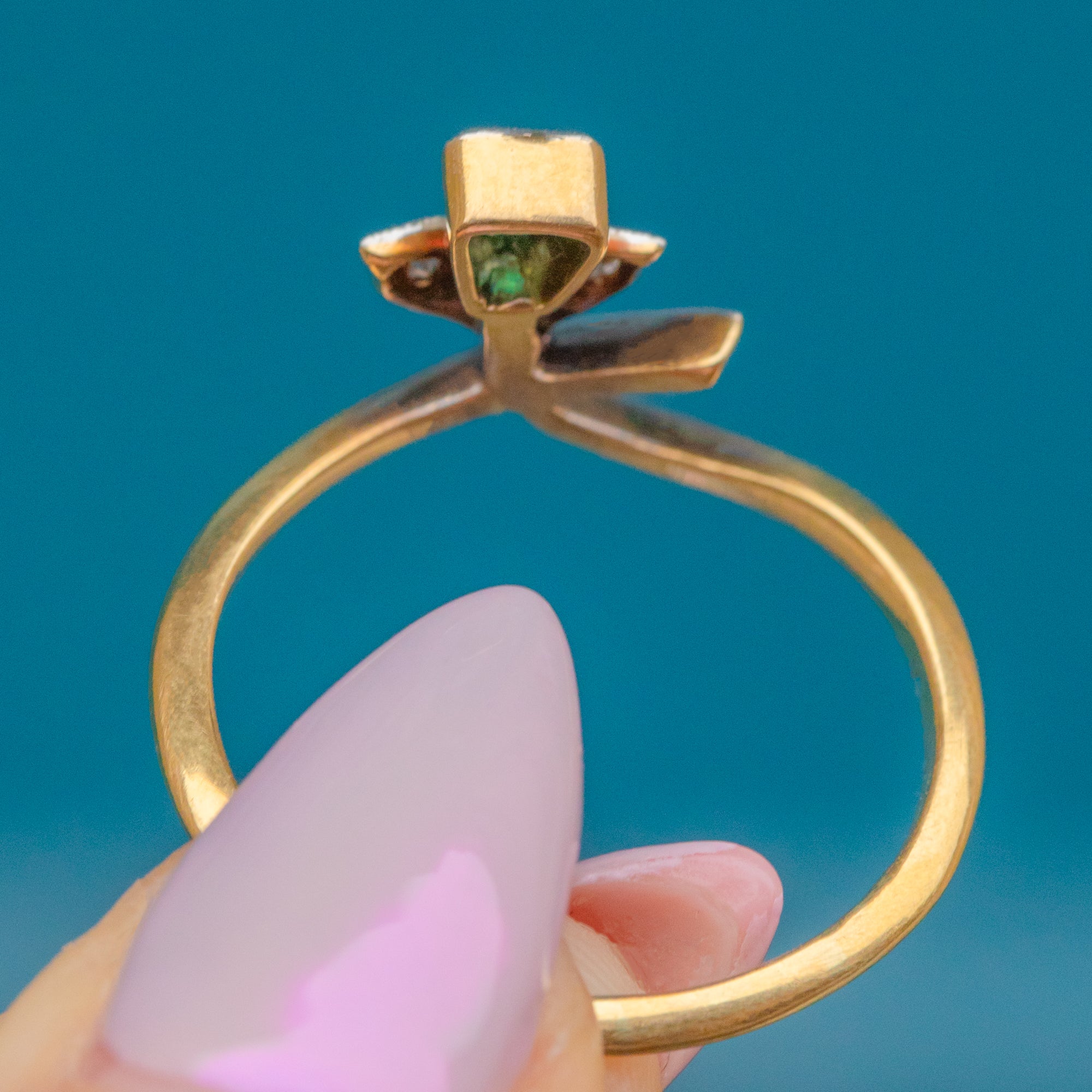 A delicate Art Nouveau ring designed as a stylised flower, set with a vivid green Emerald and twinkling rose-cut Diamonds. The asymmetric, organic lines of the petals and the flowing 18ct Gold band perfectly capture the graceful naturalism of the Art Nouveau era.