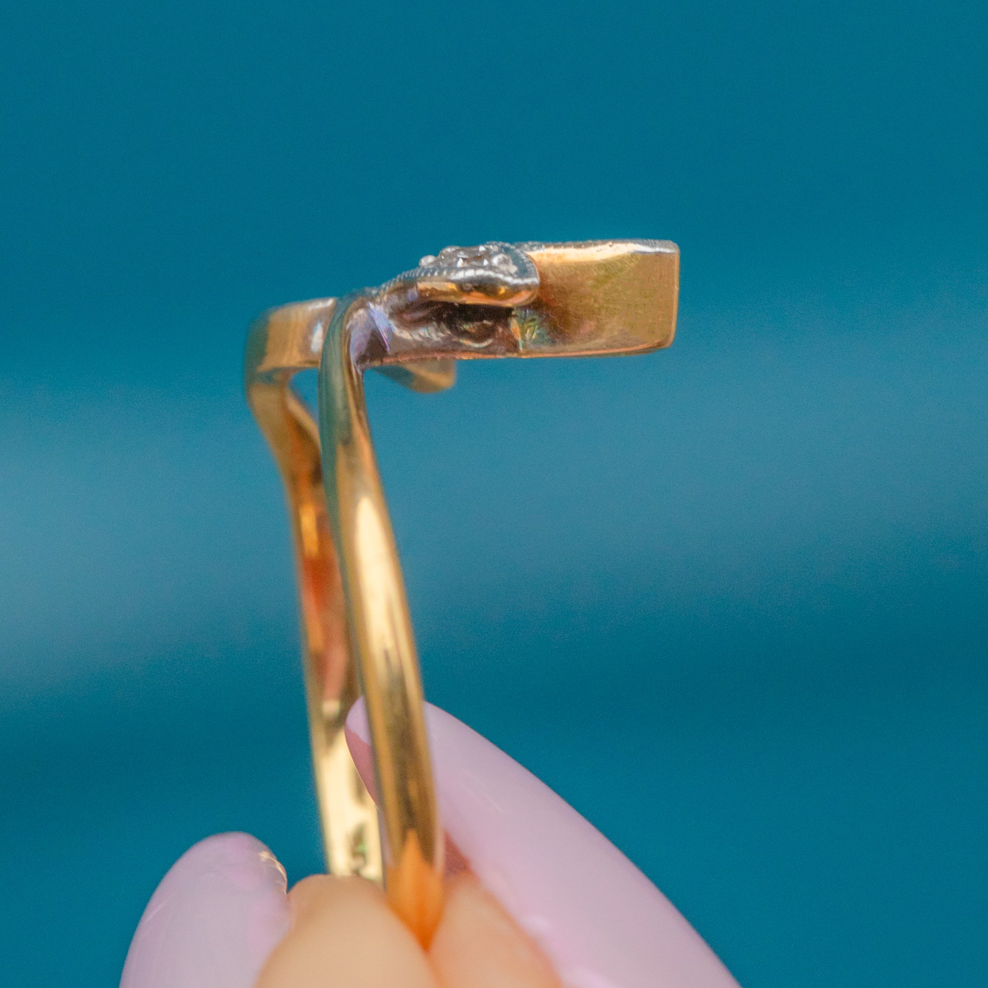 EXCELLENT: The Emerald and Diamonds are bright and securely set with no chips or abrasions. The Gold band is smooth and retains a fine polish. A superbly preserved Art Nouveau design full of grace and detail.