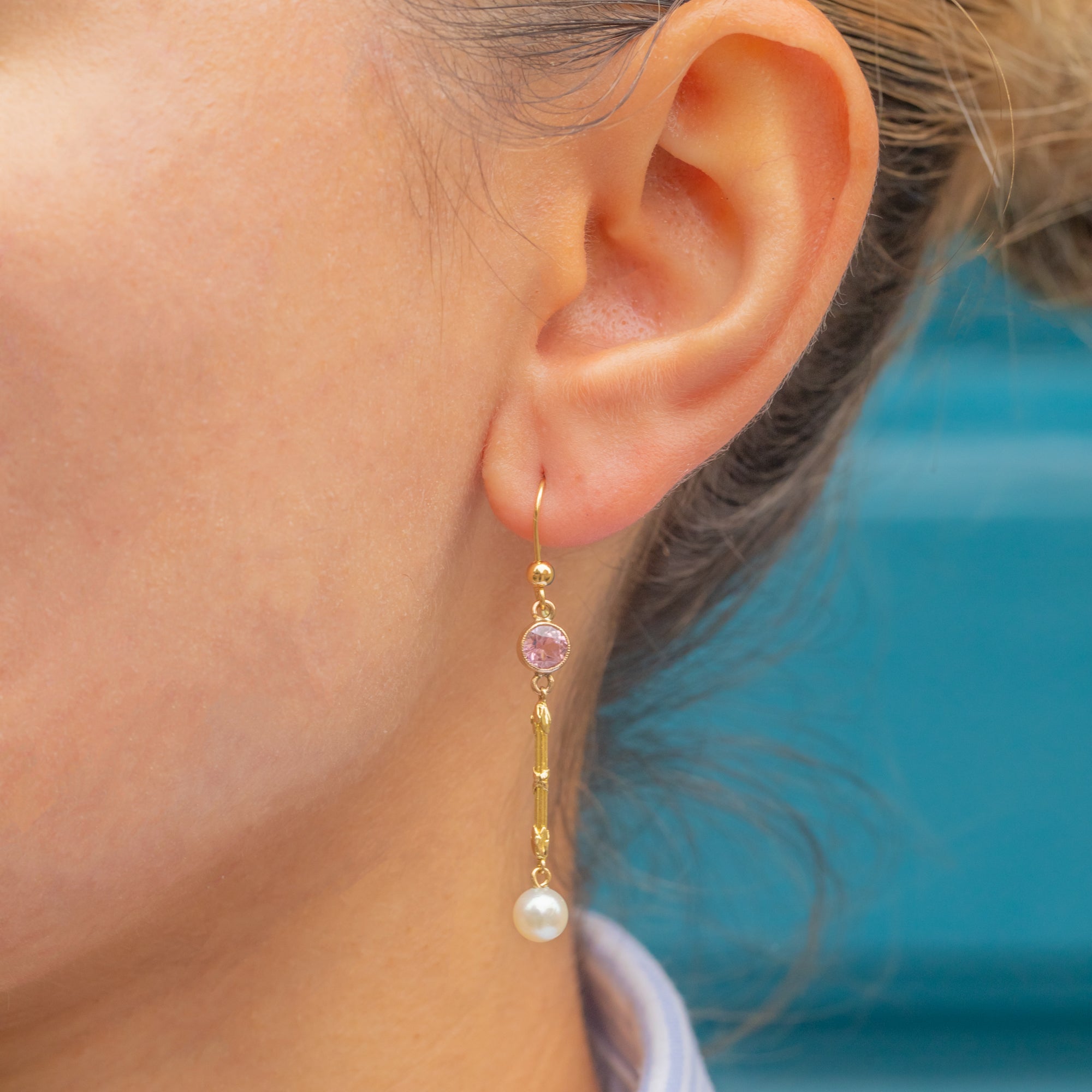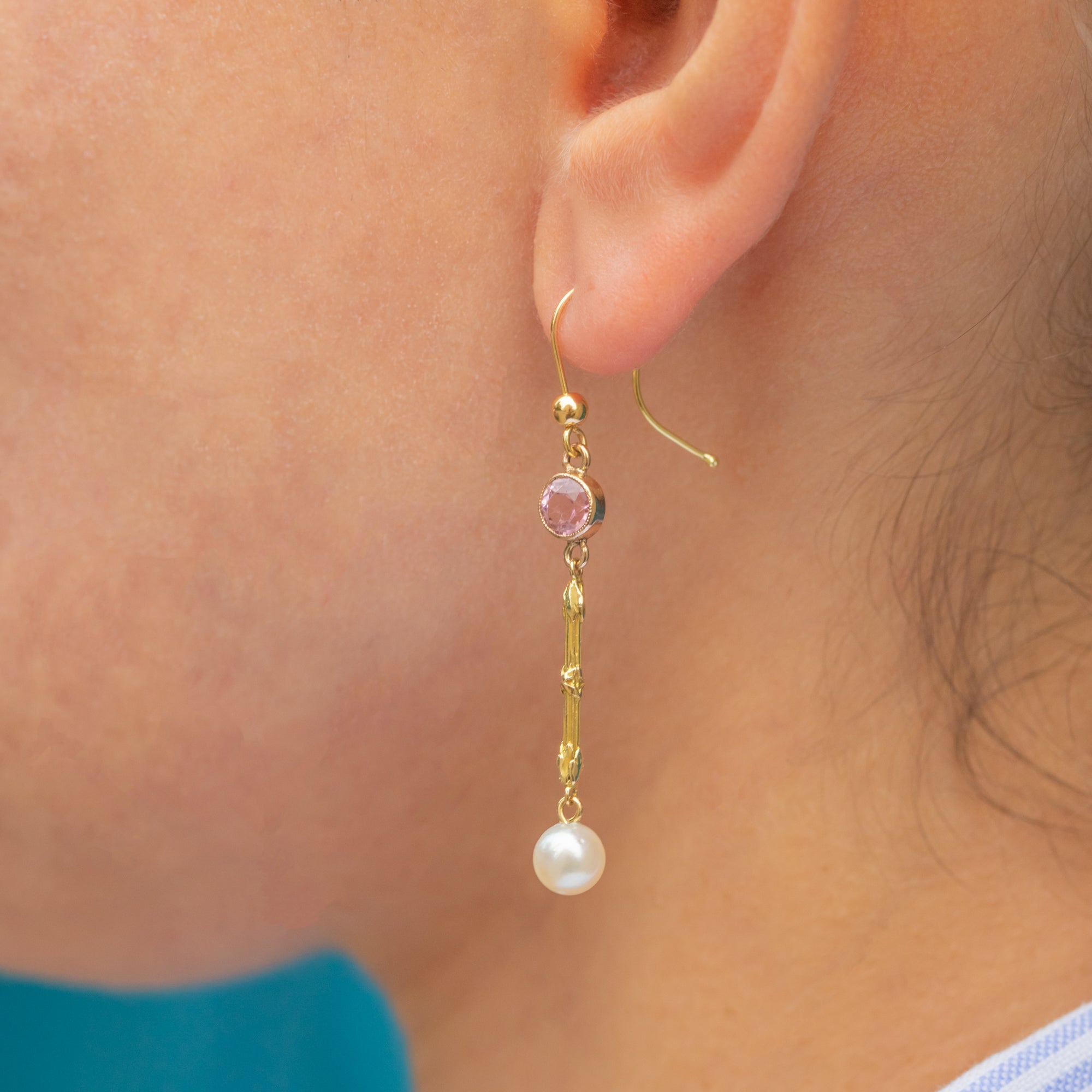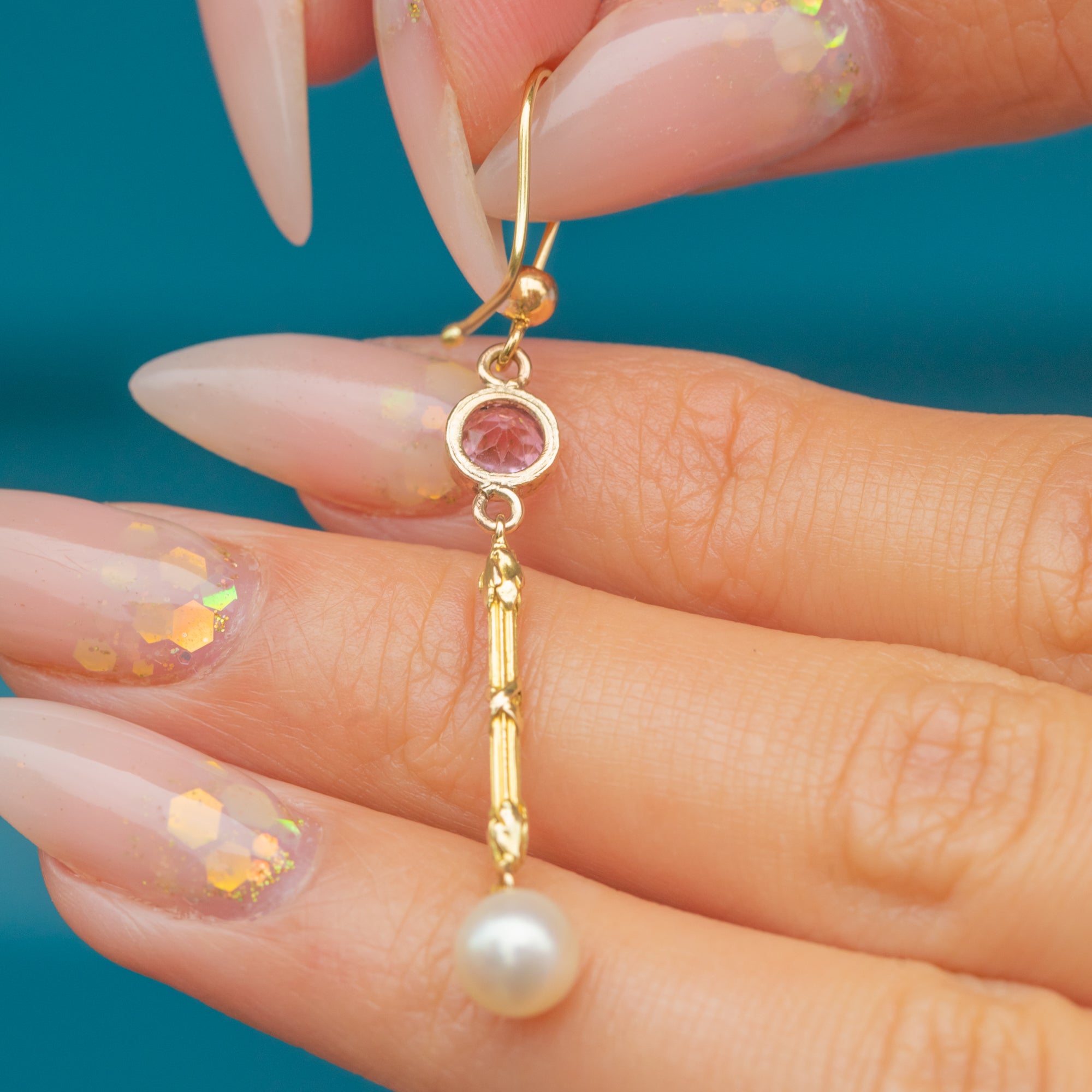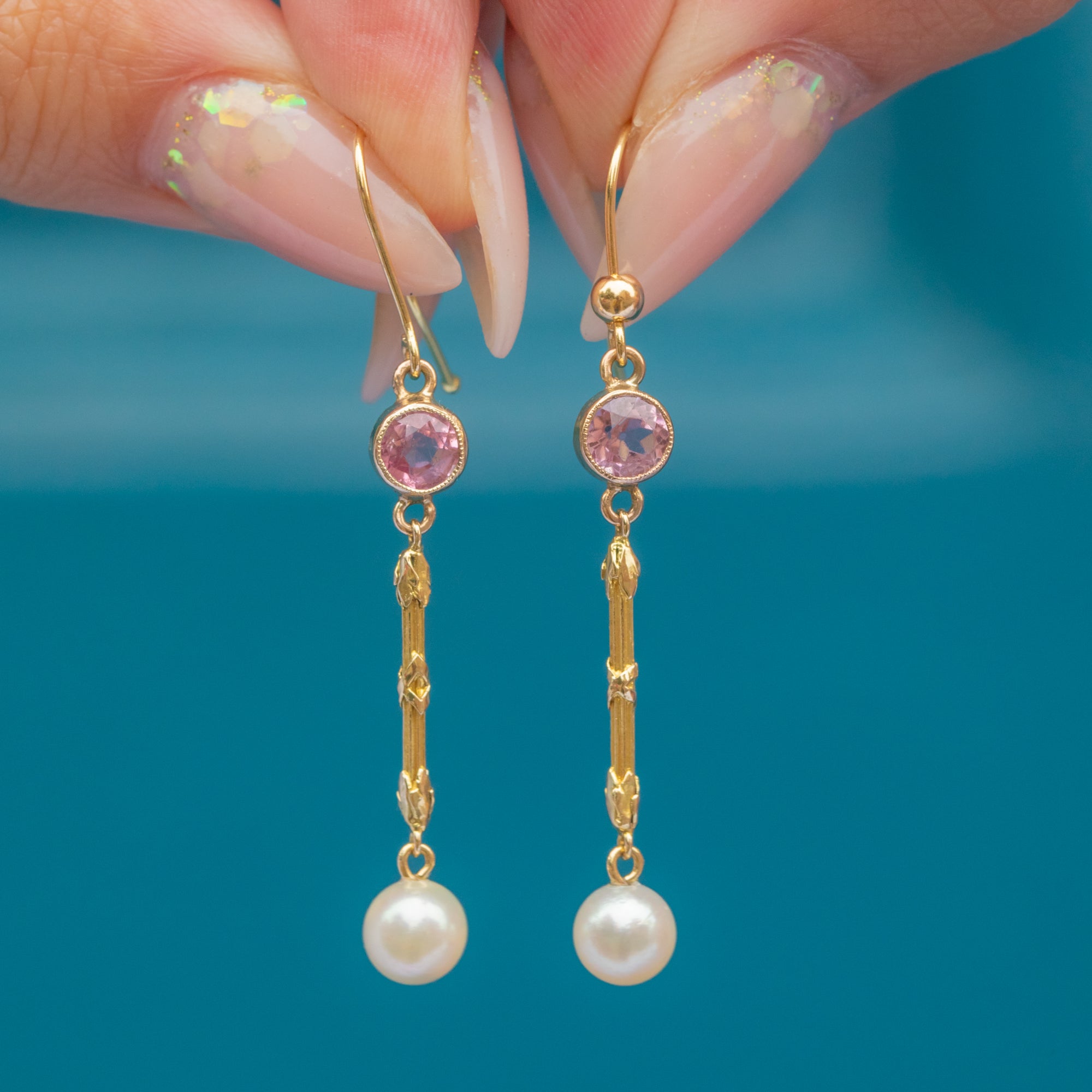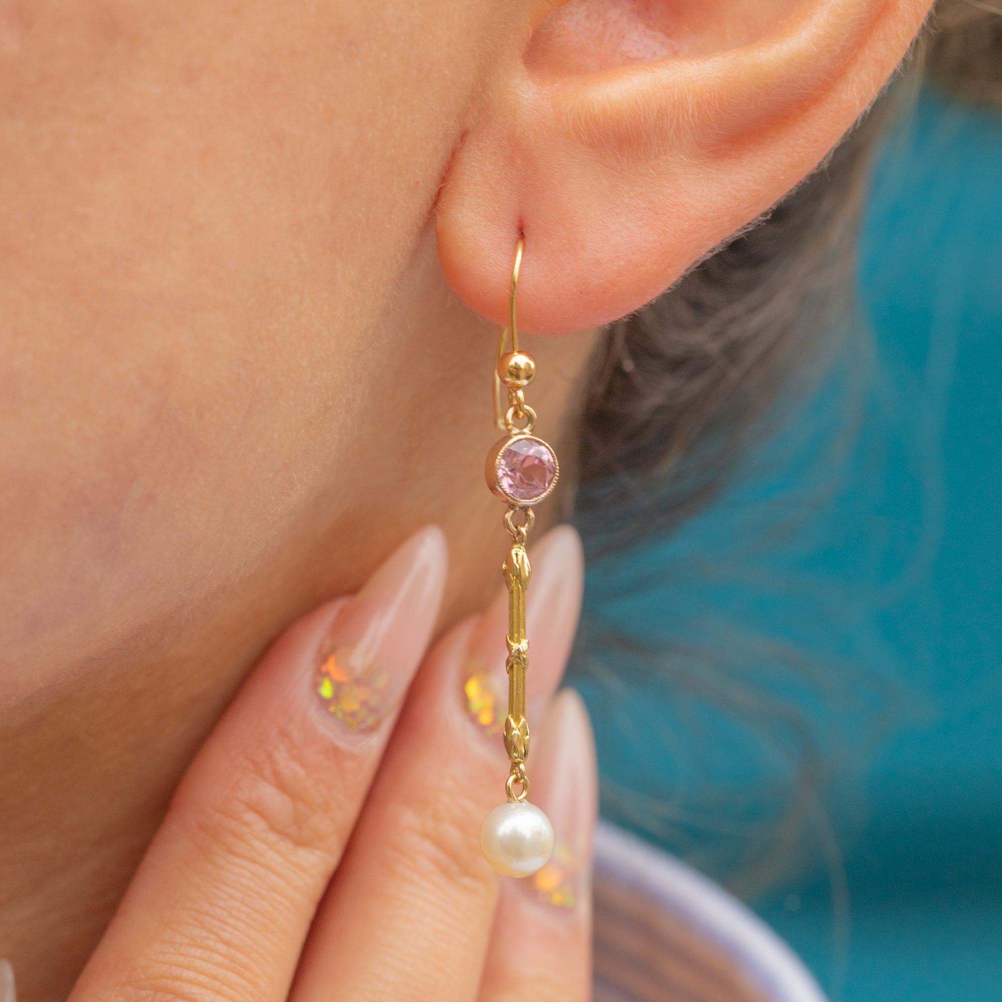 The combination of glowing Pearls and pink gemstones creates a delicate yet striking contrast, while their long drop form adds movement and sophistication. A beautiful pair of antique earrings, perfect for those who love refined and romantic jewellery.