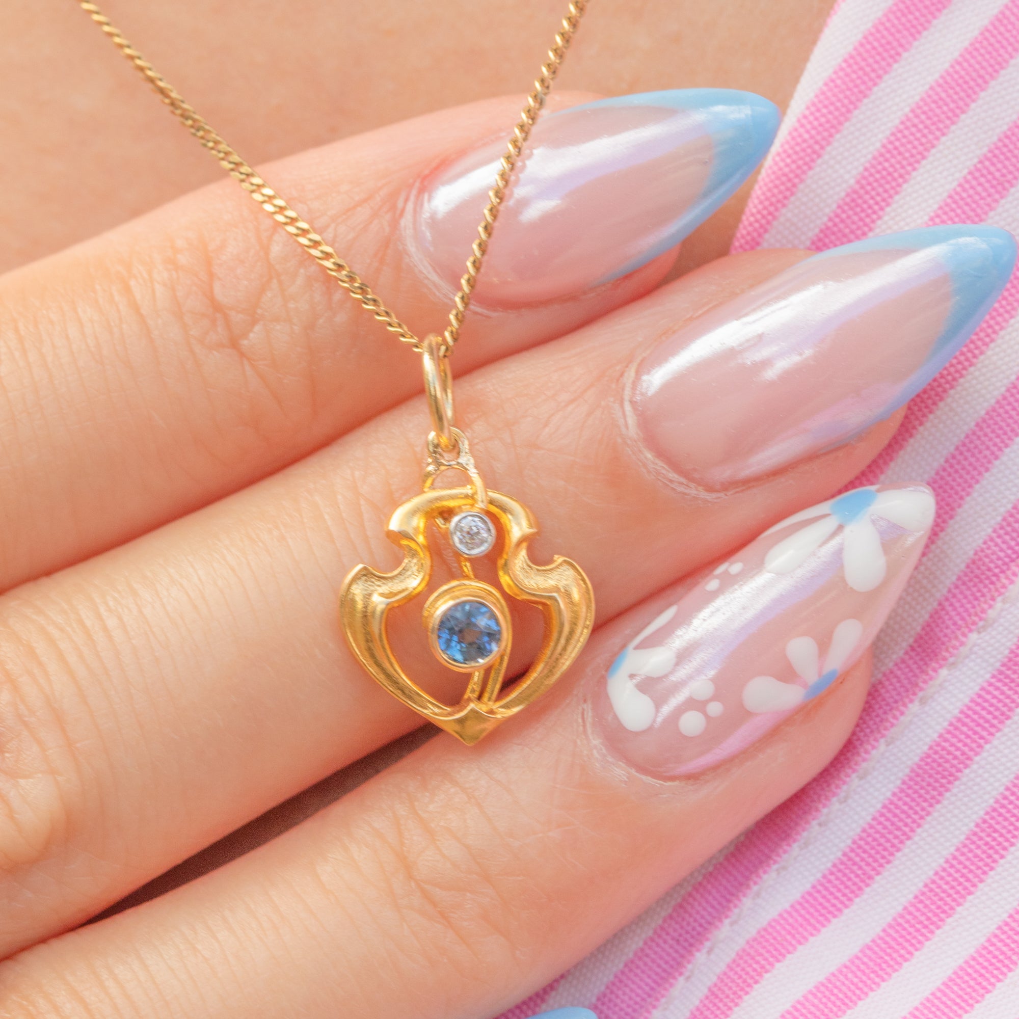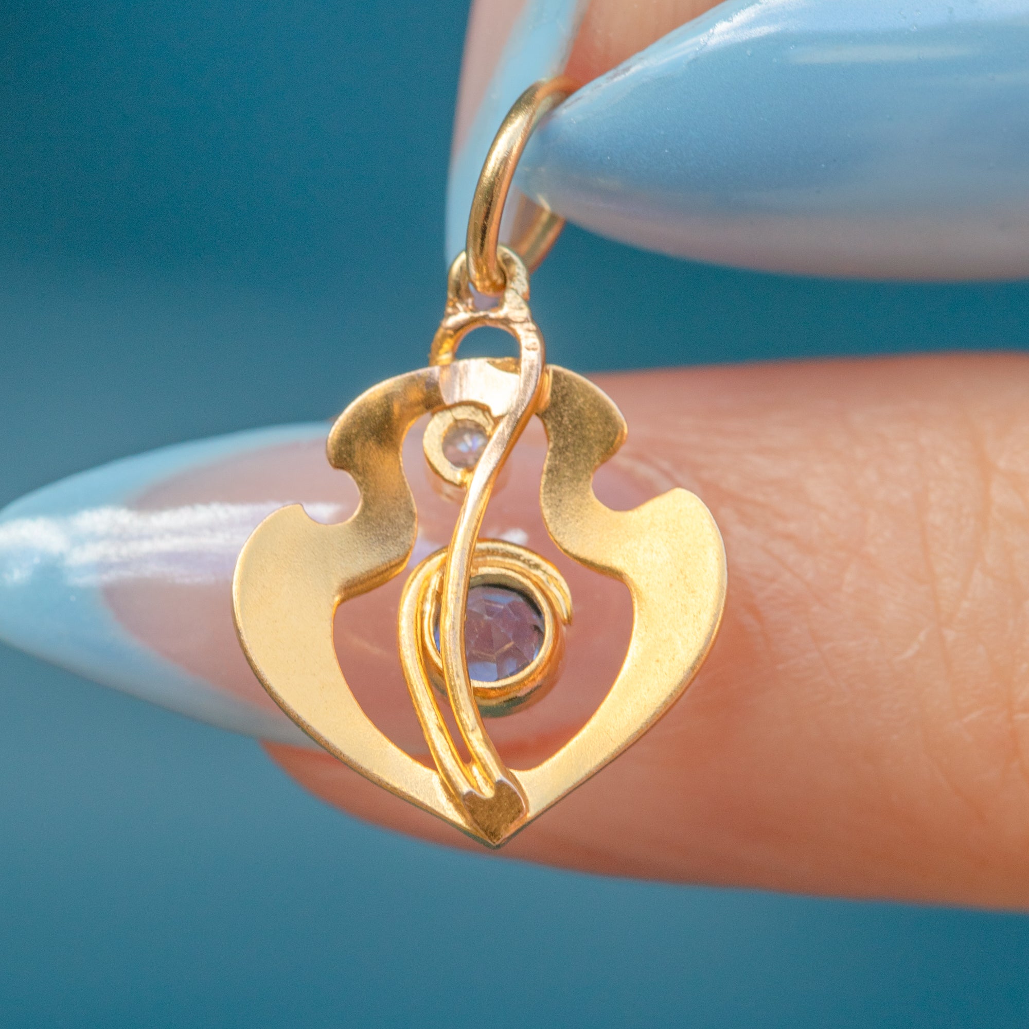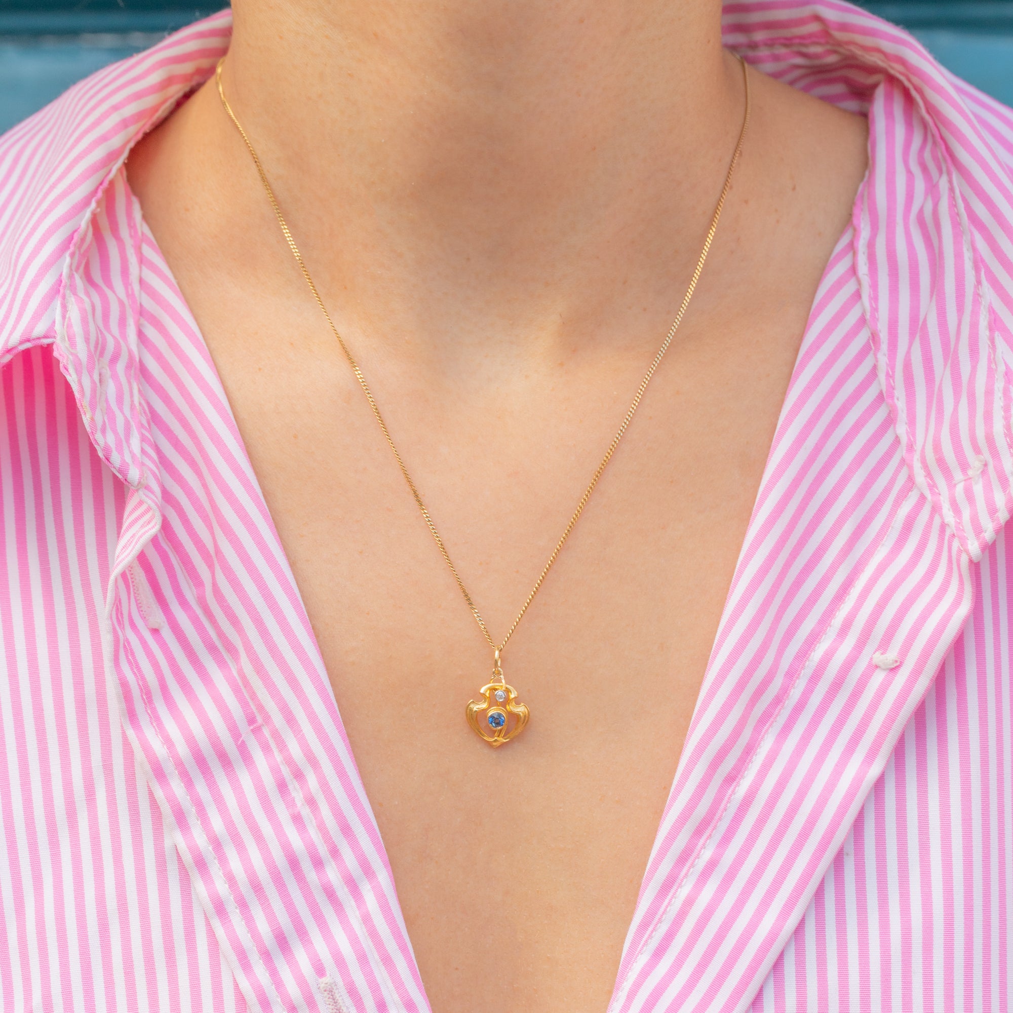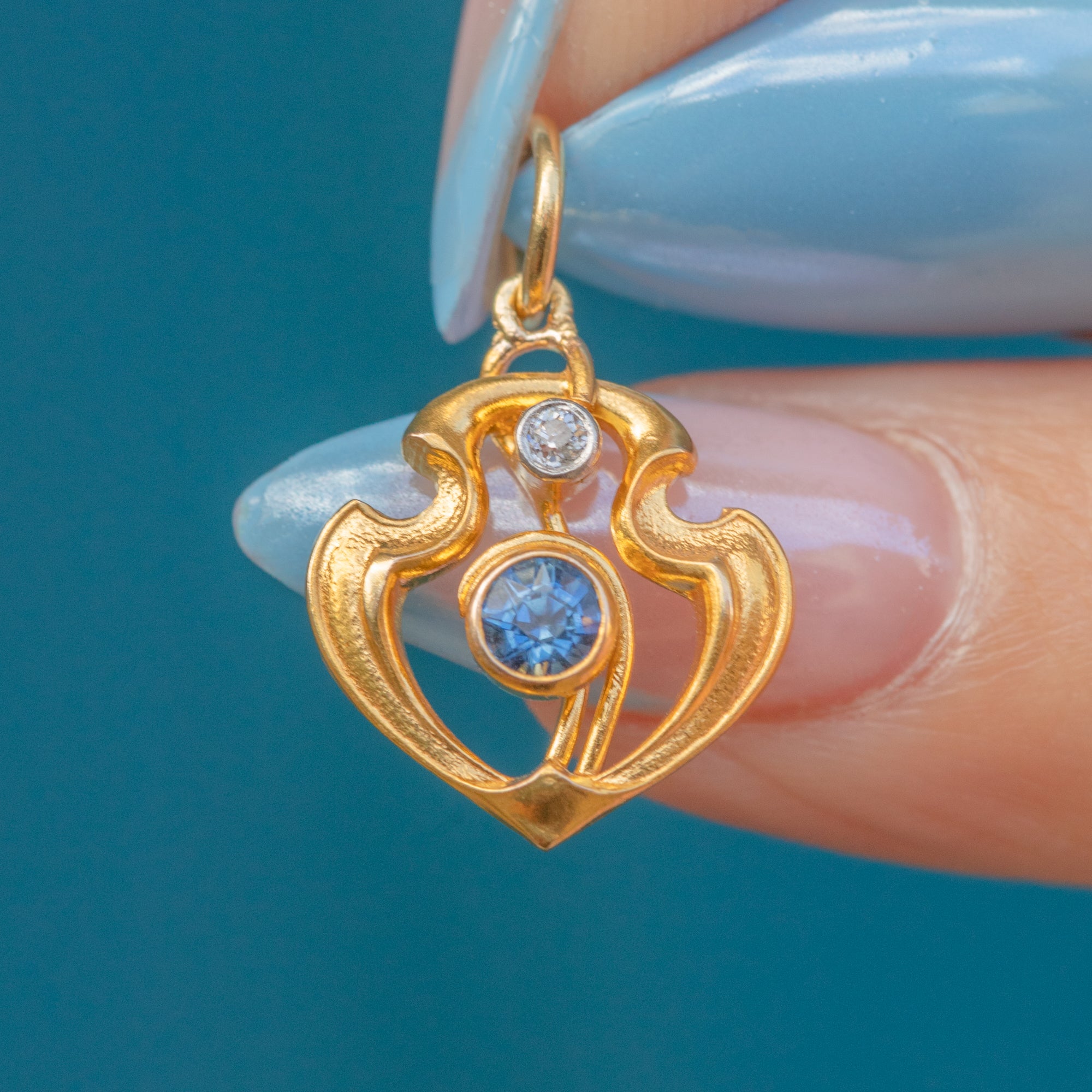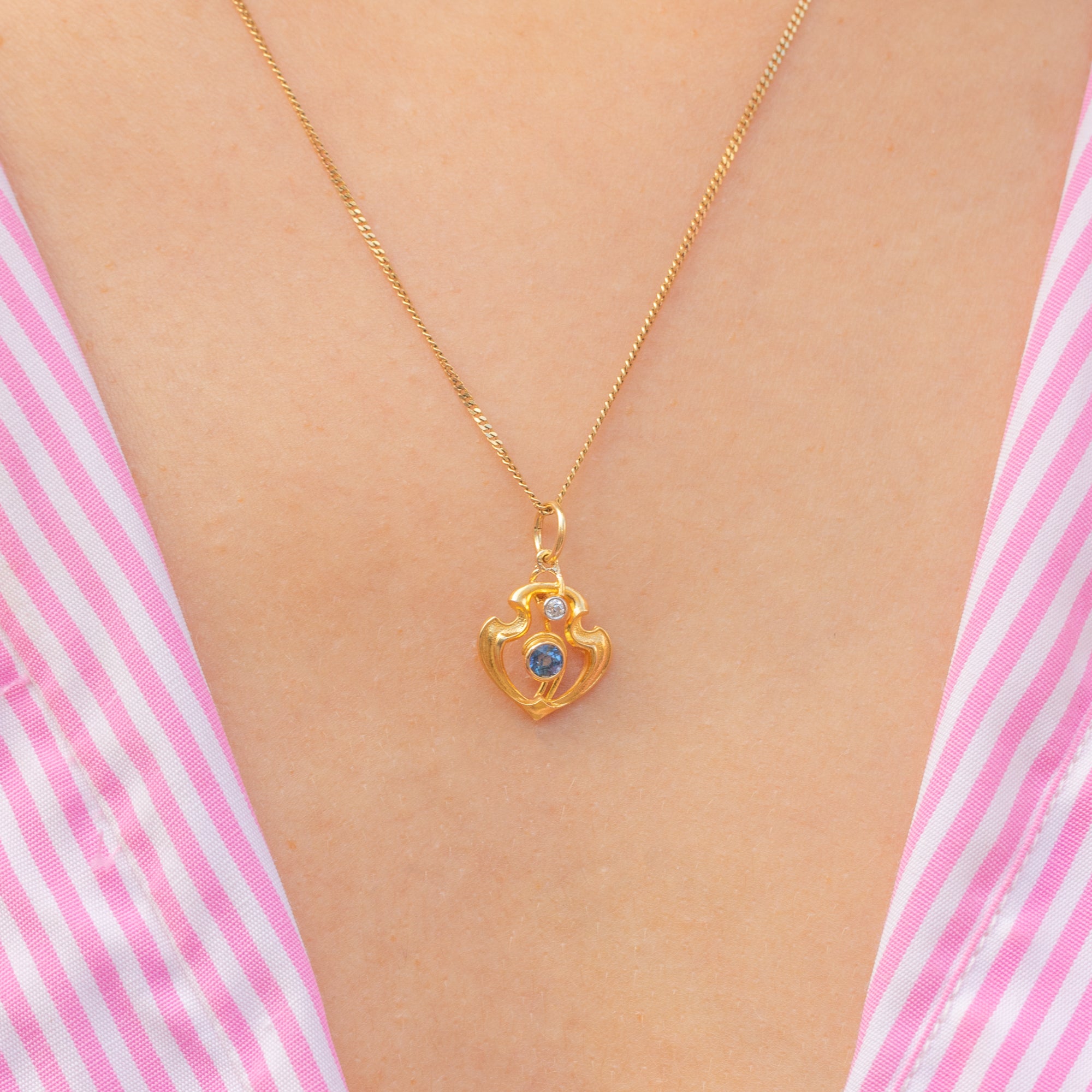 This Art Nouveau pendant is the perfect little jewel! Classically Nouveau in design, this antique charm is inlaid with a vivid blue Sapphire and scintillating Diamond framed by sweeping curvaceous lines crafted from sumptuous 18ct Gold.
