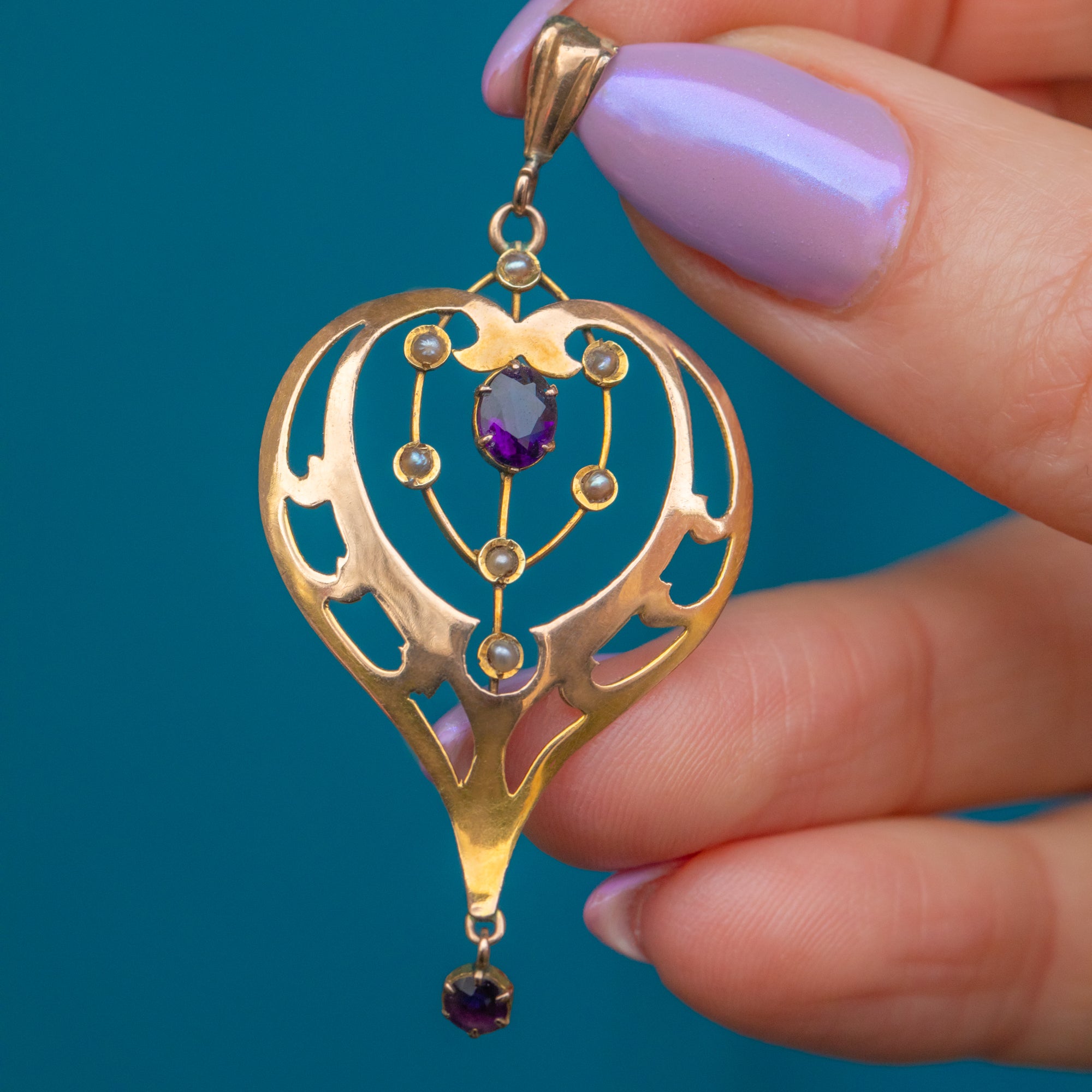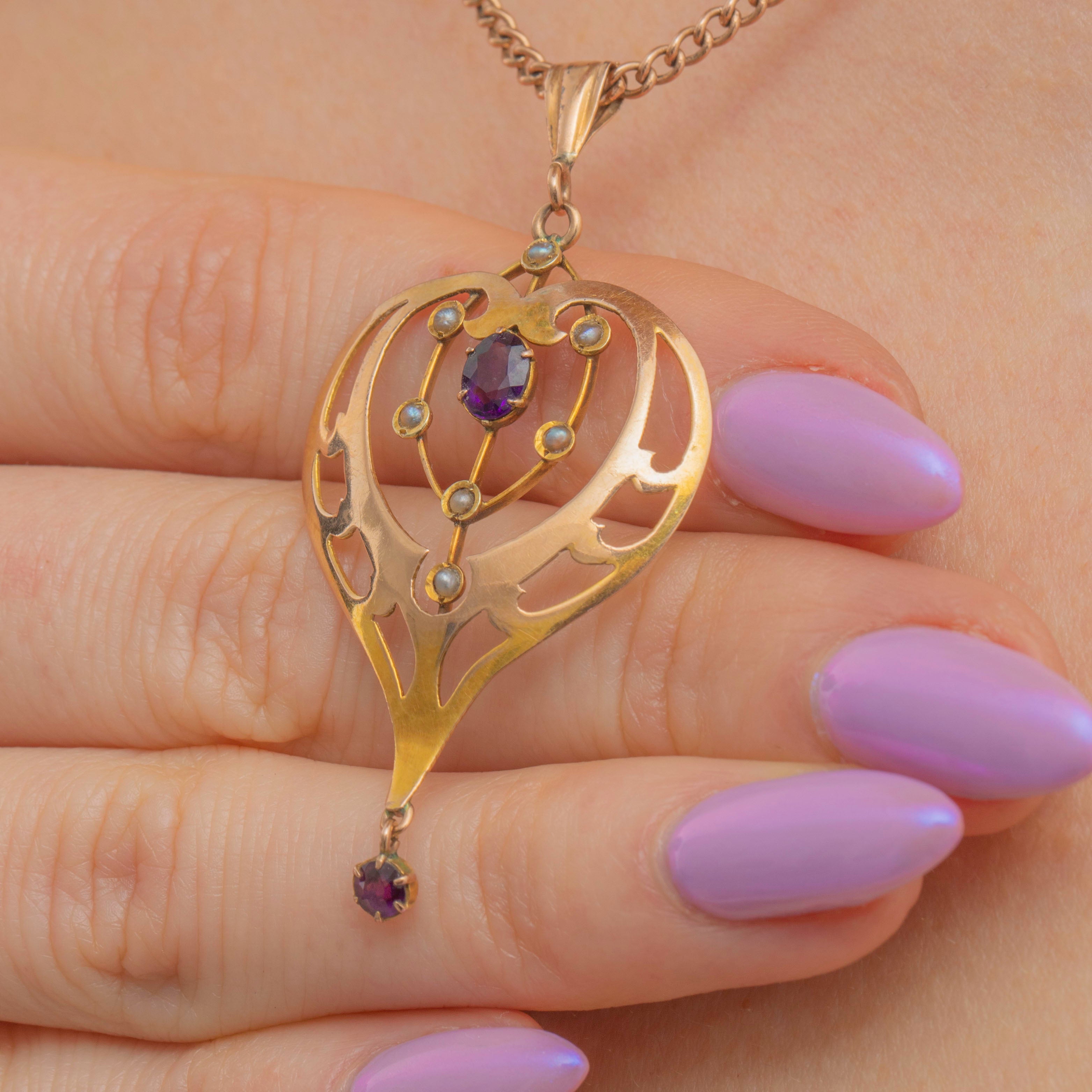 Fall in love with the timeless beauty of this Art Nouveau 9ct Gold Amethyst Pearl Lavalier pendant!