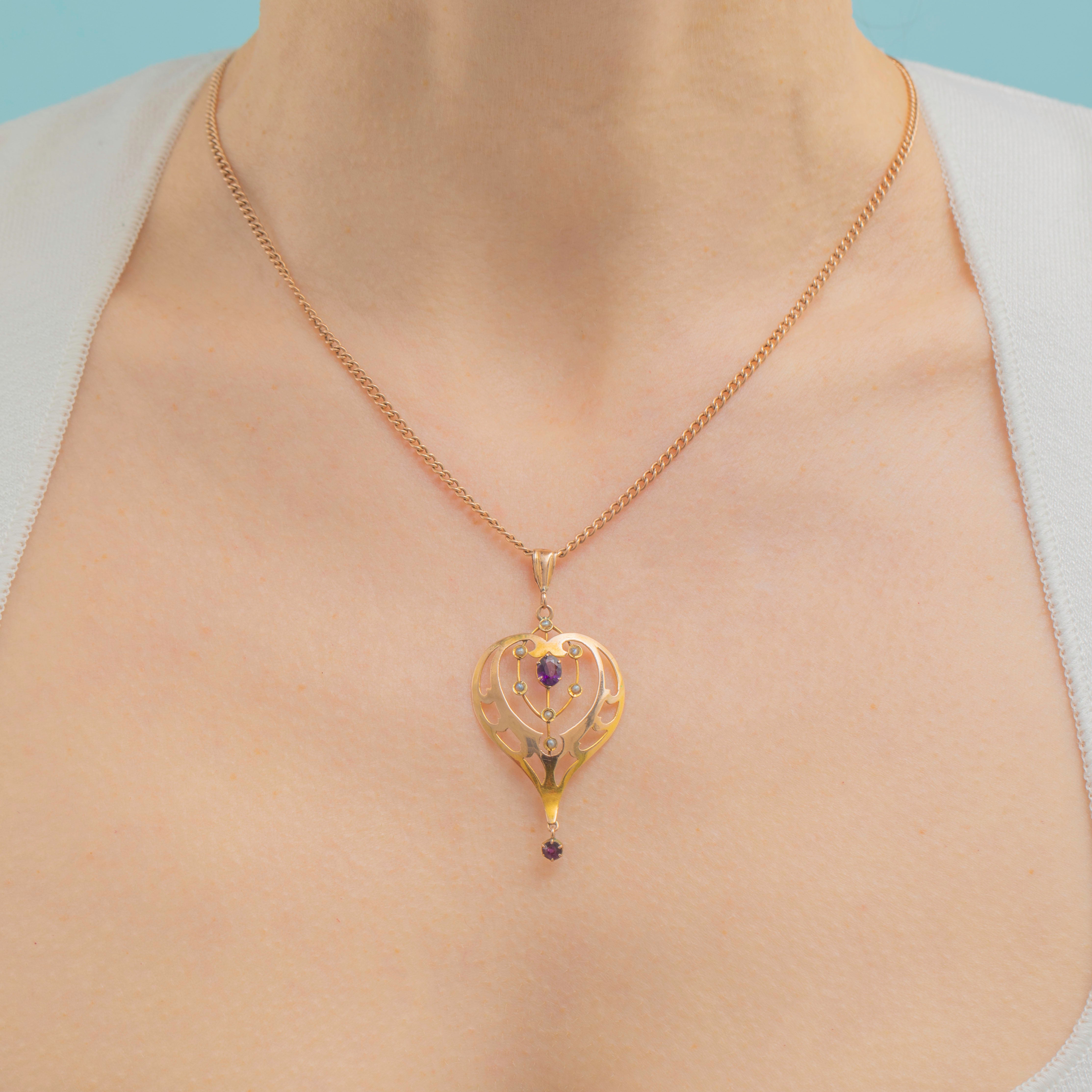 Made from solid 9ct Gold, this Art Nouveau pendant takes the form of a heart, with its curvaceous and sweeping lines inlaid with Amethysts and Pearls for a feminine finish. This striking piece is quintessentially Art Nouveau in every way, she will instantly add a romantic flourish to your outfit!
