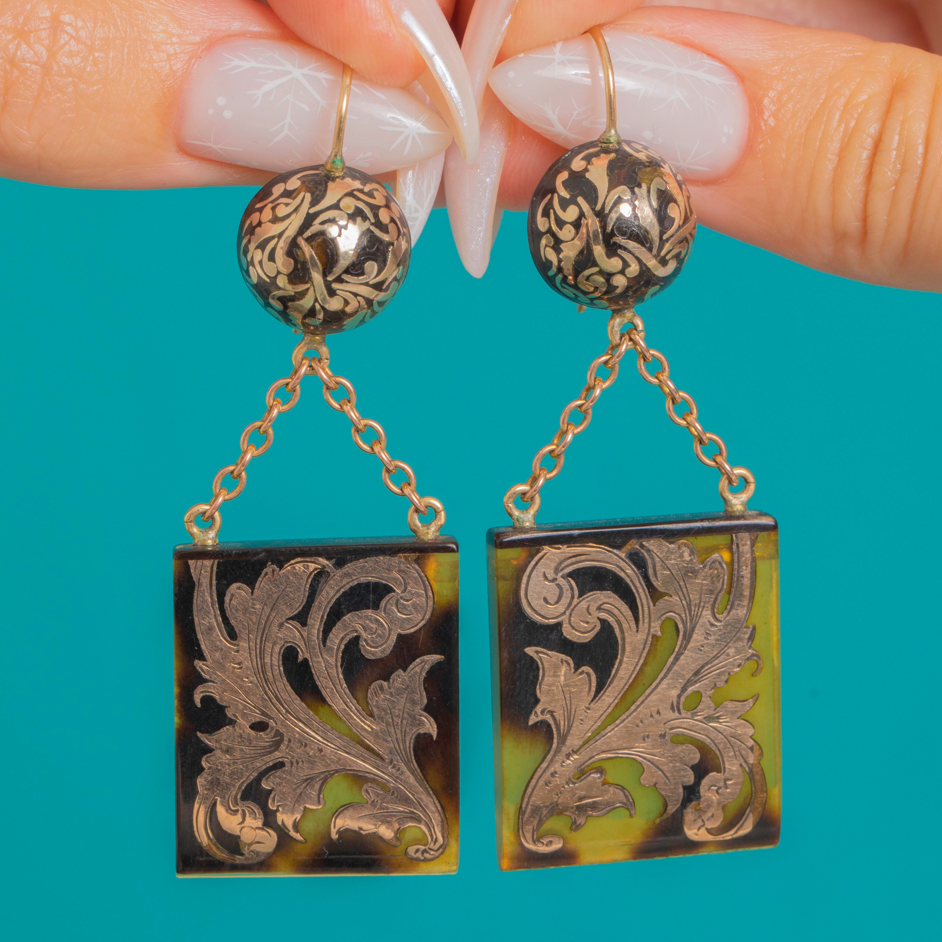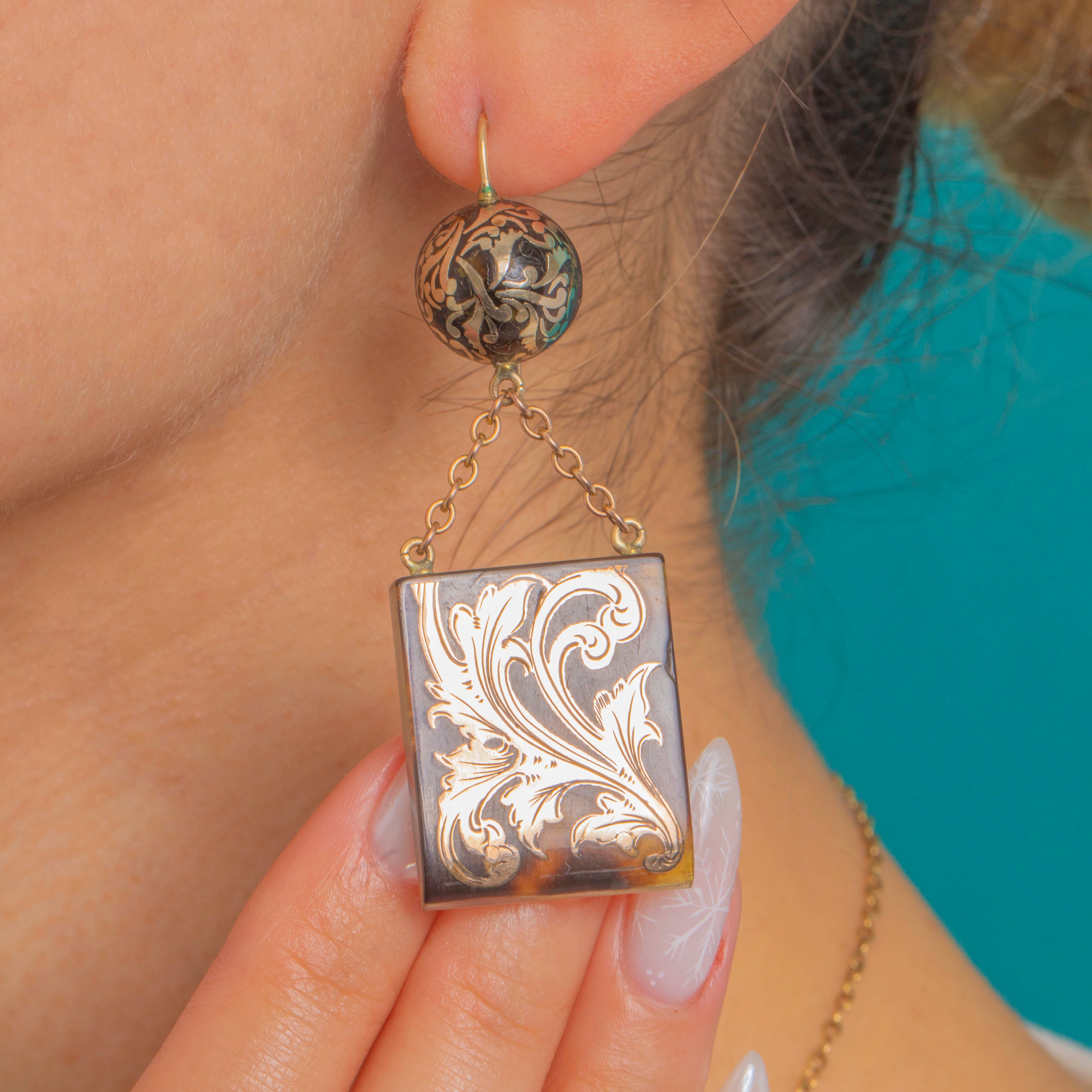 A striking pair of Art Nouveau Piqué drop earrings, alive with sinuous foliate scrolls in shimmering Gold set against a deep, glossy ground. Each earring is crowned by a decorated bead and finishes in an ornate rectangular panel, articulated by short twin chains for beautiful movement and drama on the ear.